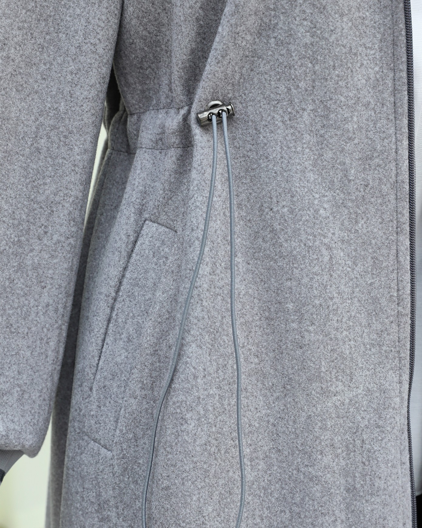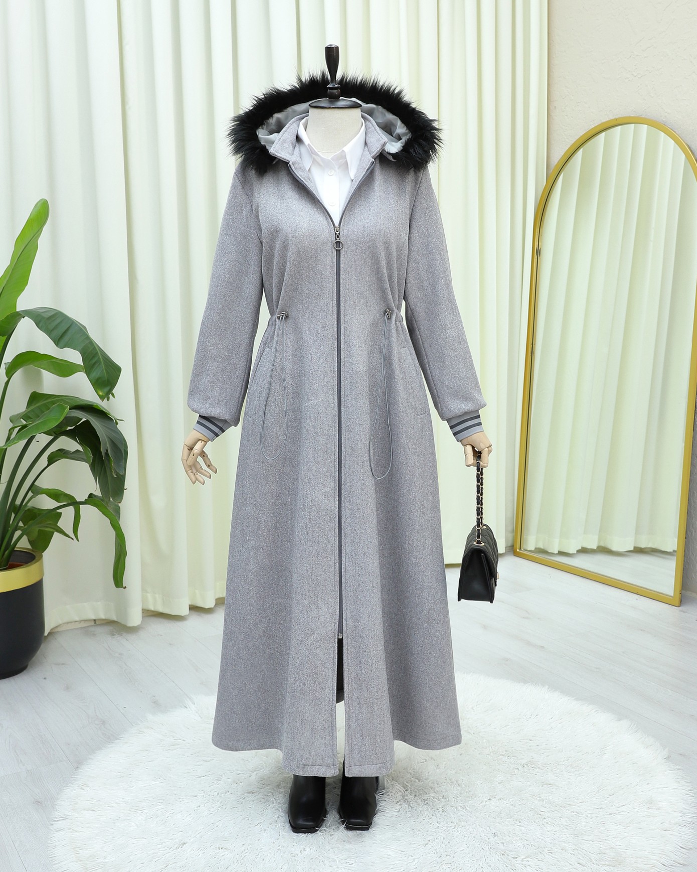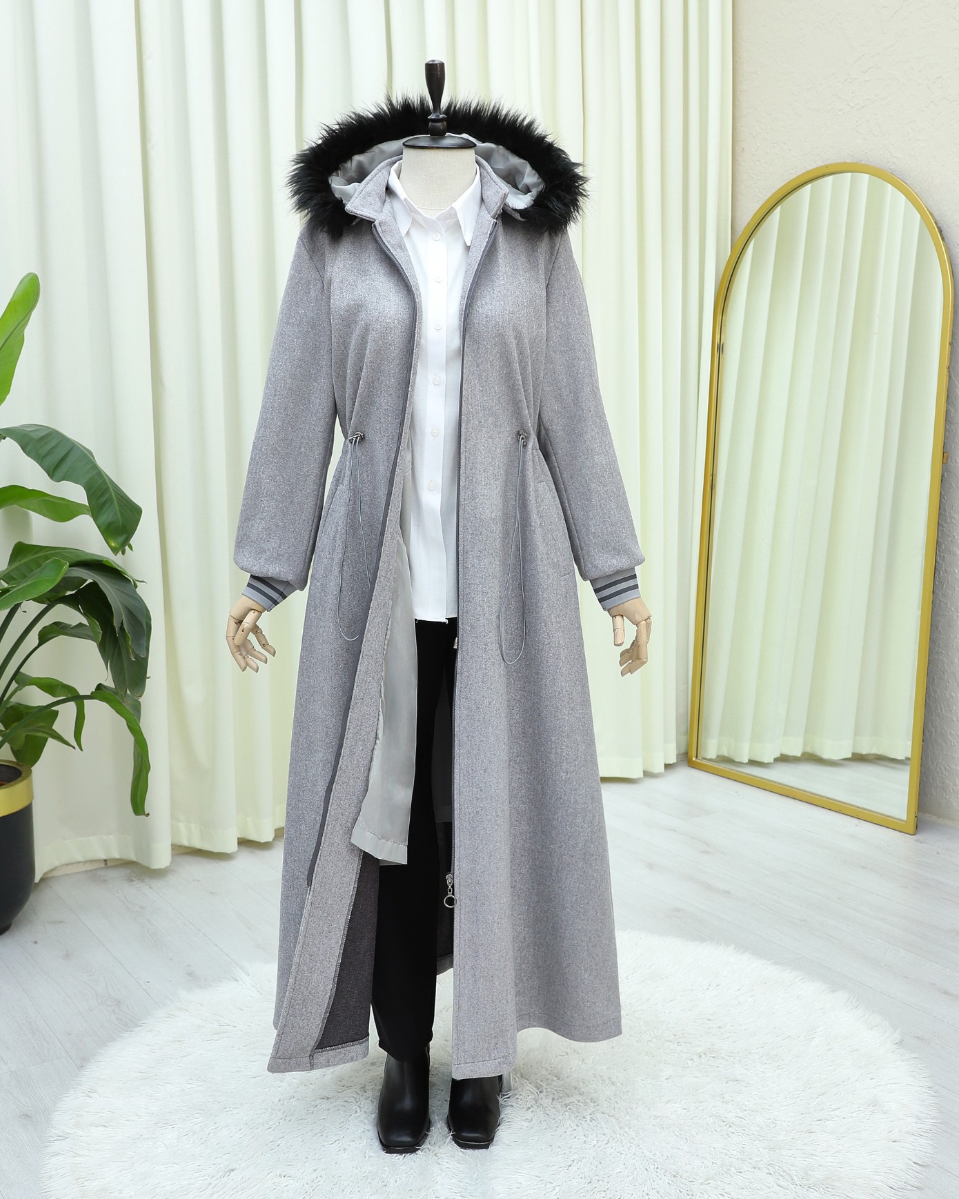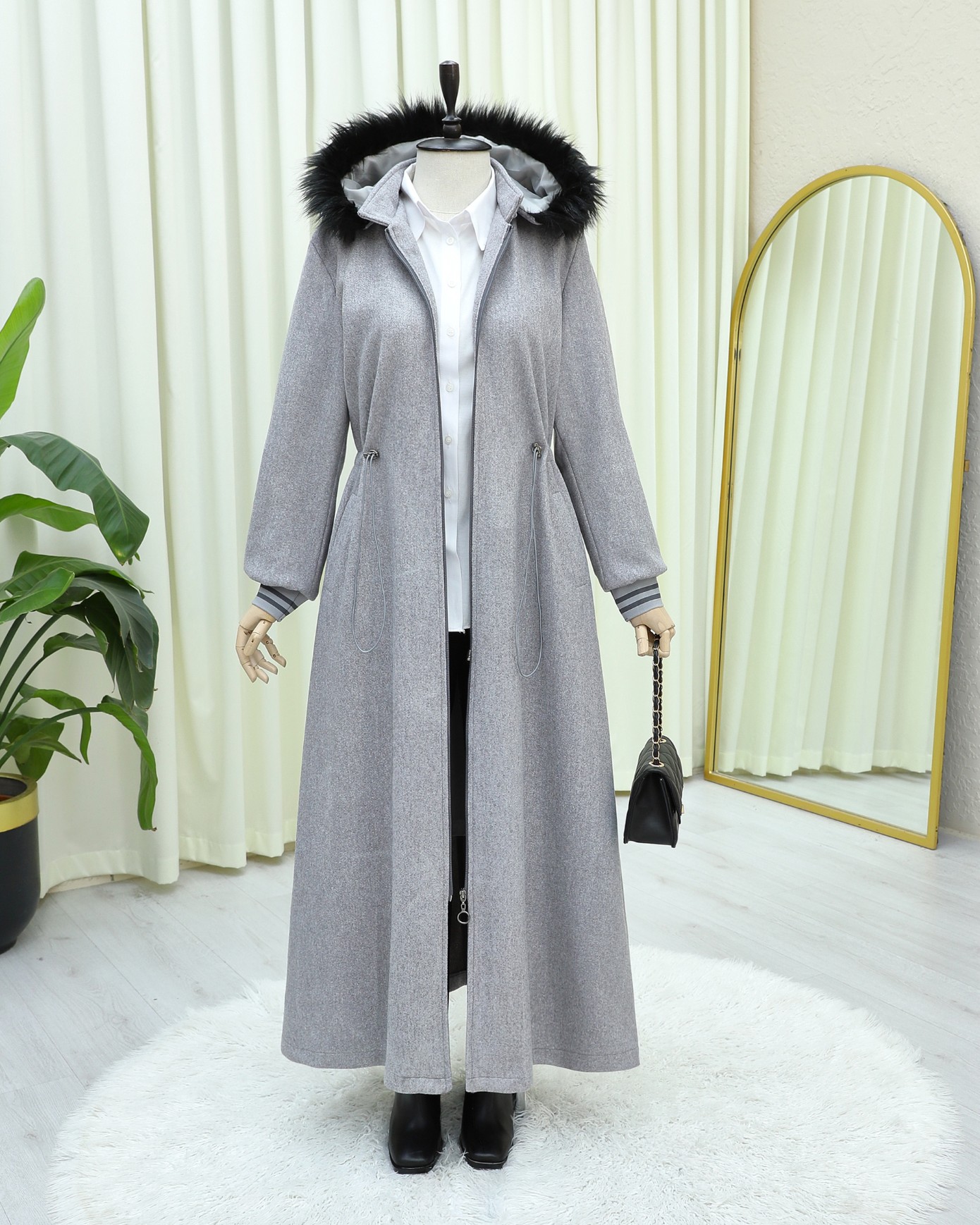 Kapşonlu Beli Lastikli Cepli Kaşe Kaban -Gri-Gri