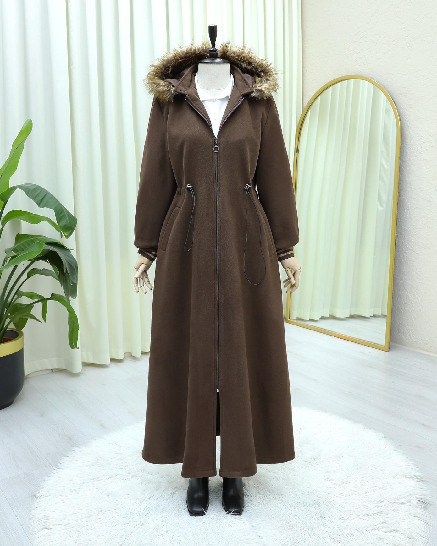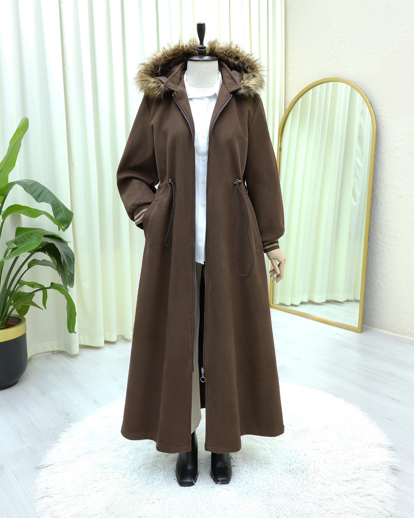 Kapşonlu Beli Lastikli Cepli Kaşe Kaban -Kahve-Kahve