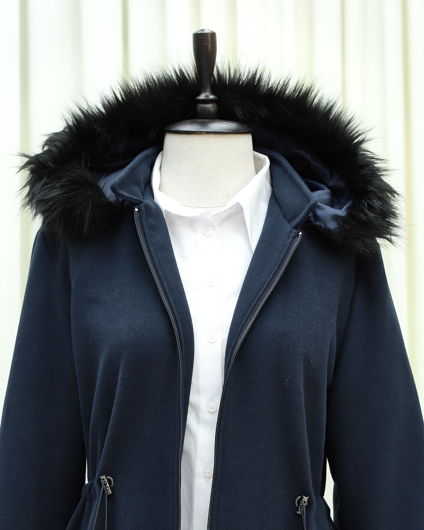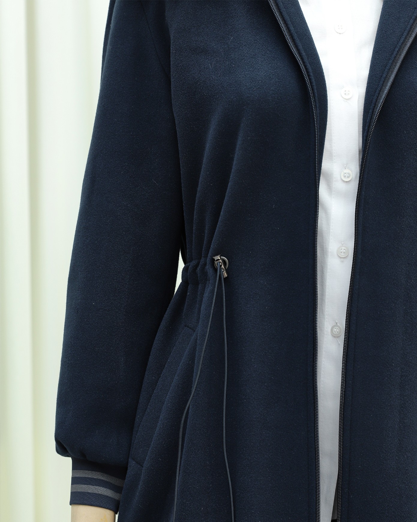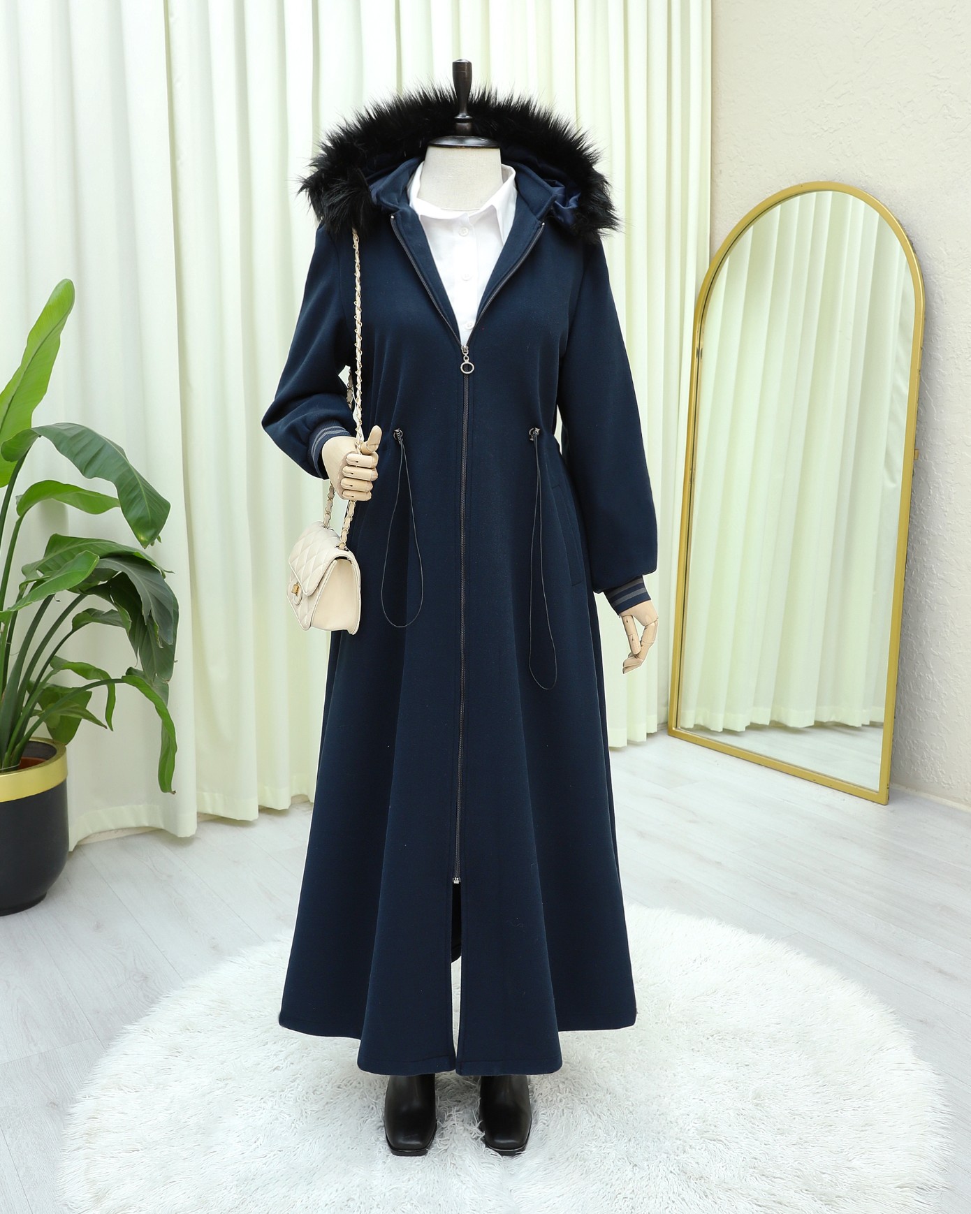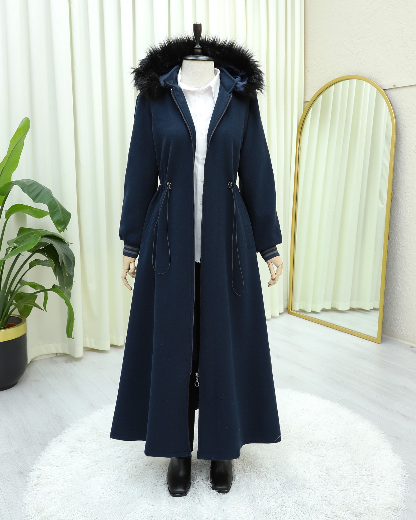 Kapşonlu Beli Lastikli Cepli Kaşe Kaban -Laci-Lacivert