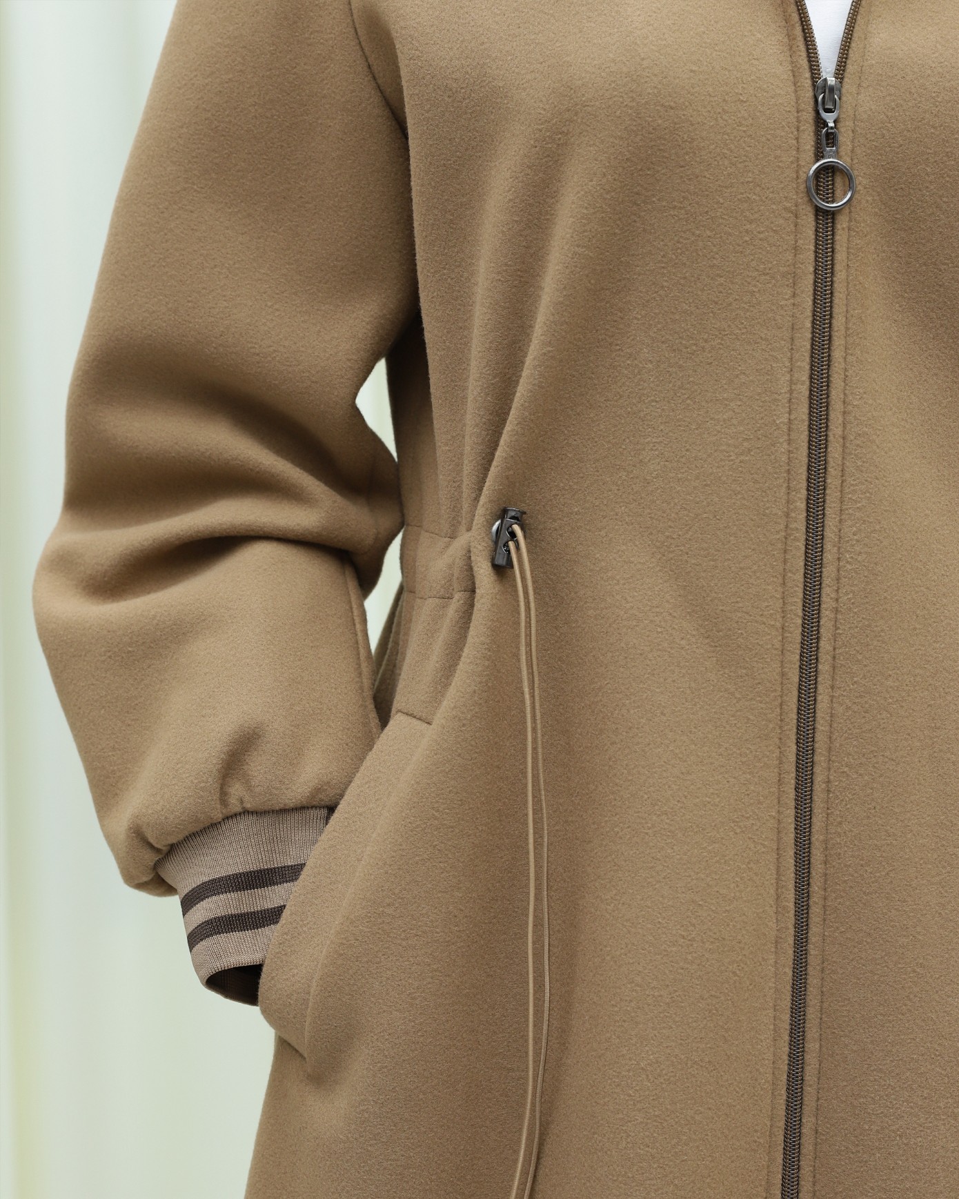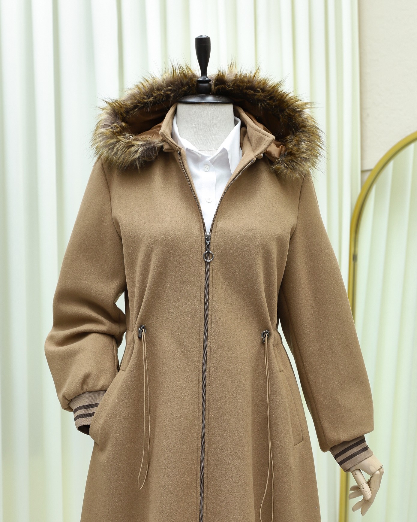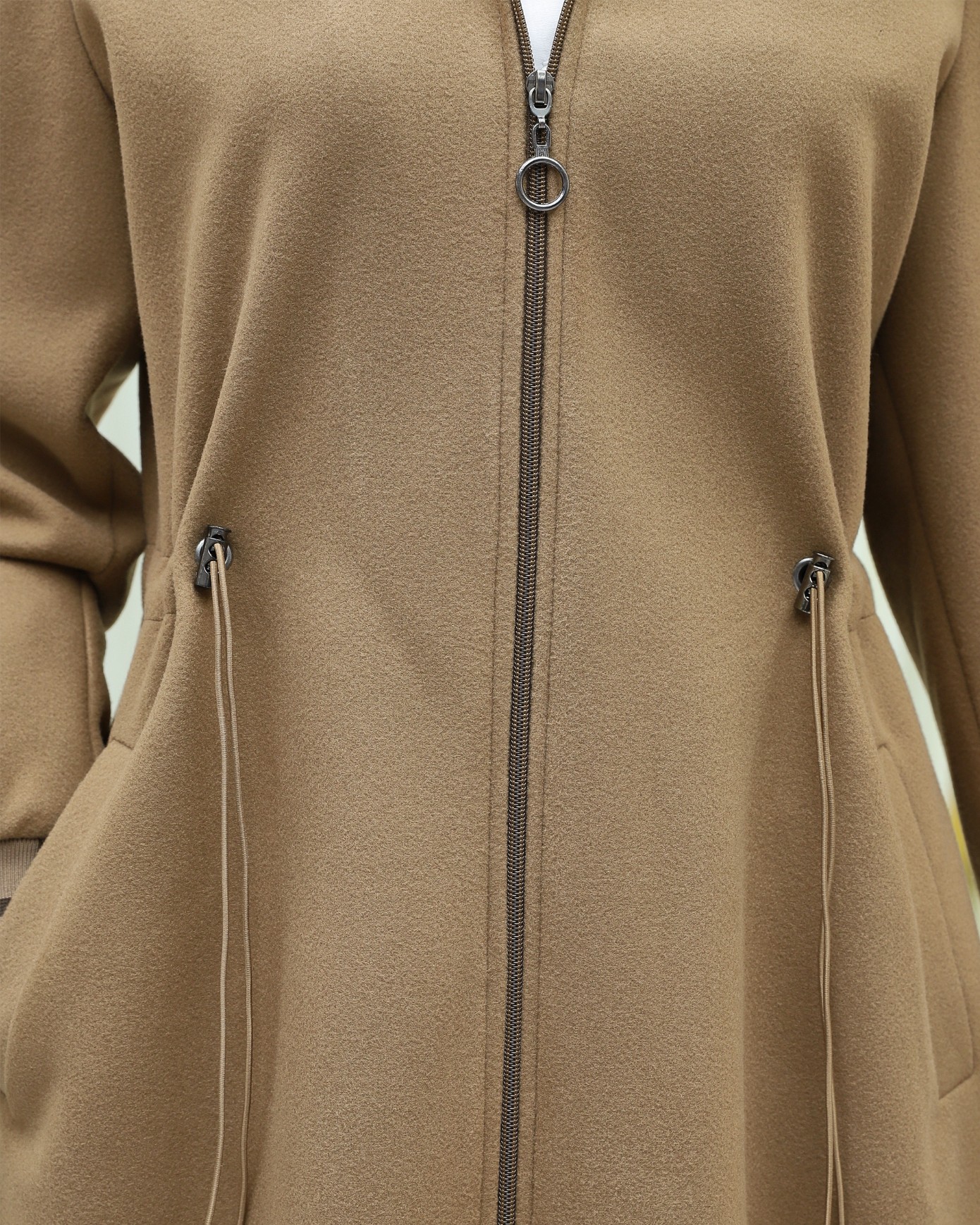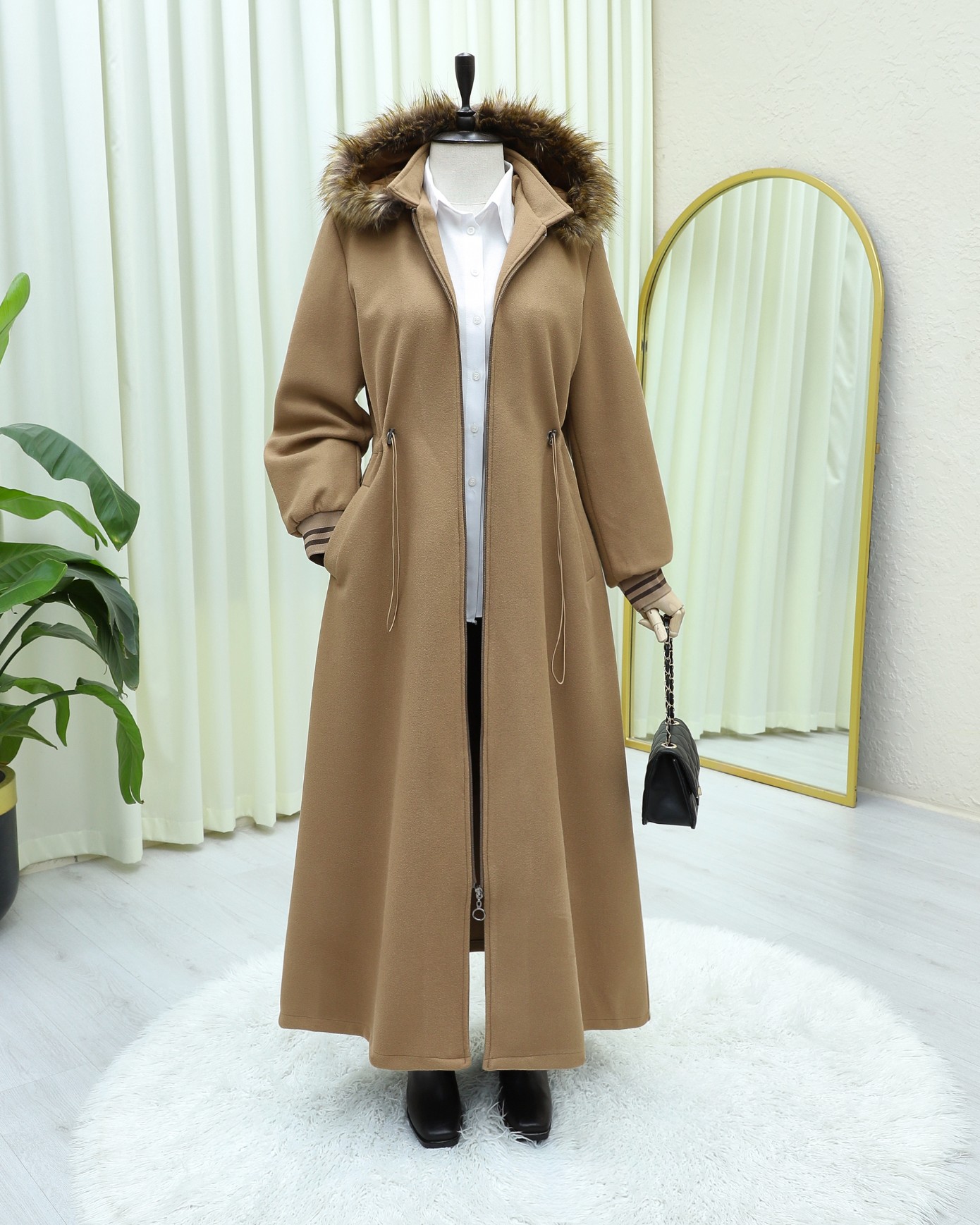 Kapşonlu Beli Lastikli Cepli Kaşe Kaban -Taba-Taba
