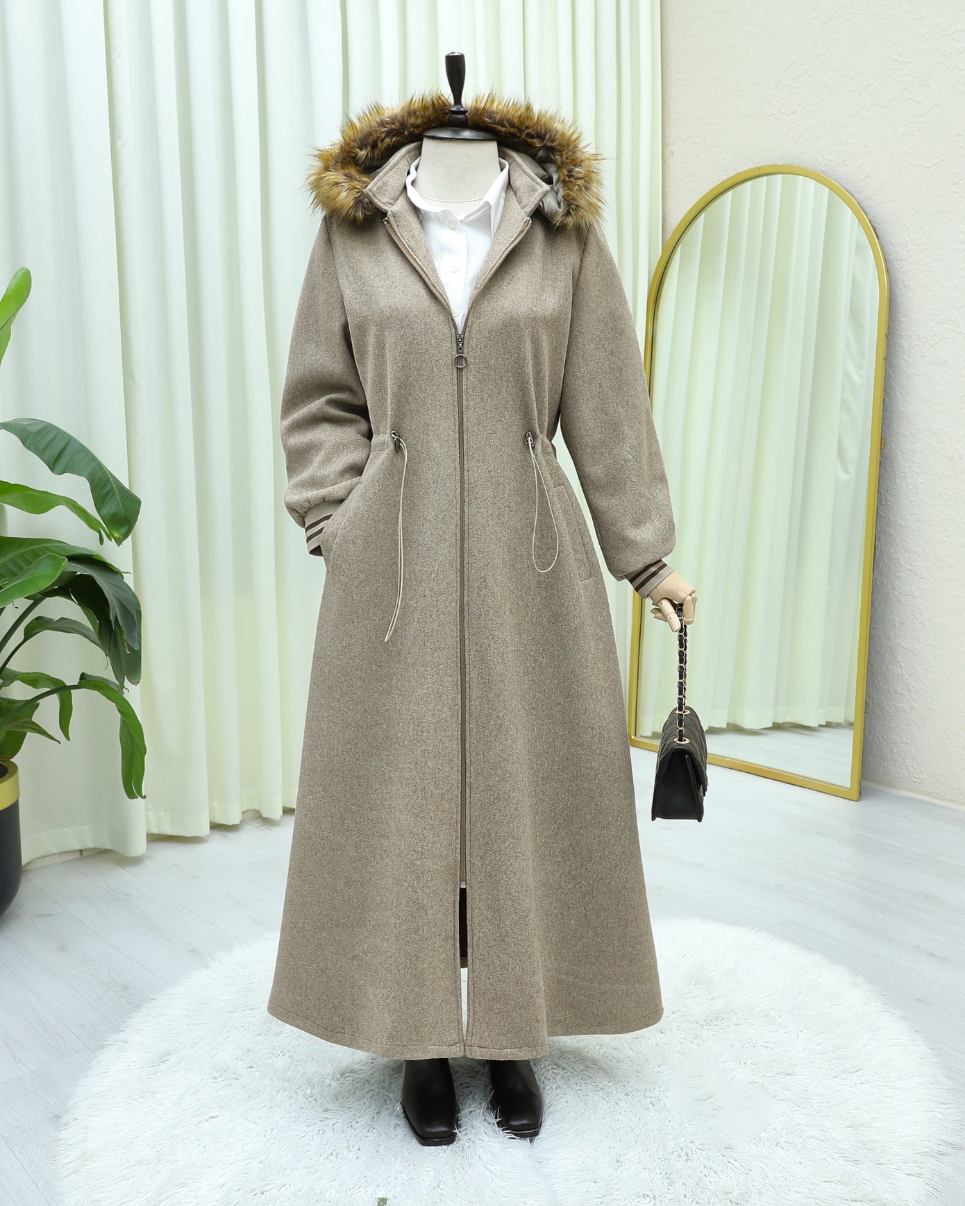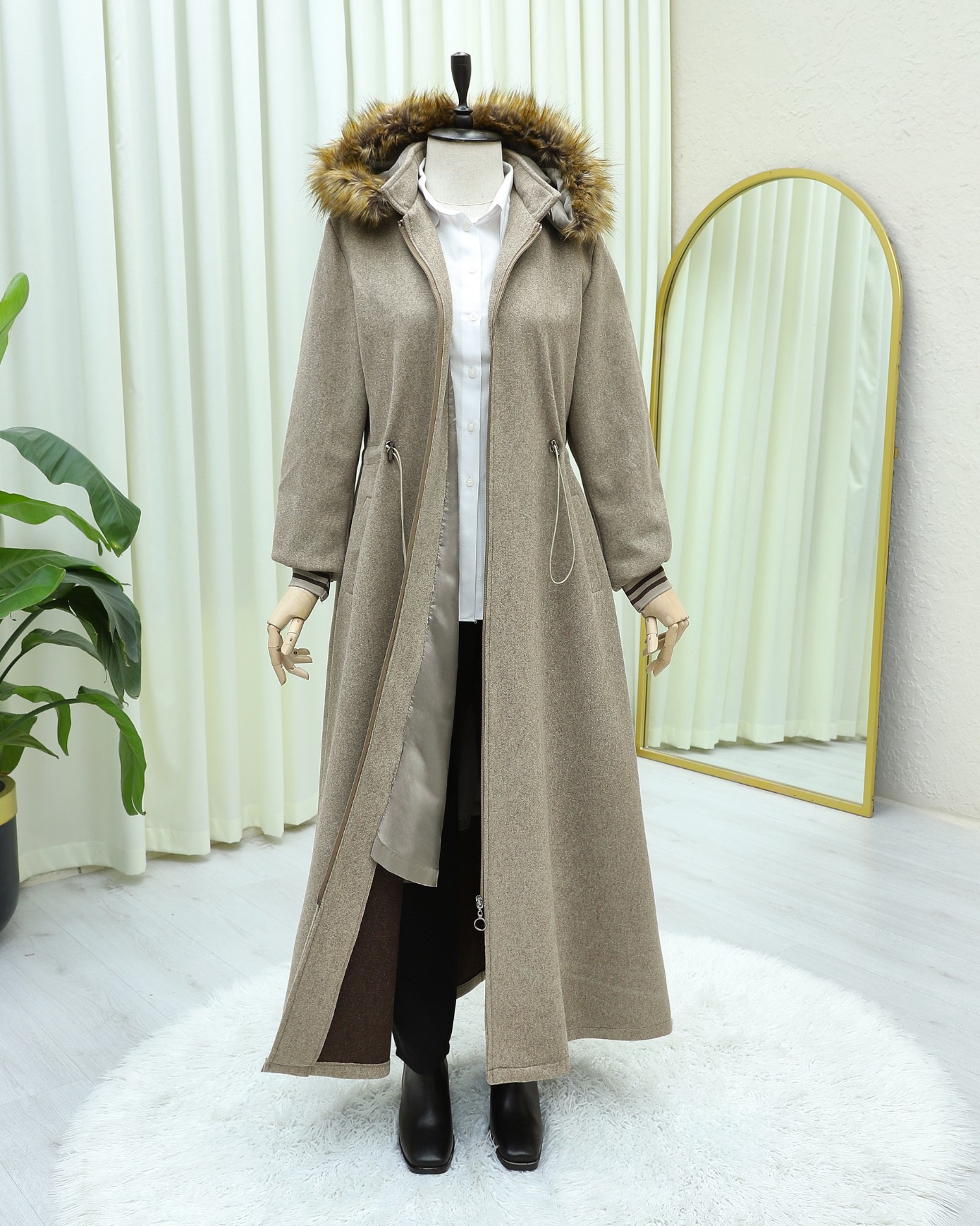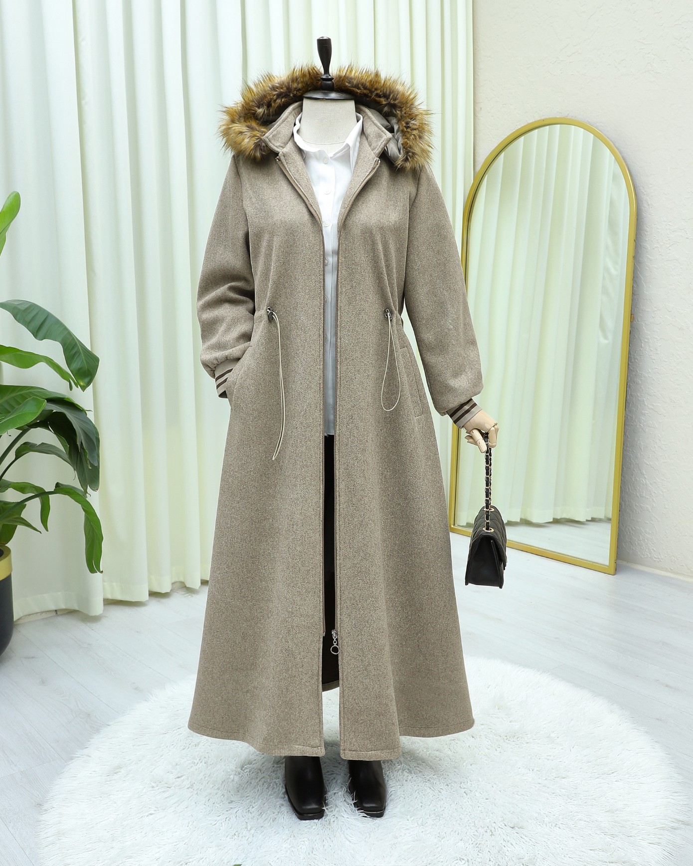 Kapşonlu Beli Lastikli Cepli Kaşe Kaban -Taş-Taş