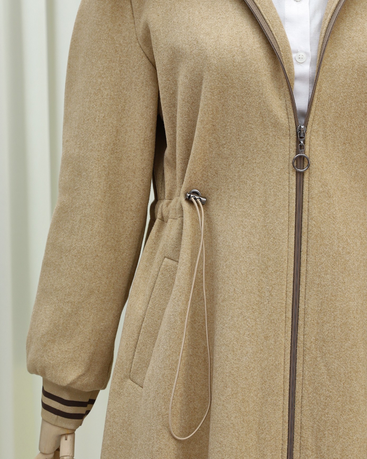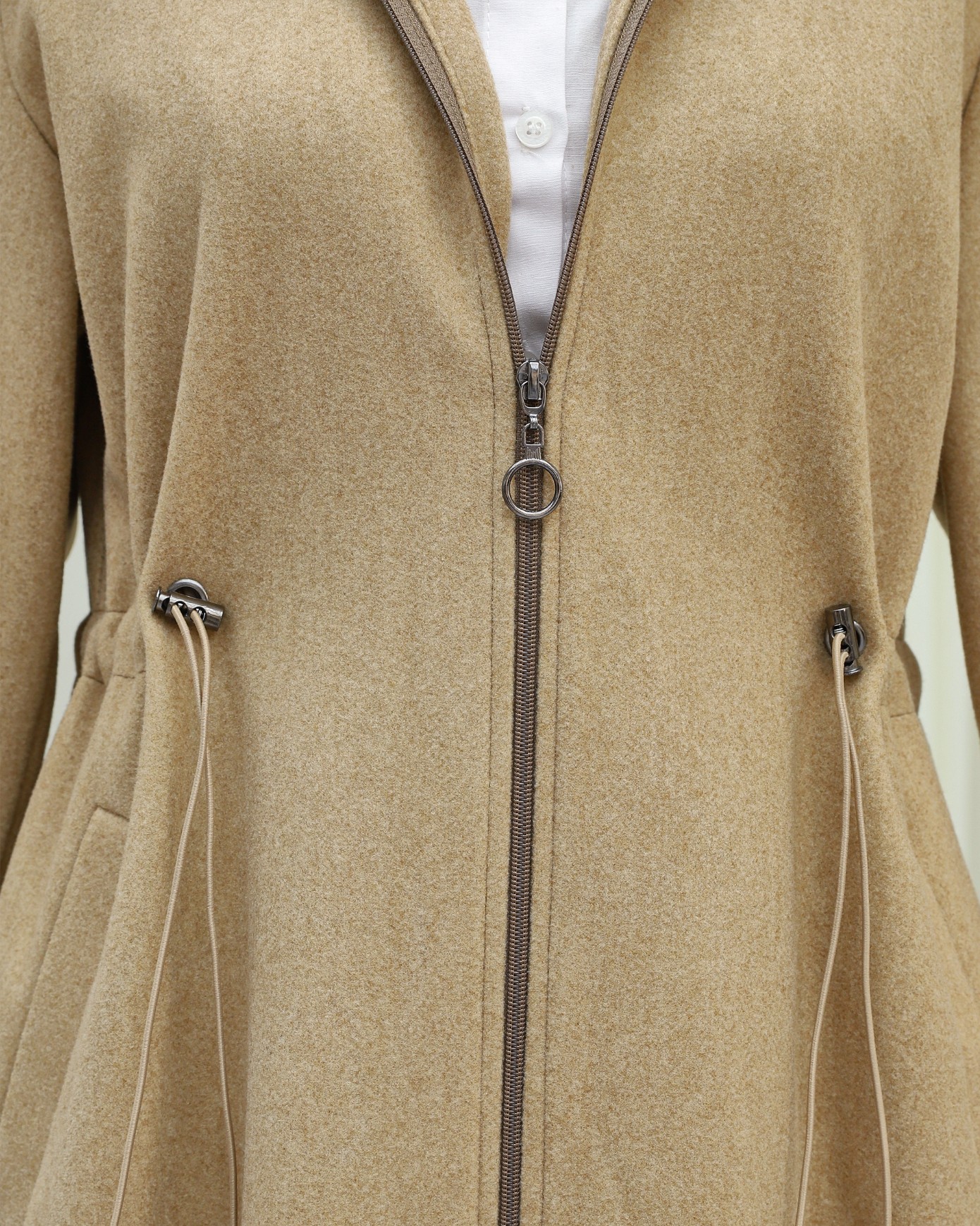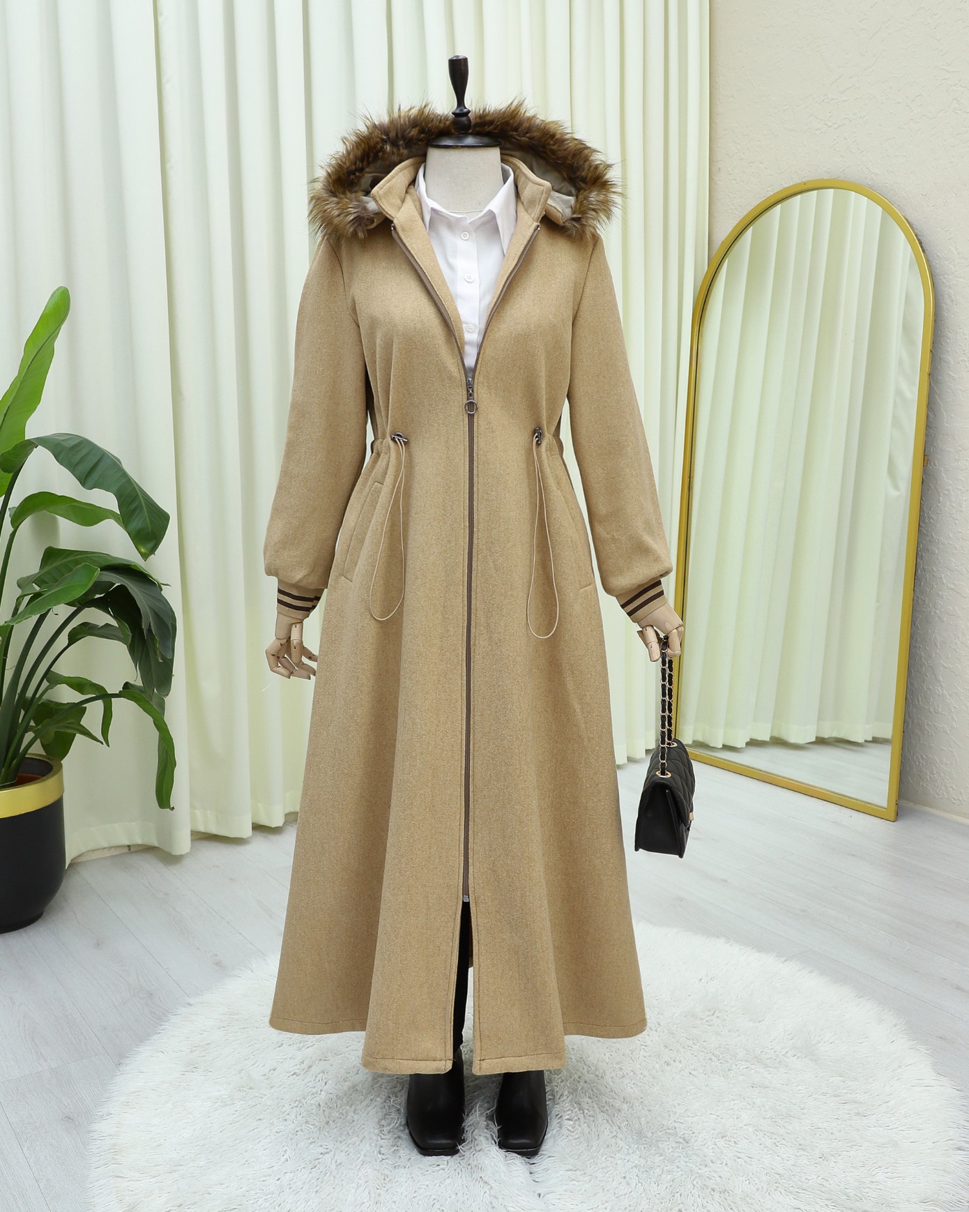 Kapşonlu Beli Lastikli Cepli Kaşe Kaban -Vizon-Vizon
