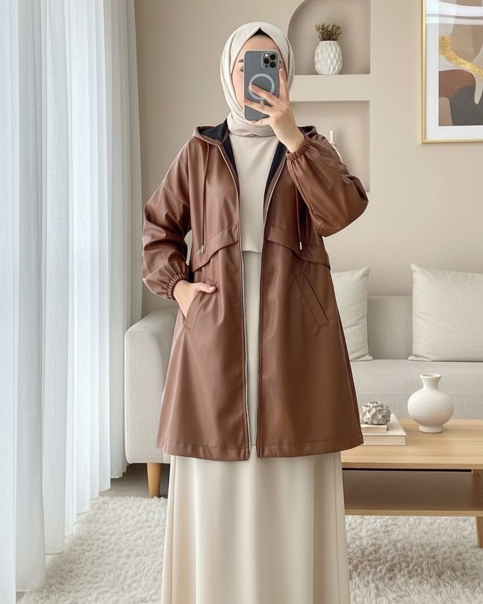 Kapşonlu Cepli Deri Kap -Taba-Taba