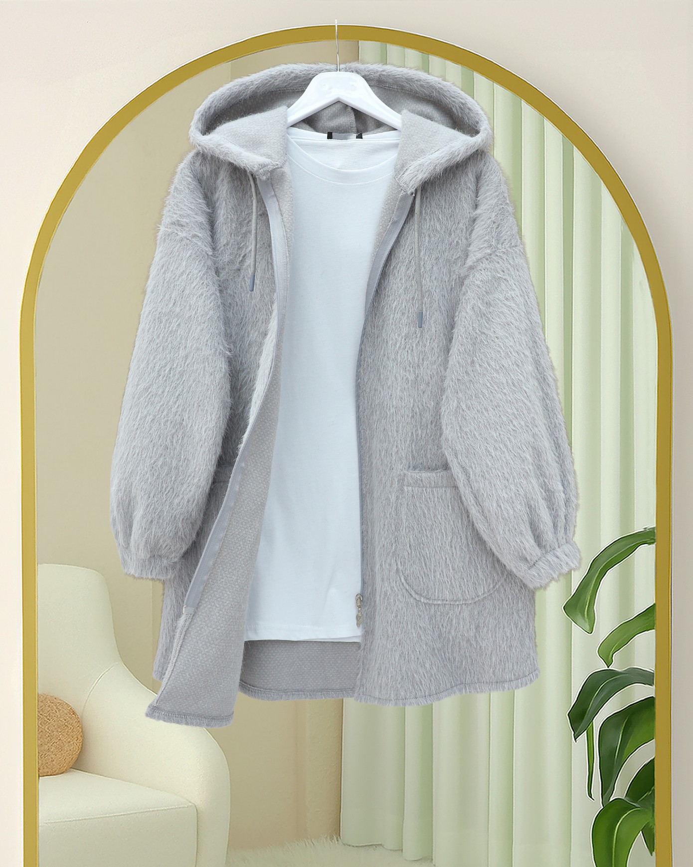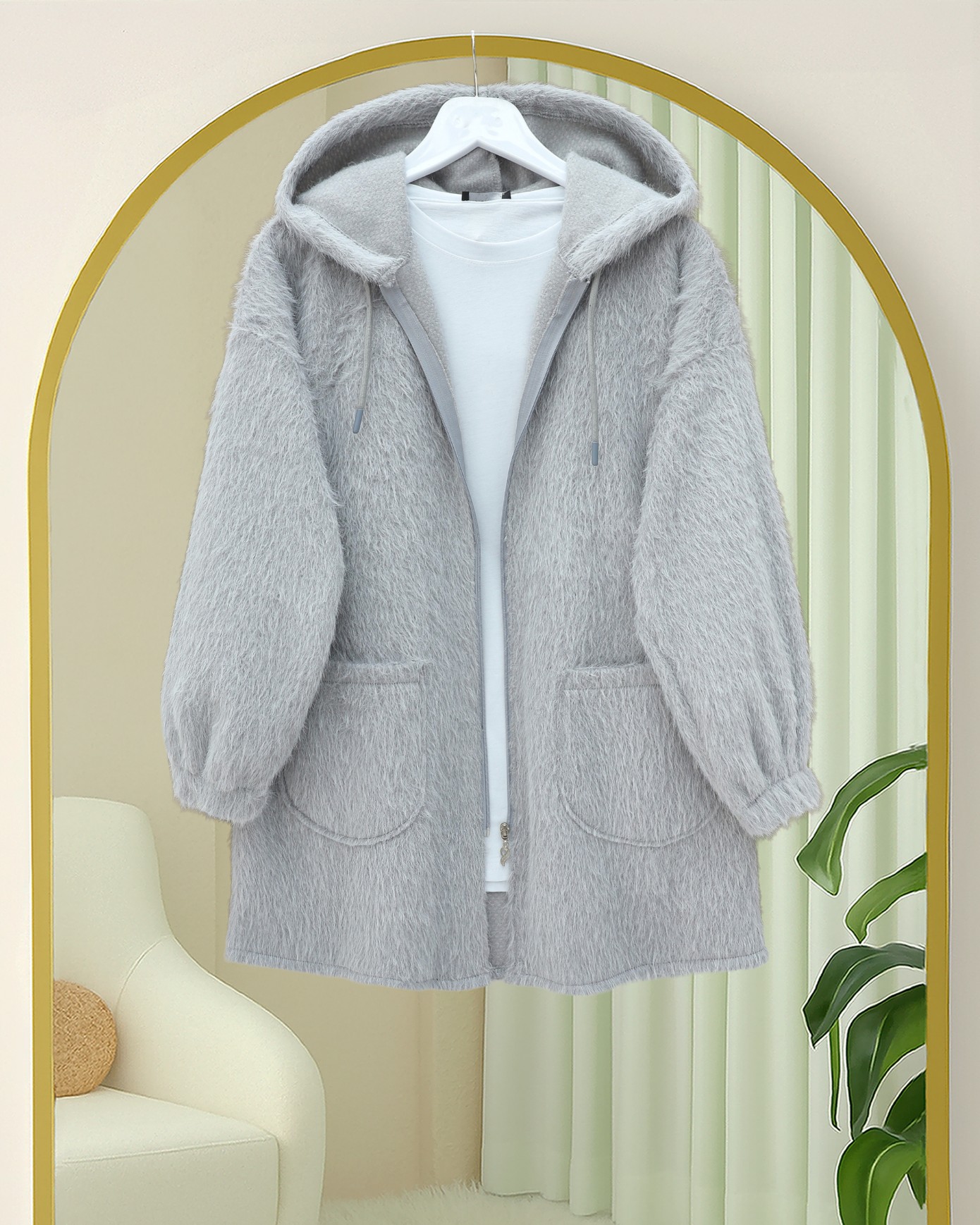 Kapşonlu Cepli Fermuarlı Sakallı Kap -Gri-Gri
