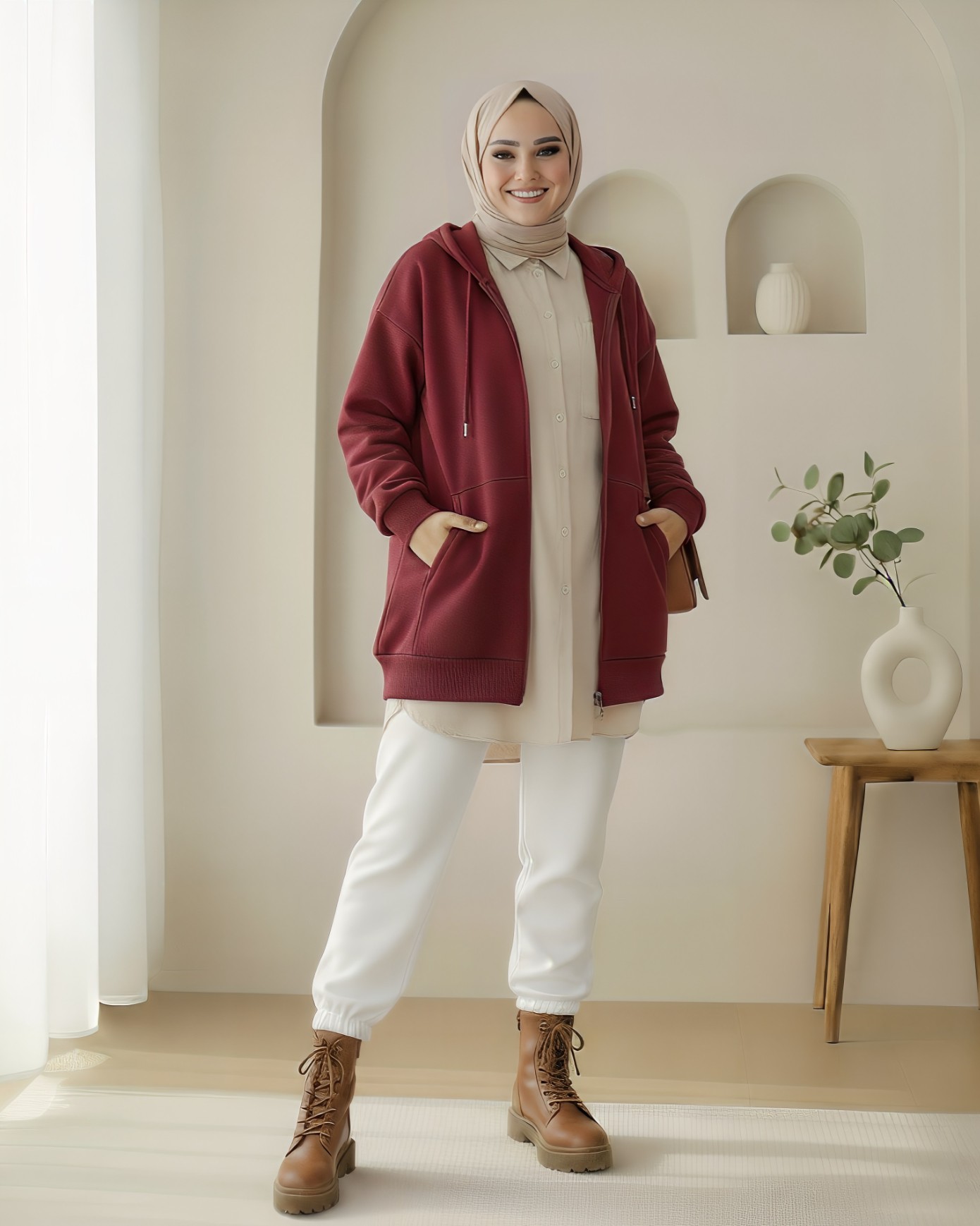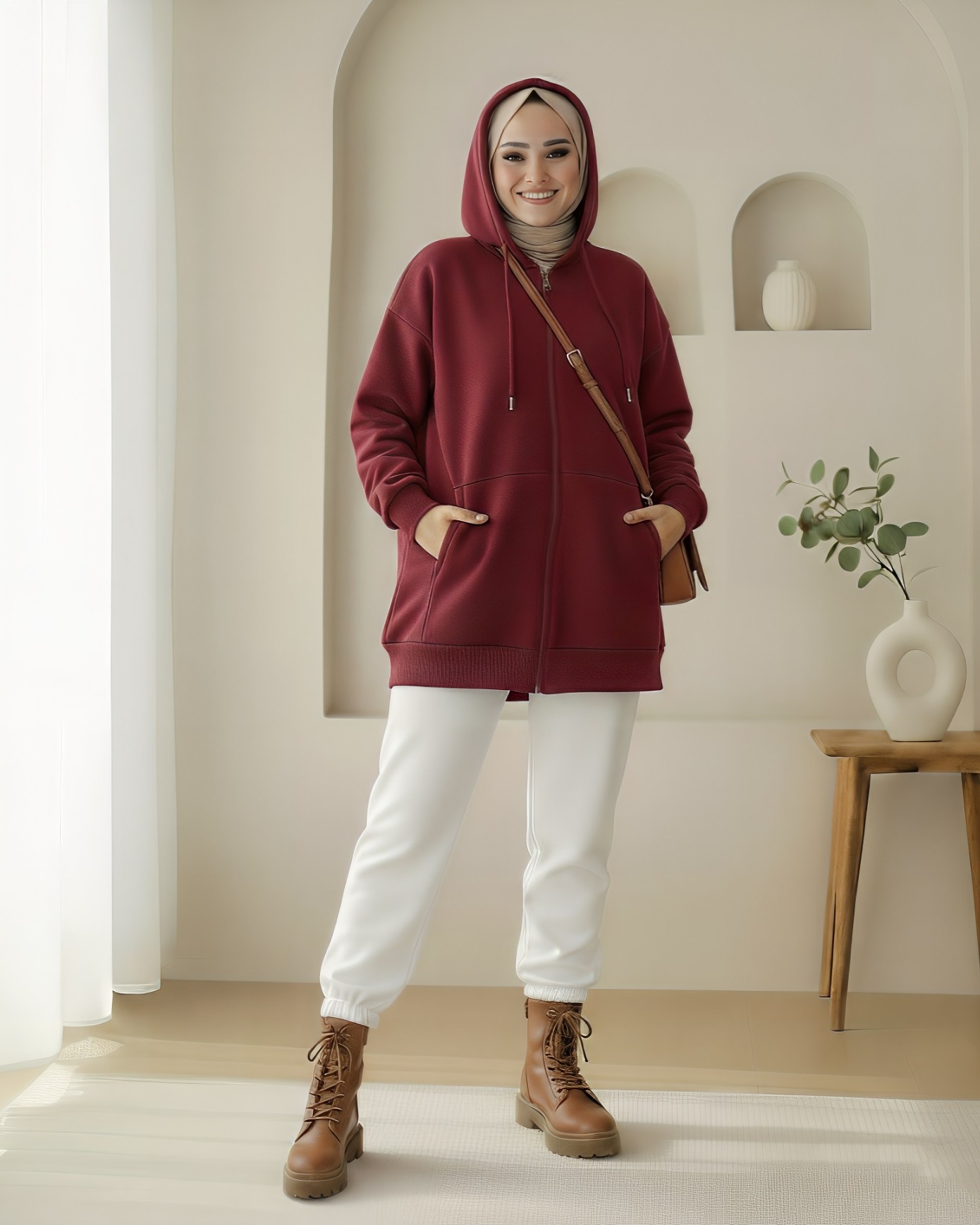 Kapşonlu Cepli Fermuarlı Şardonlu Sweat -Bordo-Bordo
