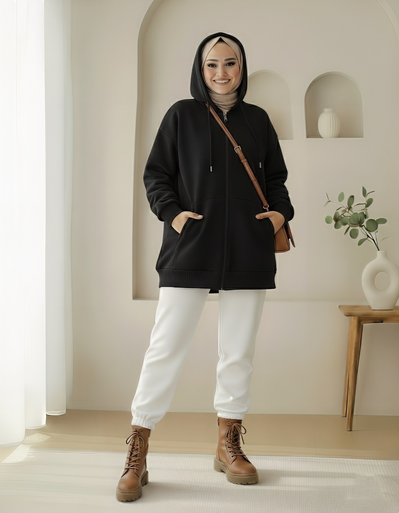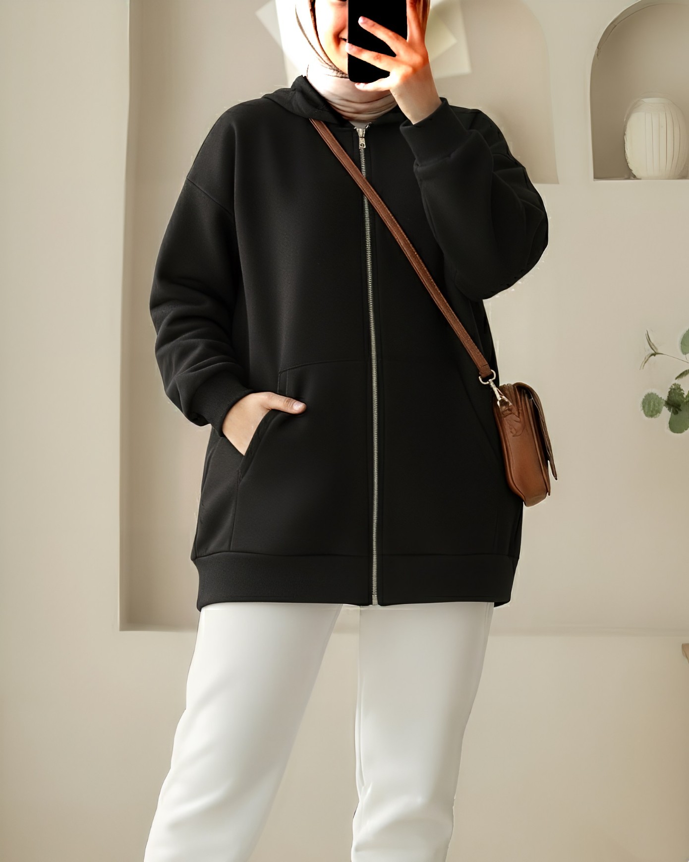 Kapşonlu Cepli Fermuarlı Şardonlu Sweat-Siyah-siyah
