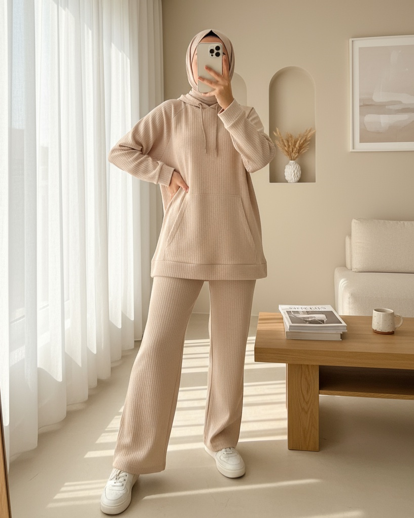 Kapşonlu Kanguru Cepli Fitilli Takım -Bej-Bej
