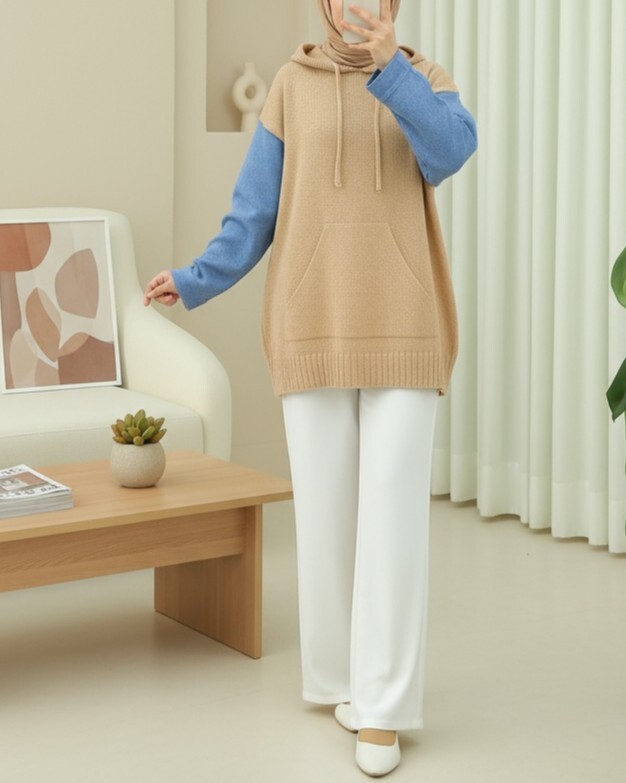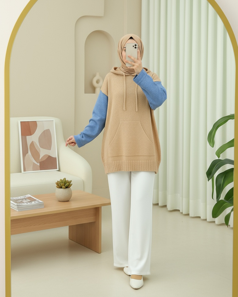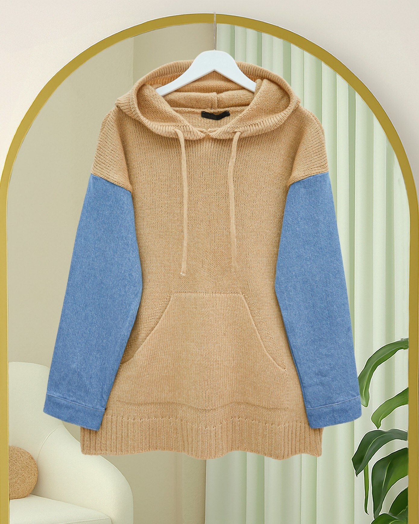 Kapşonlu Kolu Kot Detaylı Kanguru Cepli Triko Sweat -Vizon-Vizon