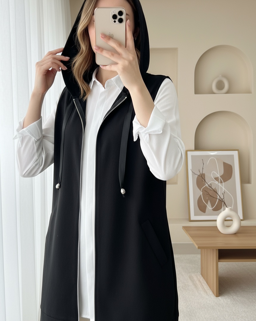Kapşonlu Penye Yelek -Siyah-Siyah