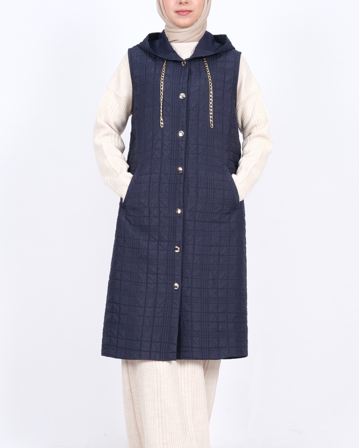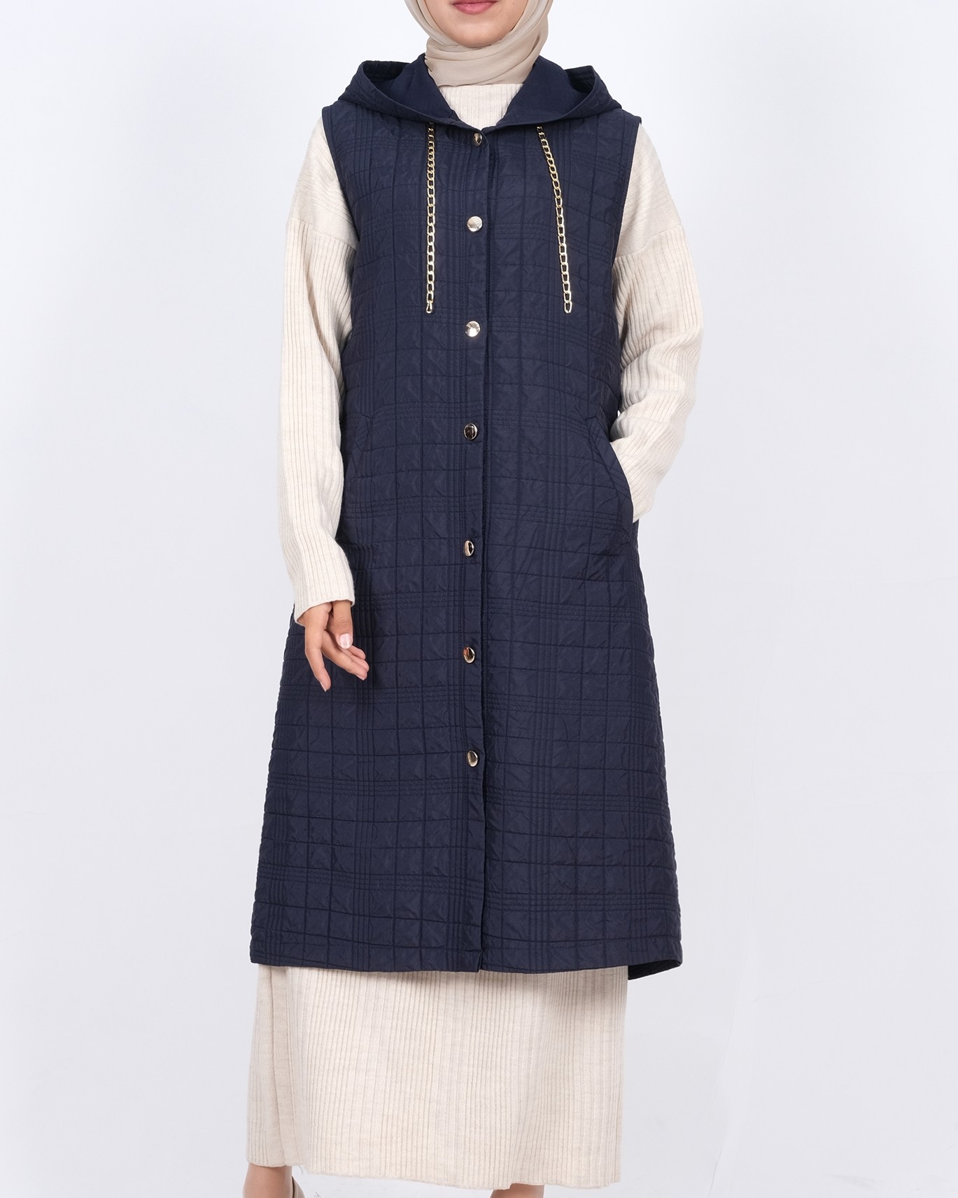 Kapşonlu Zincir Detaylı Cepli Kapitone Yelek -Laci-Lacivert