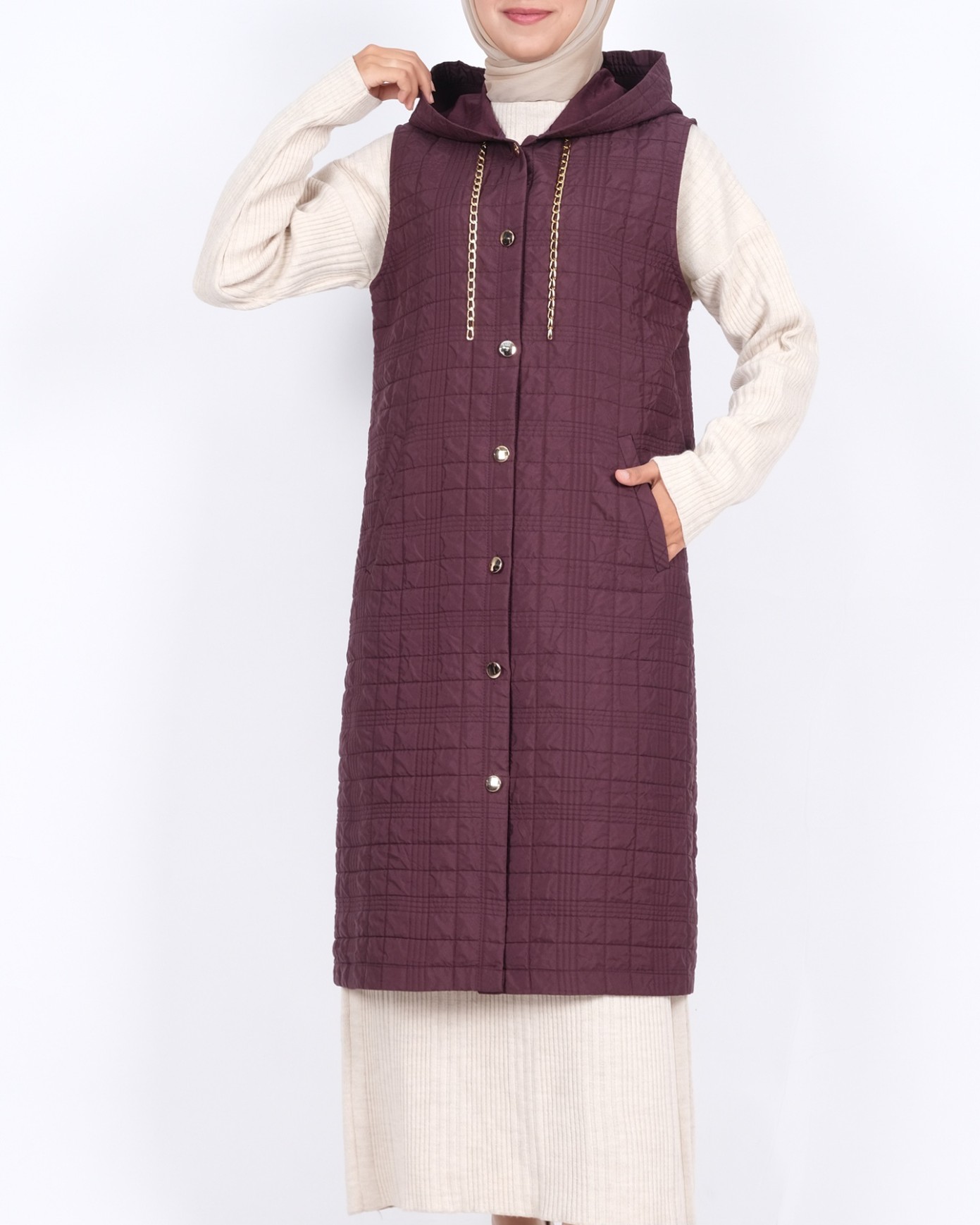 Kapşonlu Zincir Detaylı Cepli Kapitone Yelek -Mürdüm-Mürdüm