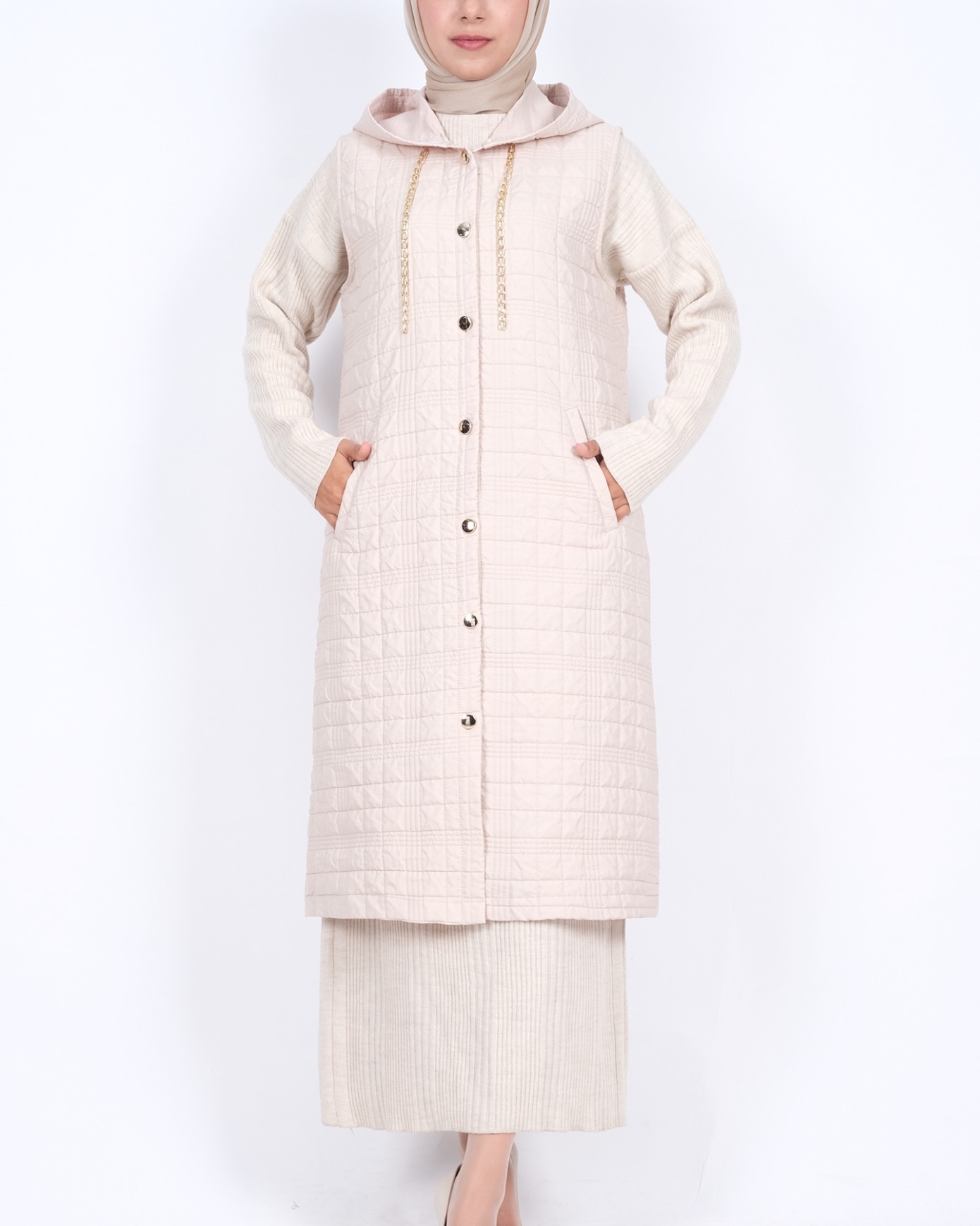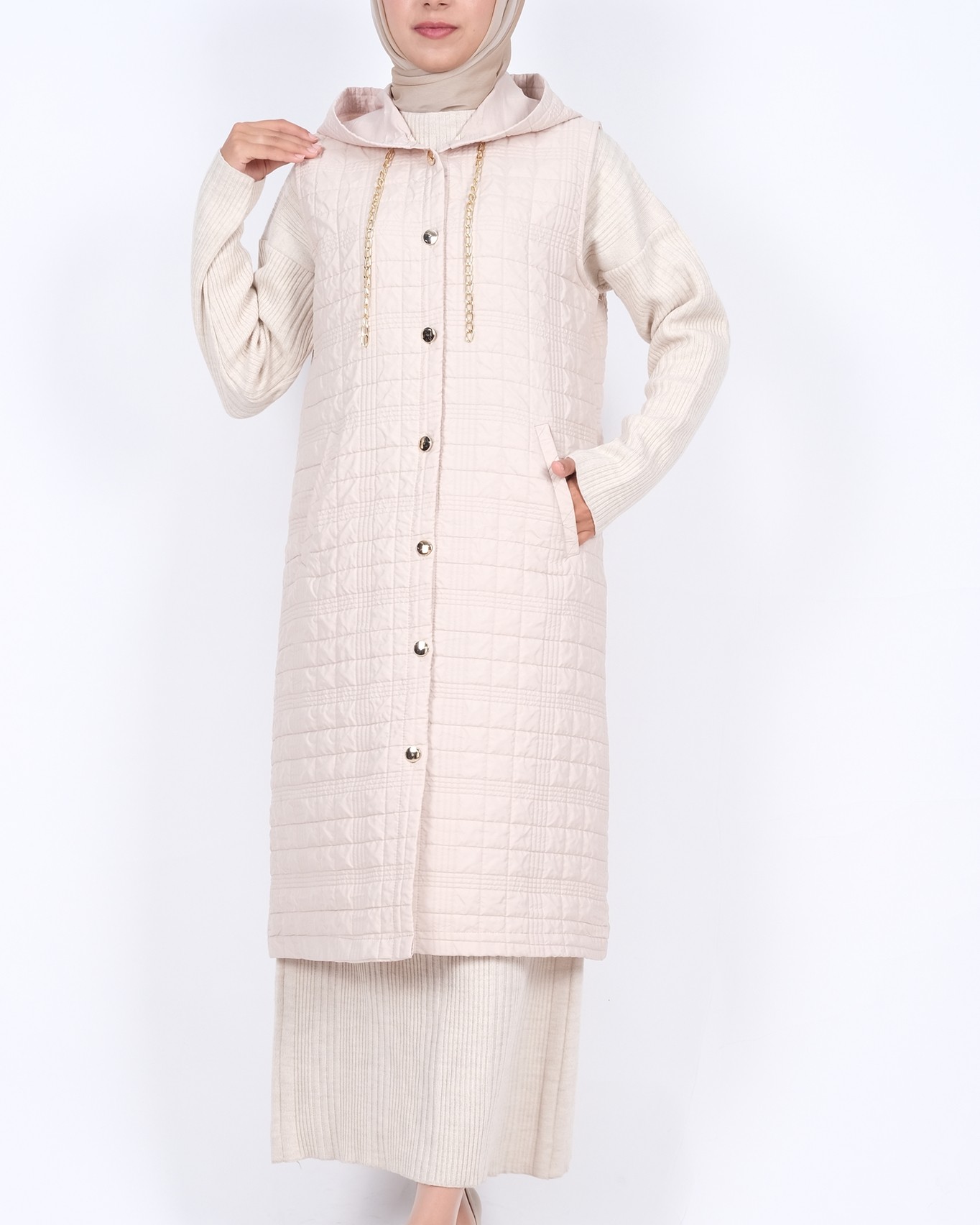 Kapşonlu Zincir Detaylı Cepli Kapitone Yelek -Taş-Taş