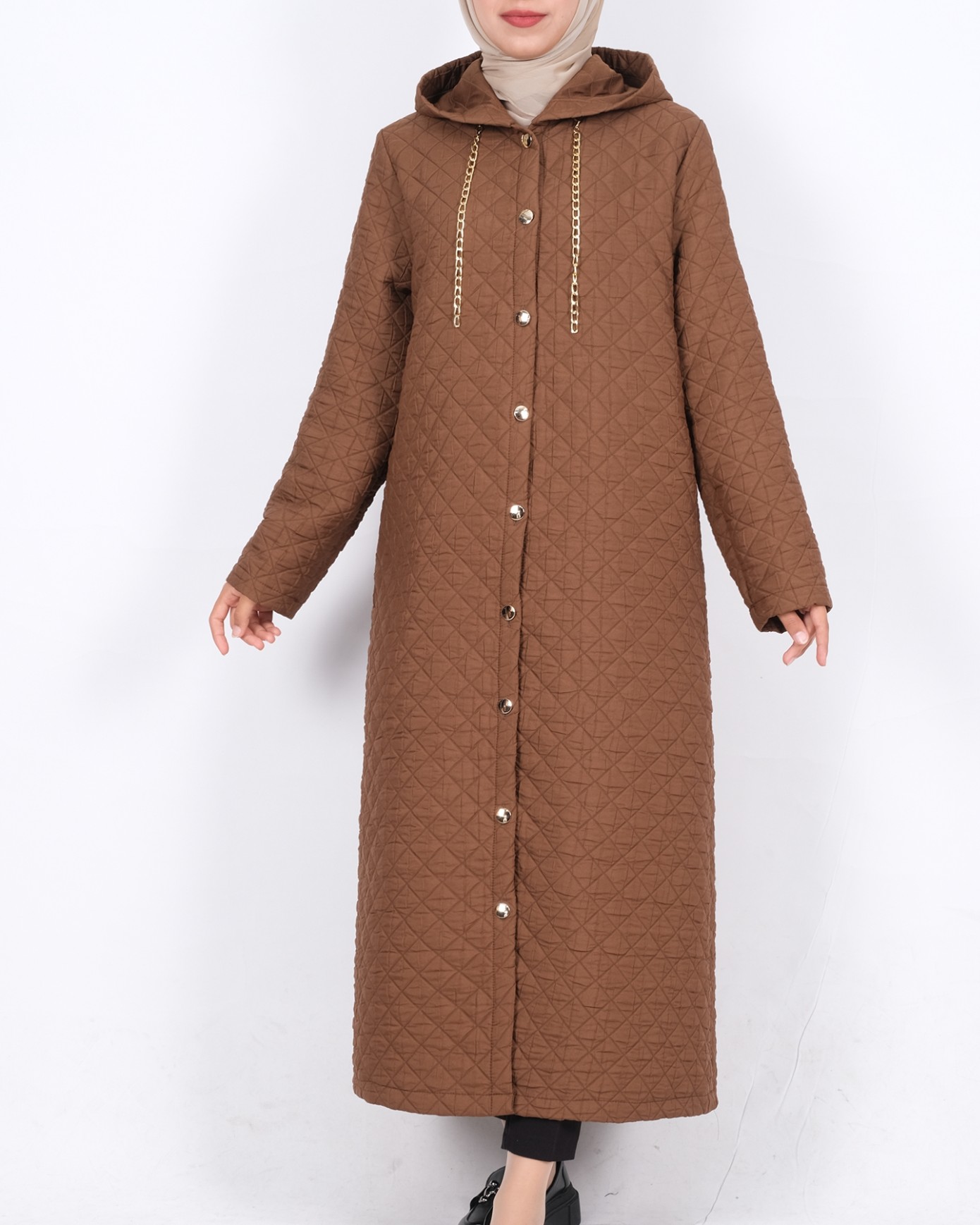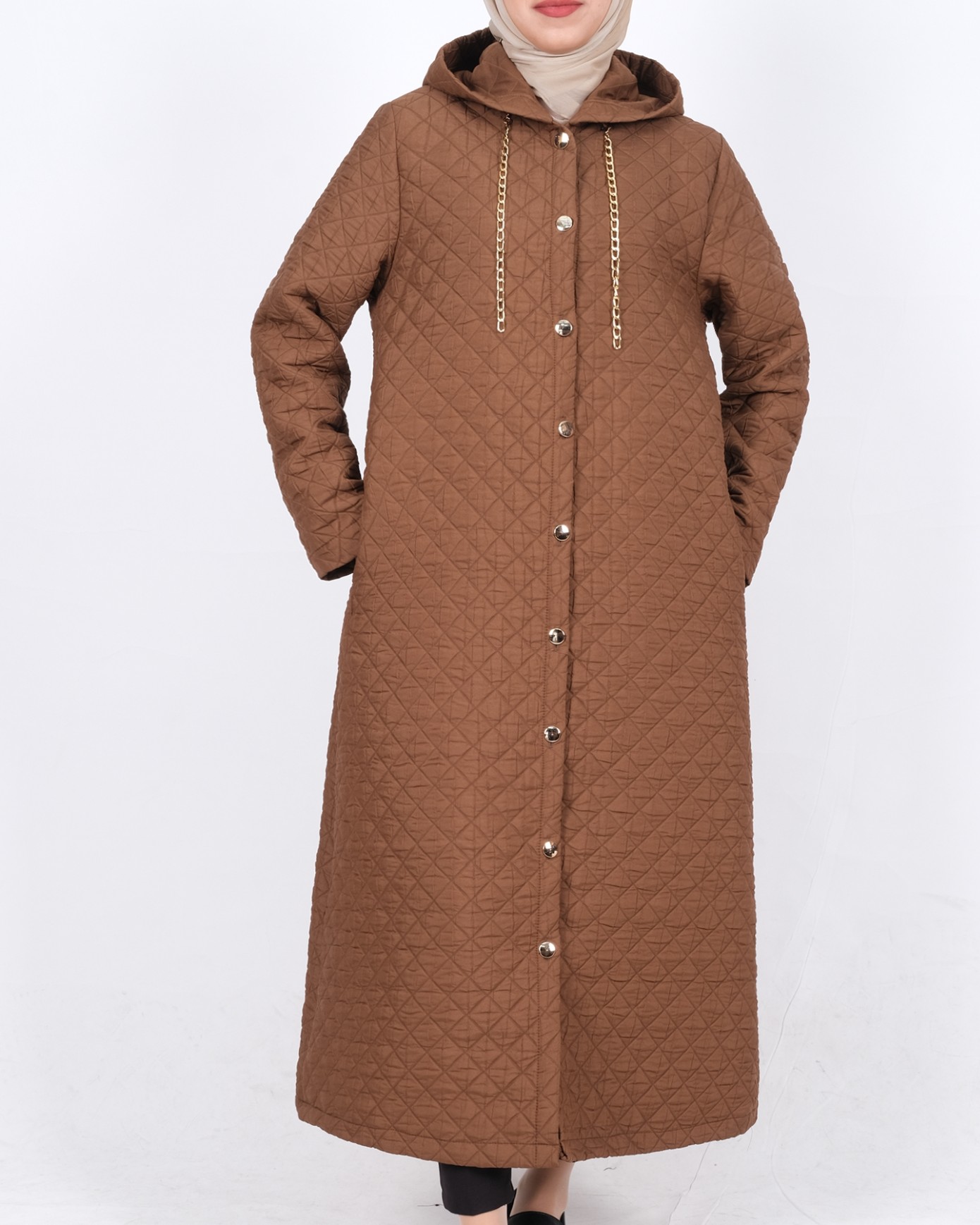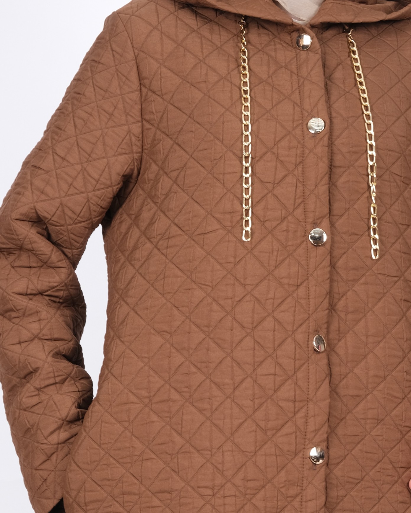 Kapşonlu Zincir Detaylı Düğmeli Kapitone Kap -Kahve-Kahve