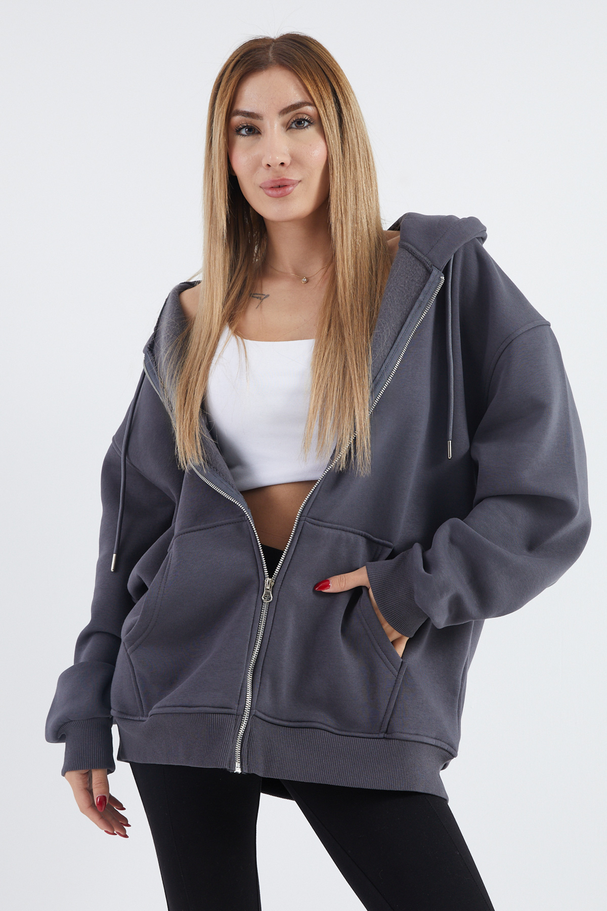 Kapüşonlu Şardonlu Oversize Sweatshirt-Füme