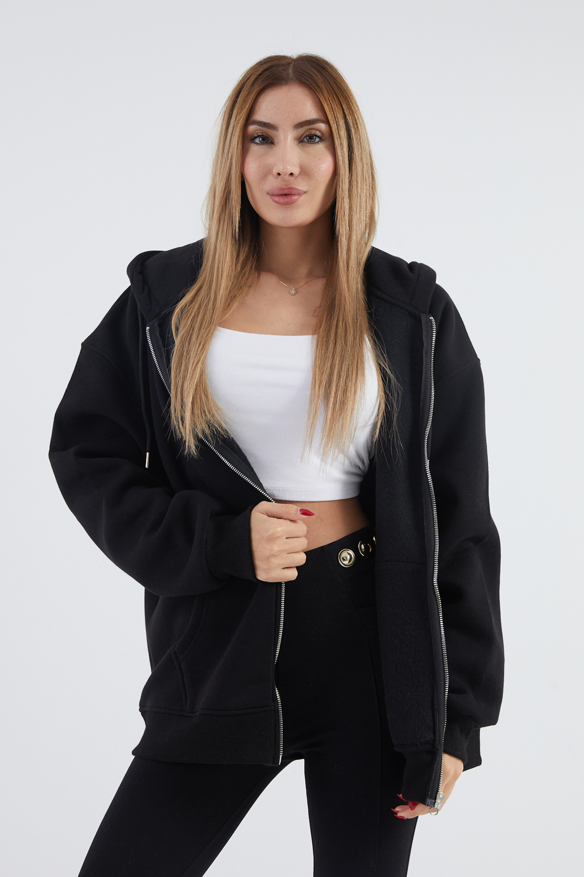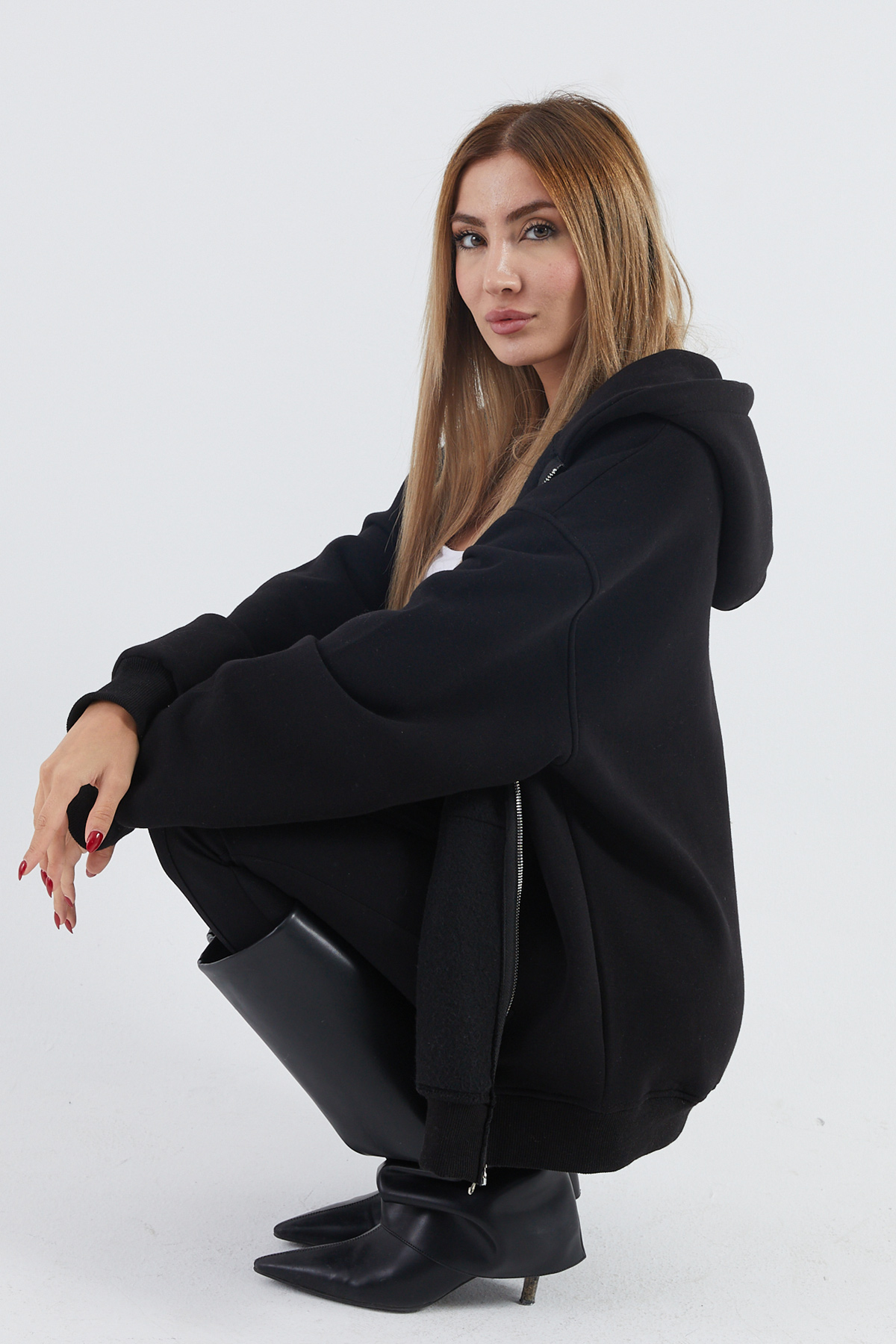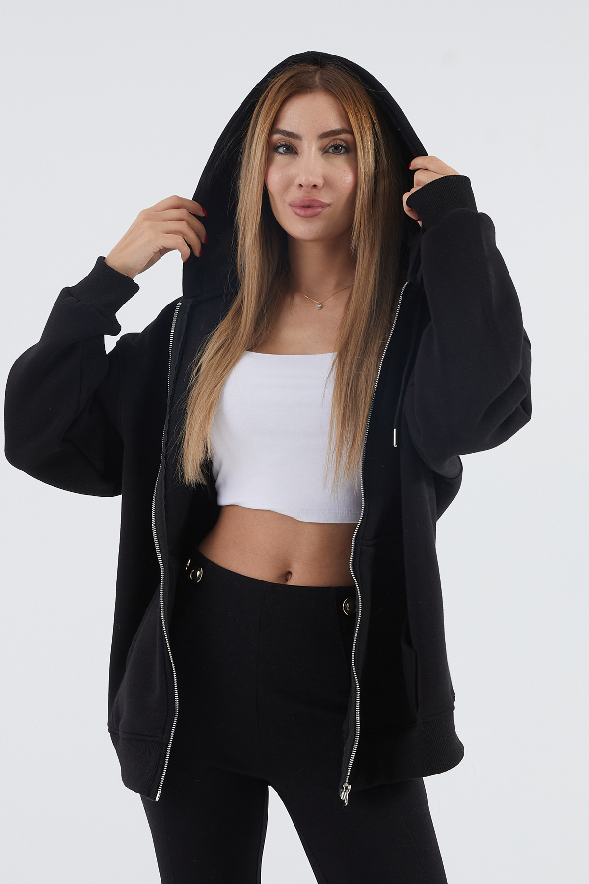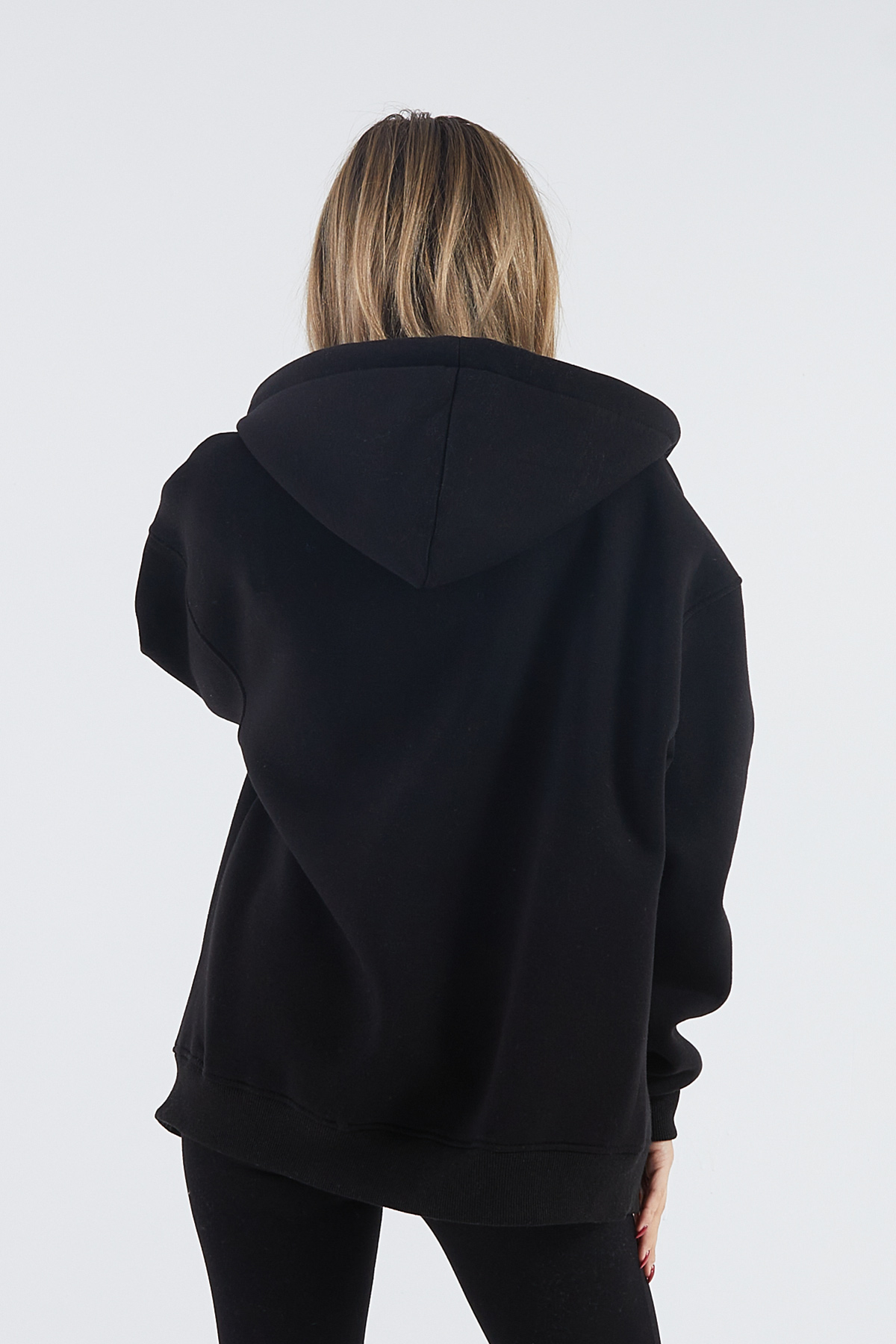 Kapüşonlu Şardonlu Oversize Sweatshirt-Siyah