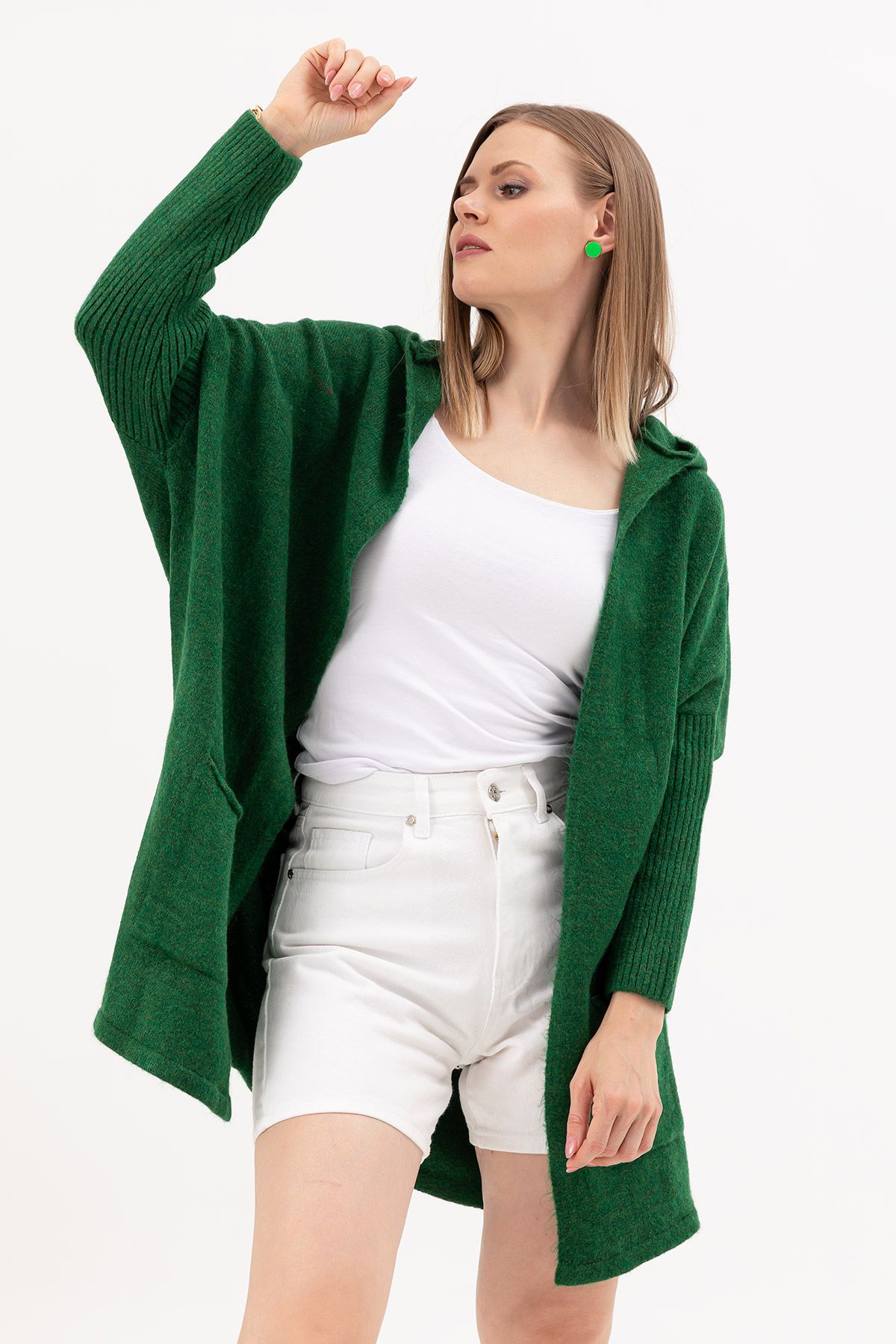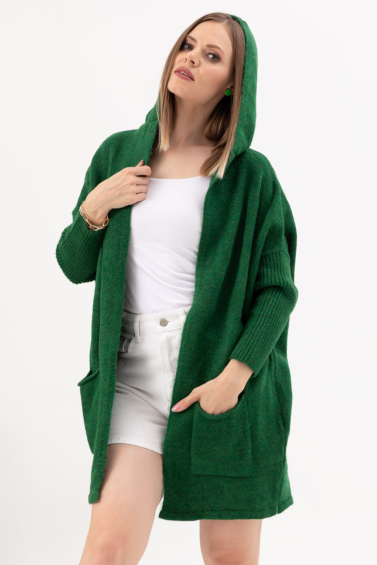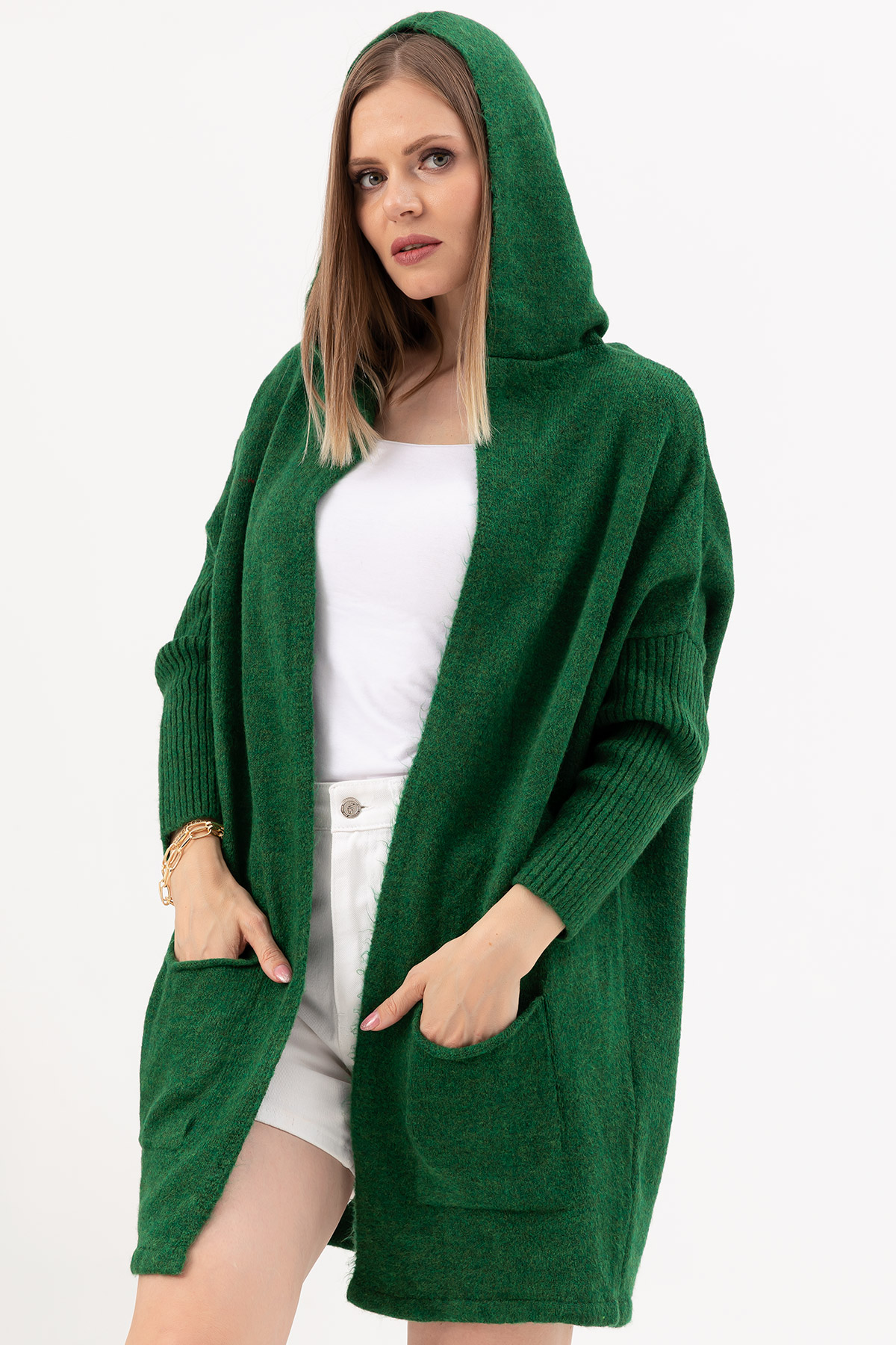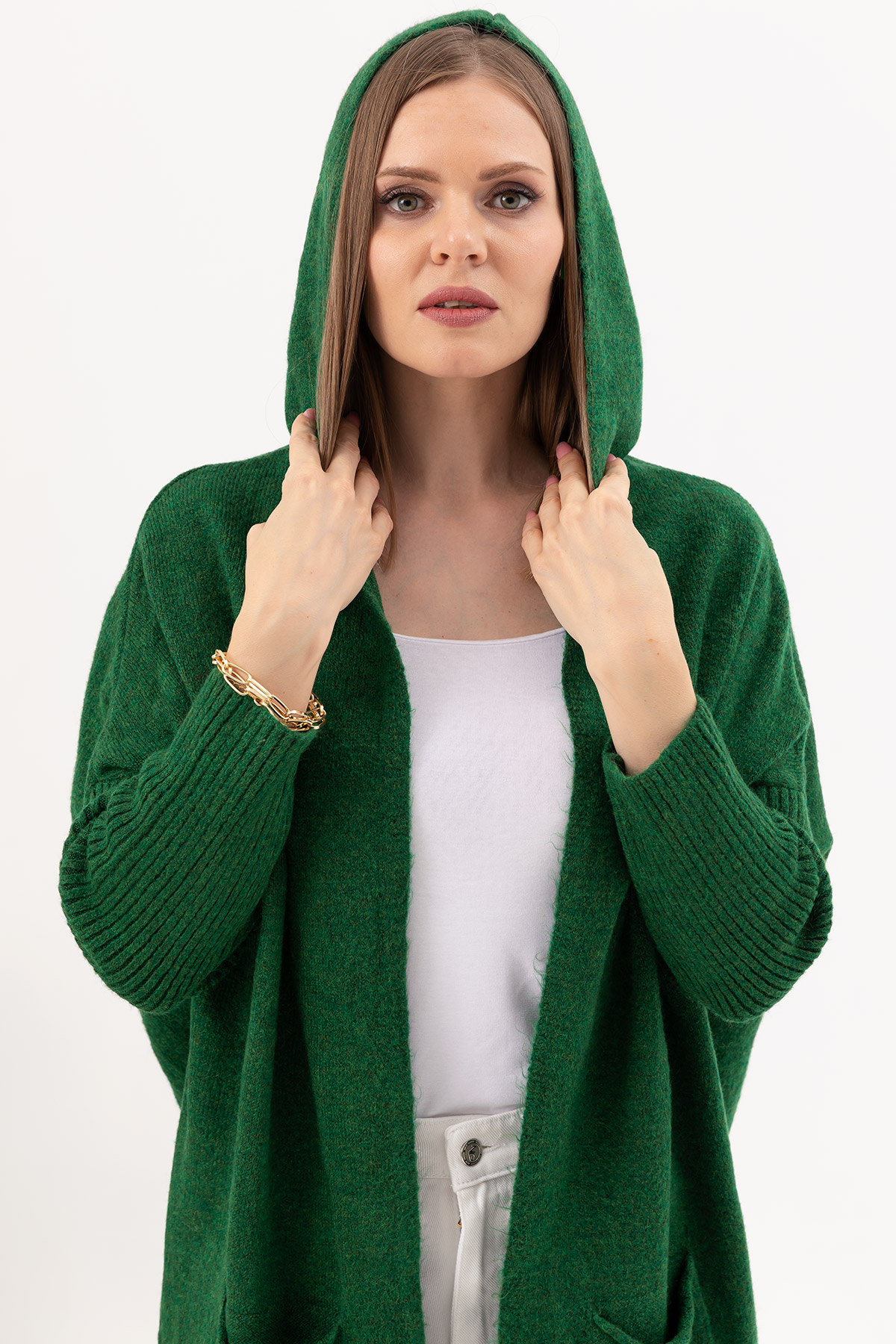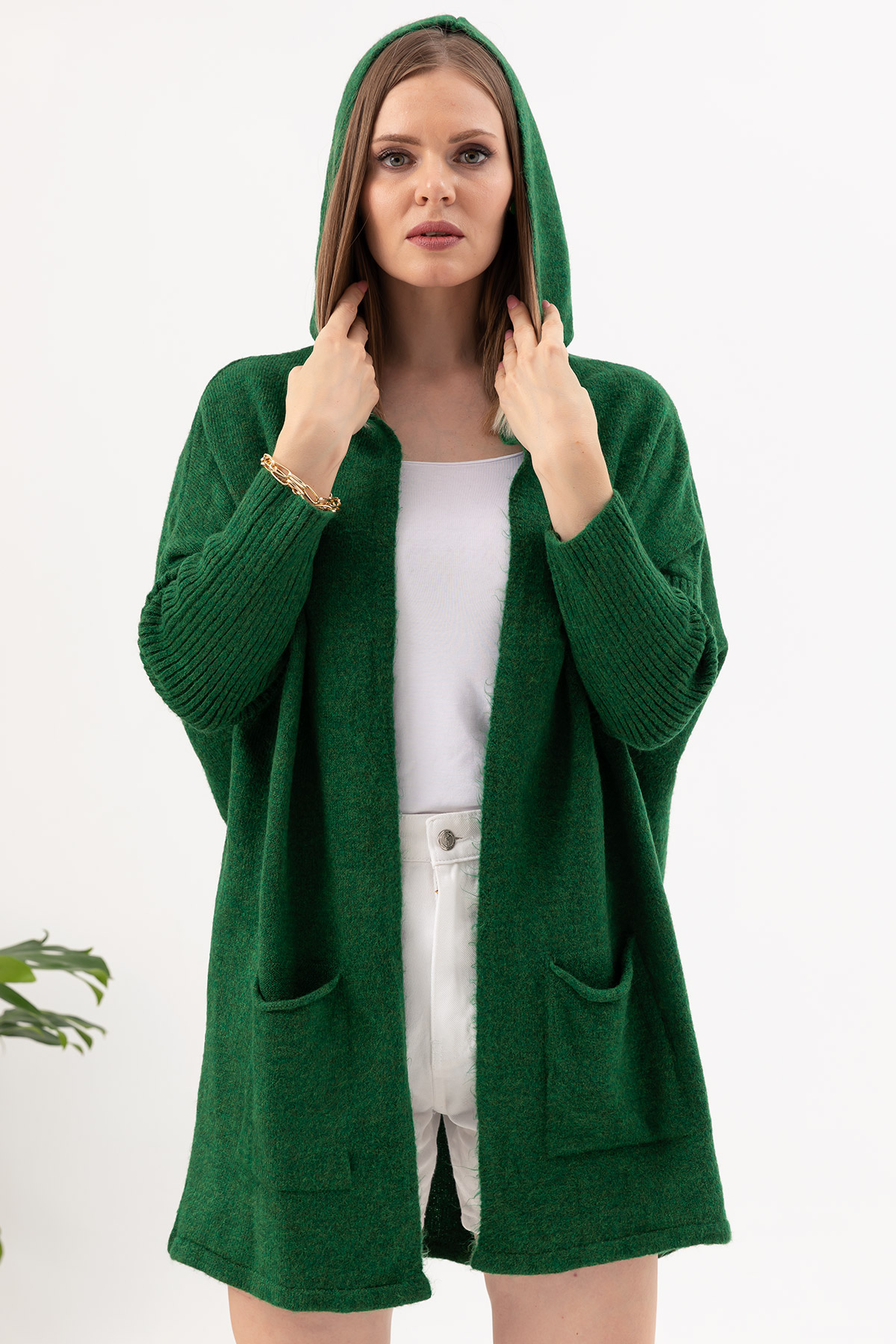 Kapüşonlu Triko Hırka-Koyu Yeşil