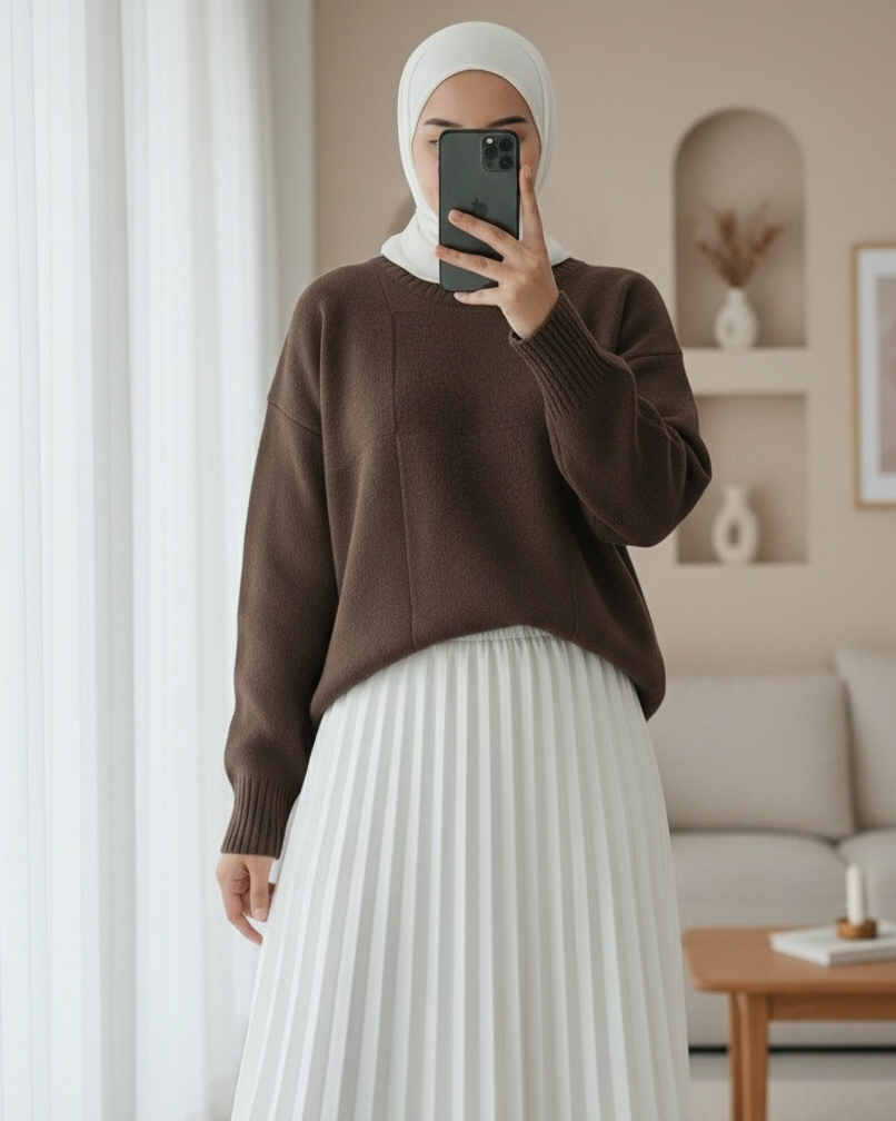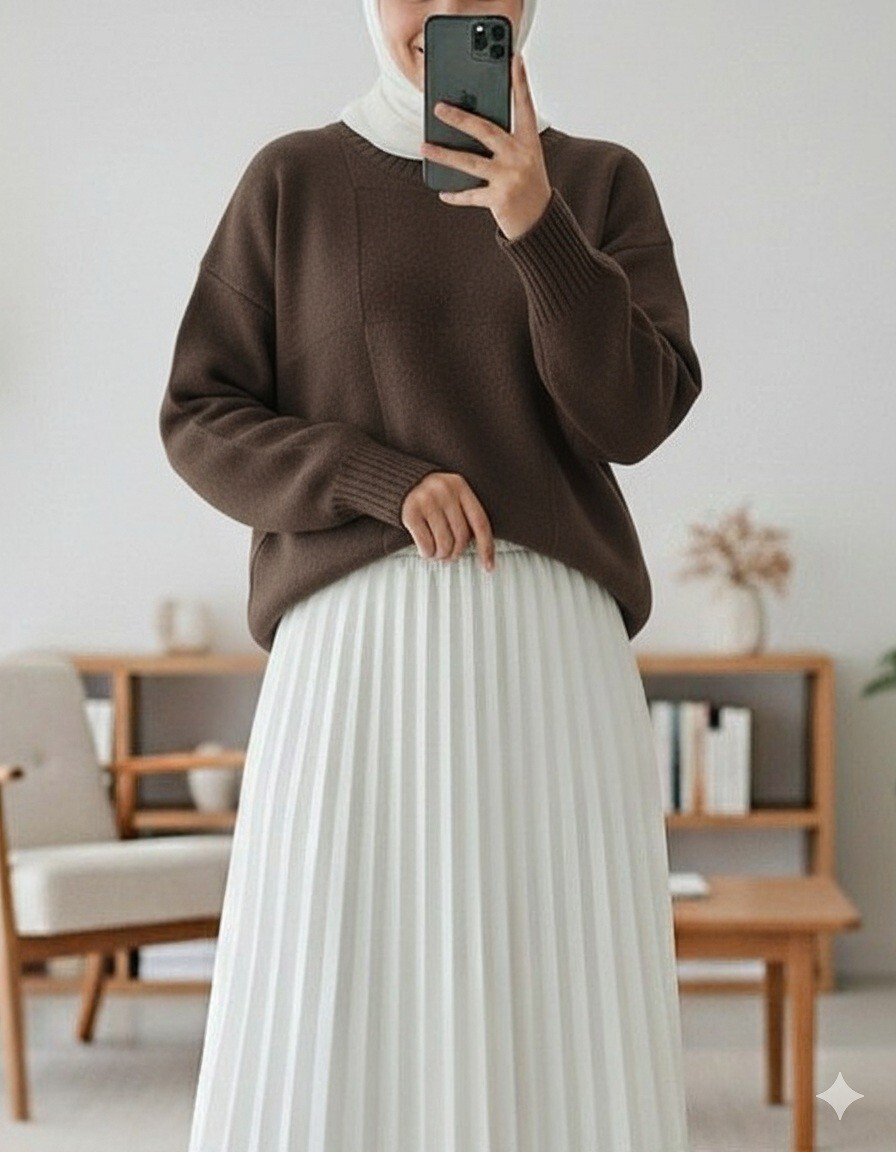 Kare Desenli Yuvarlak Yaka Yumoş Kazak -Kahve-Kahve