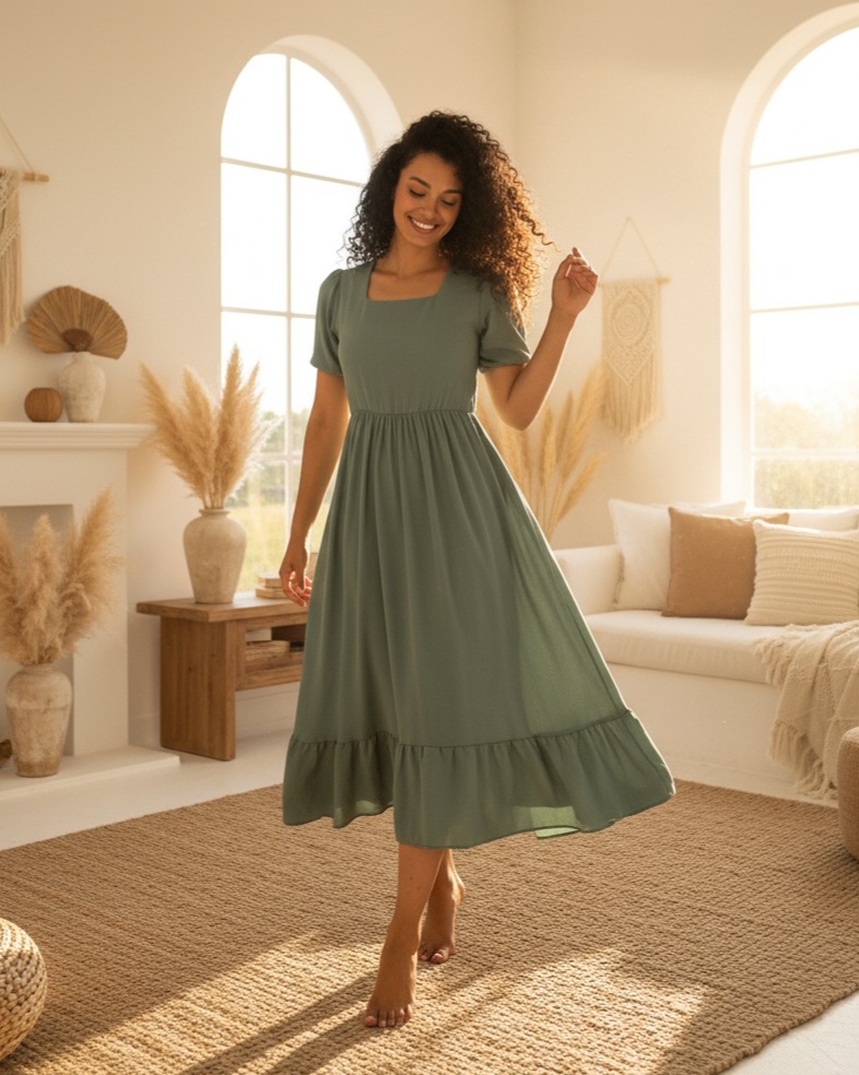 Kare Yaka Beli Lastikli Kısa Kol Ayrobin Elbise -Mint-Mint