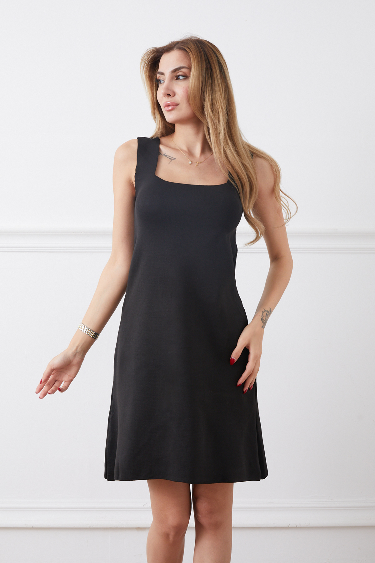 Kare Yaka Kalın Askılı Triko Elbise-Siyah