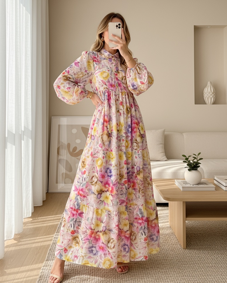 Karışık Çiçek Baskılı Yarım Düğmeli Parçalı Elbise -Sarı-Sarı