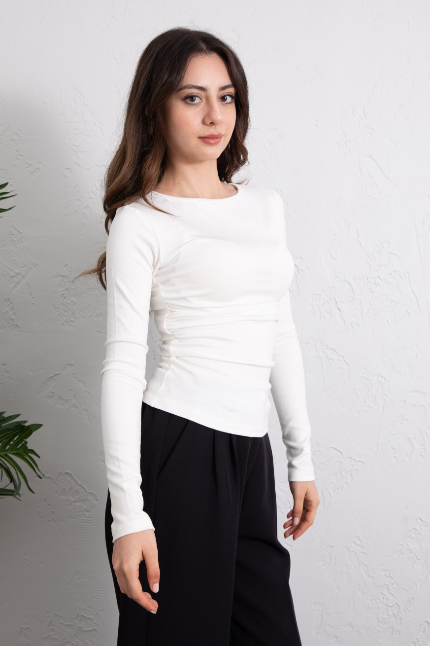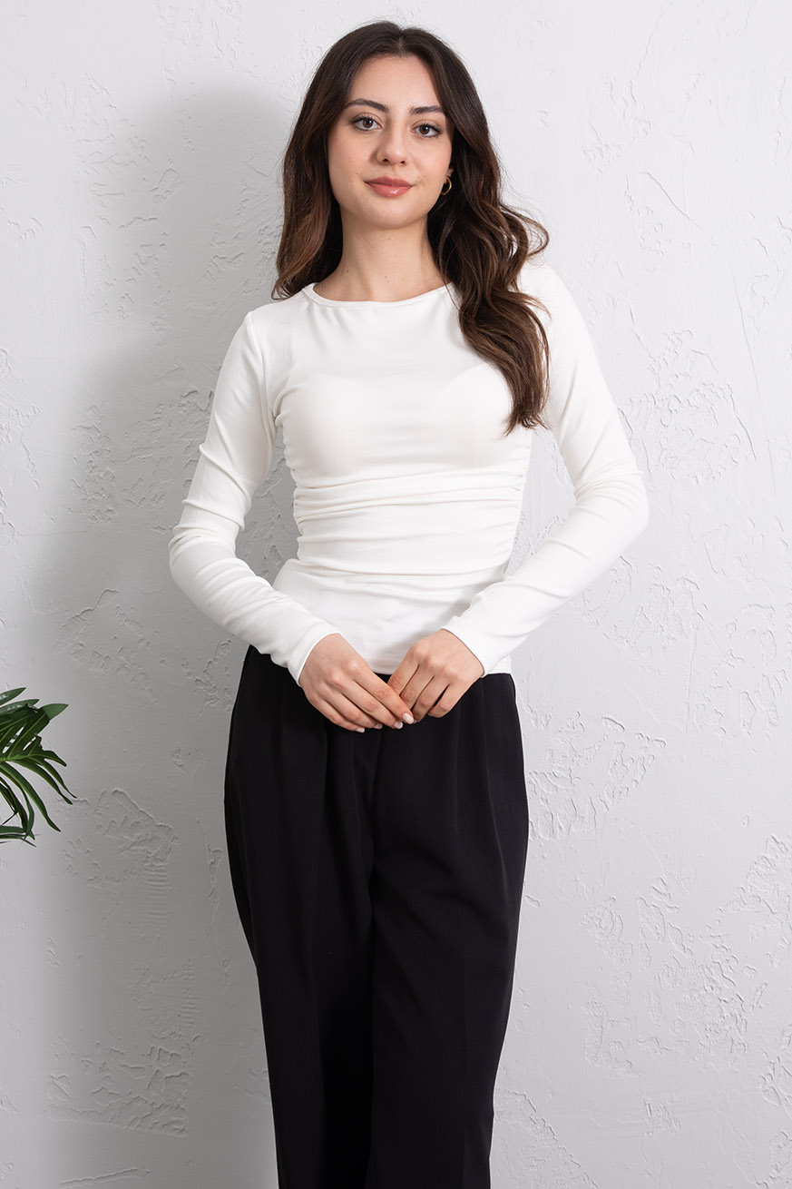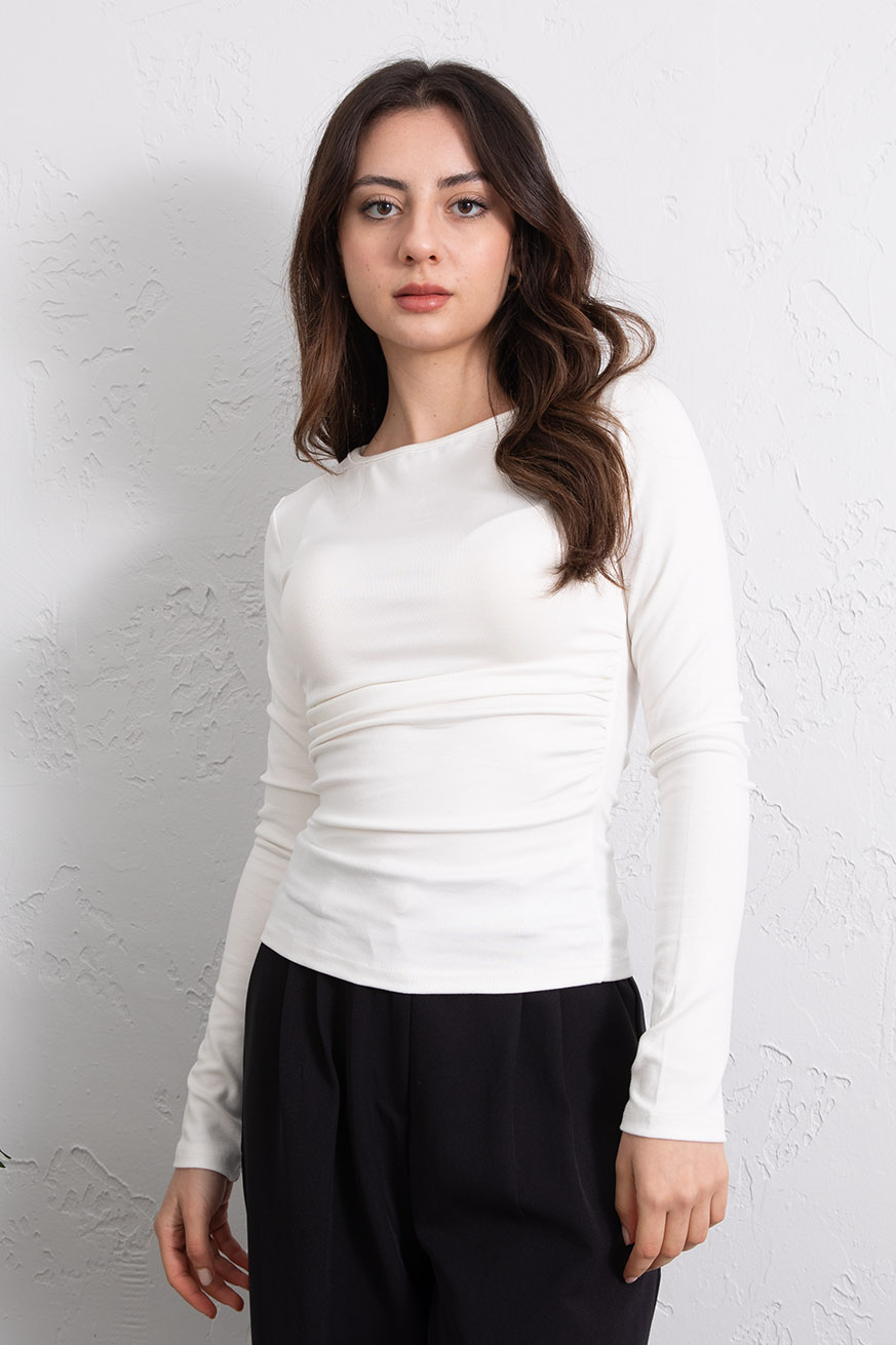 Kayık Yaka Ribanalı Yanları Büzgülü Bluz Ekru - 5156-Ekru