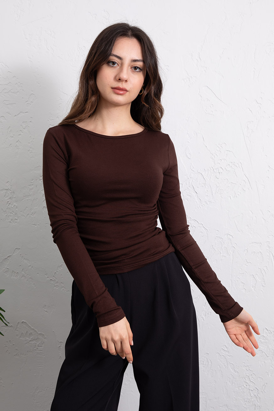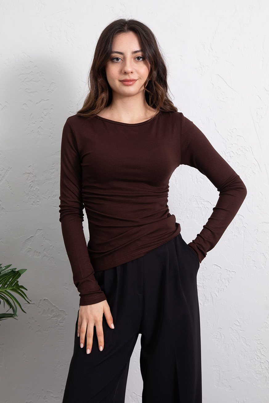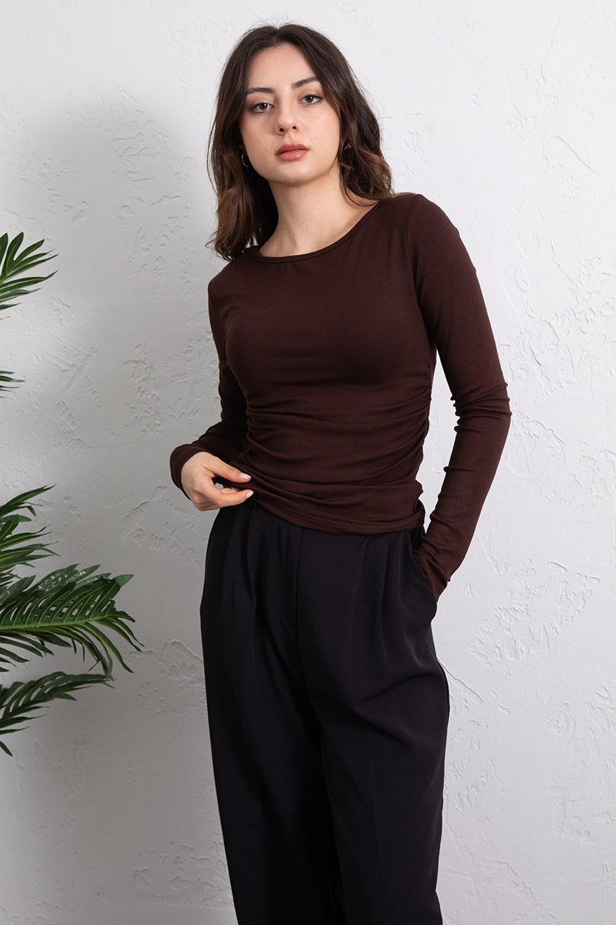 Kayık Yaka Ribanalı Yanları Büzgülü Bluz Kahve - 5156-Kahve