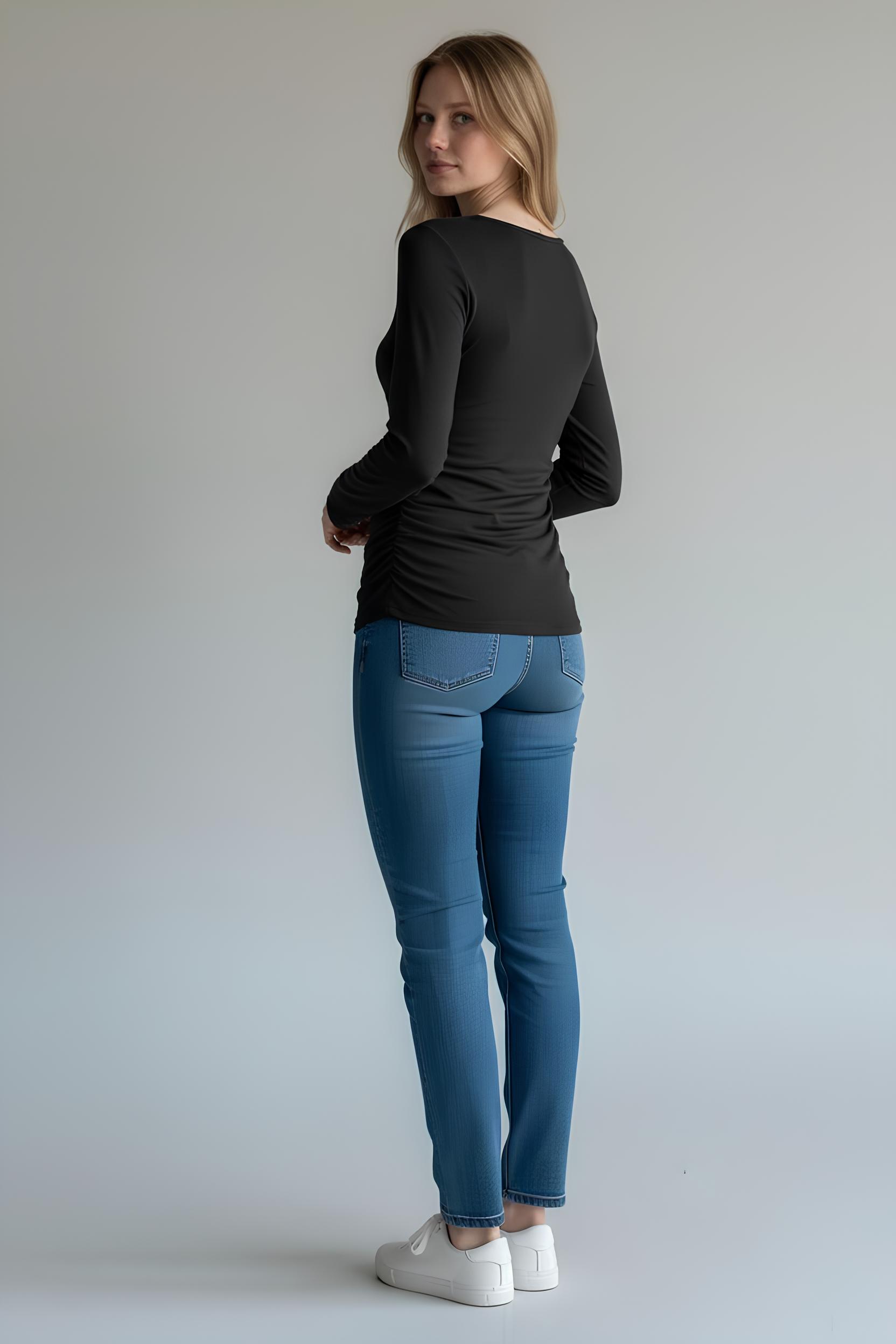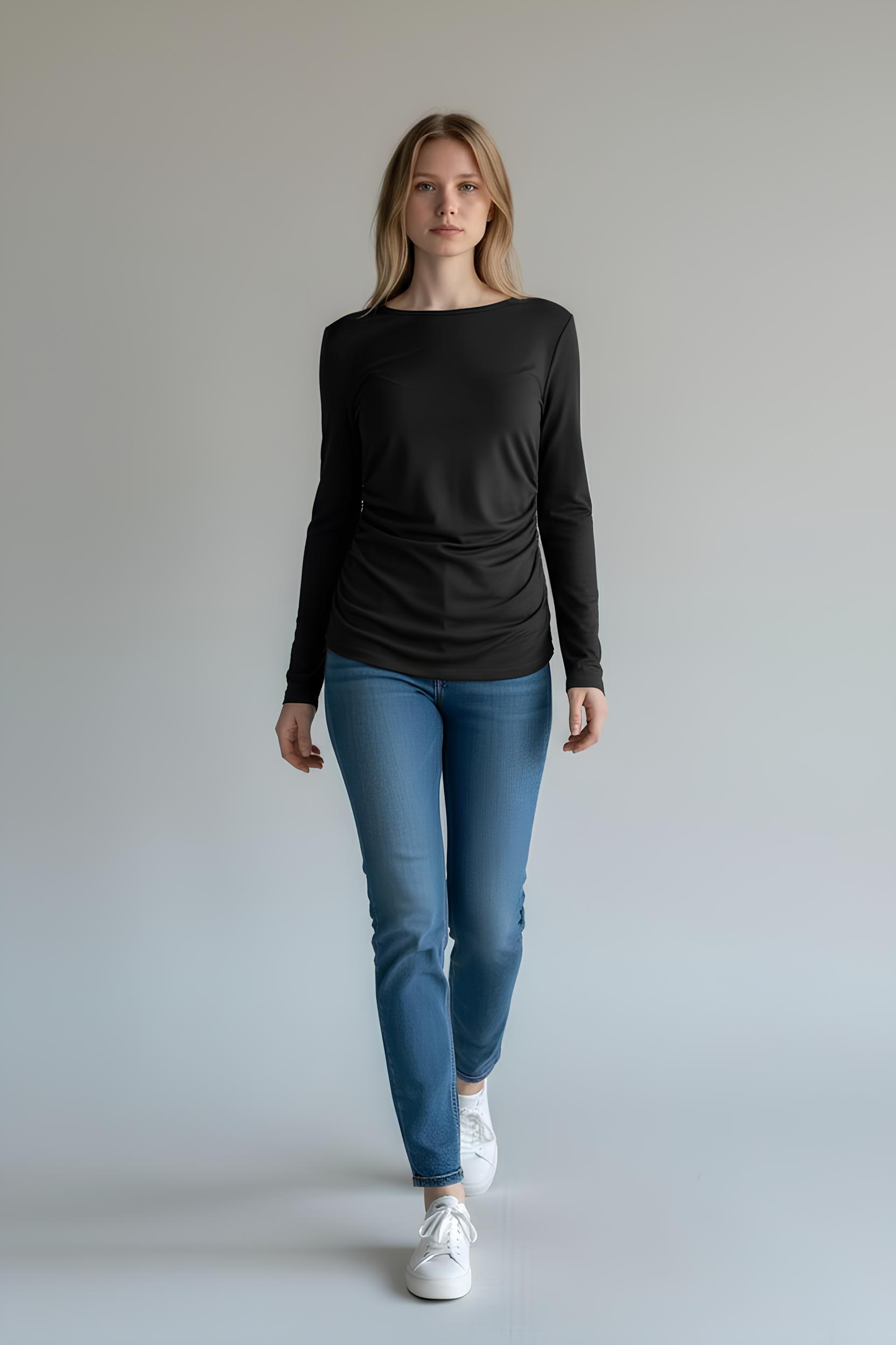 Kayık Yaka Ribanalı Yanları Büzgülü Bluz Siyah - 5156-Siyah