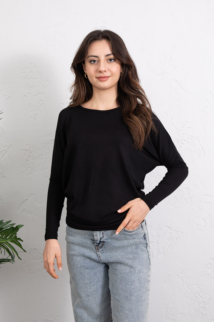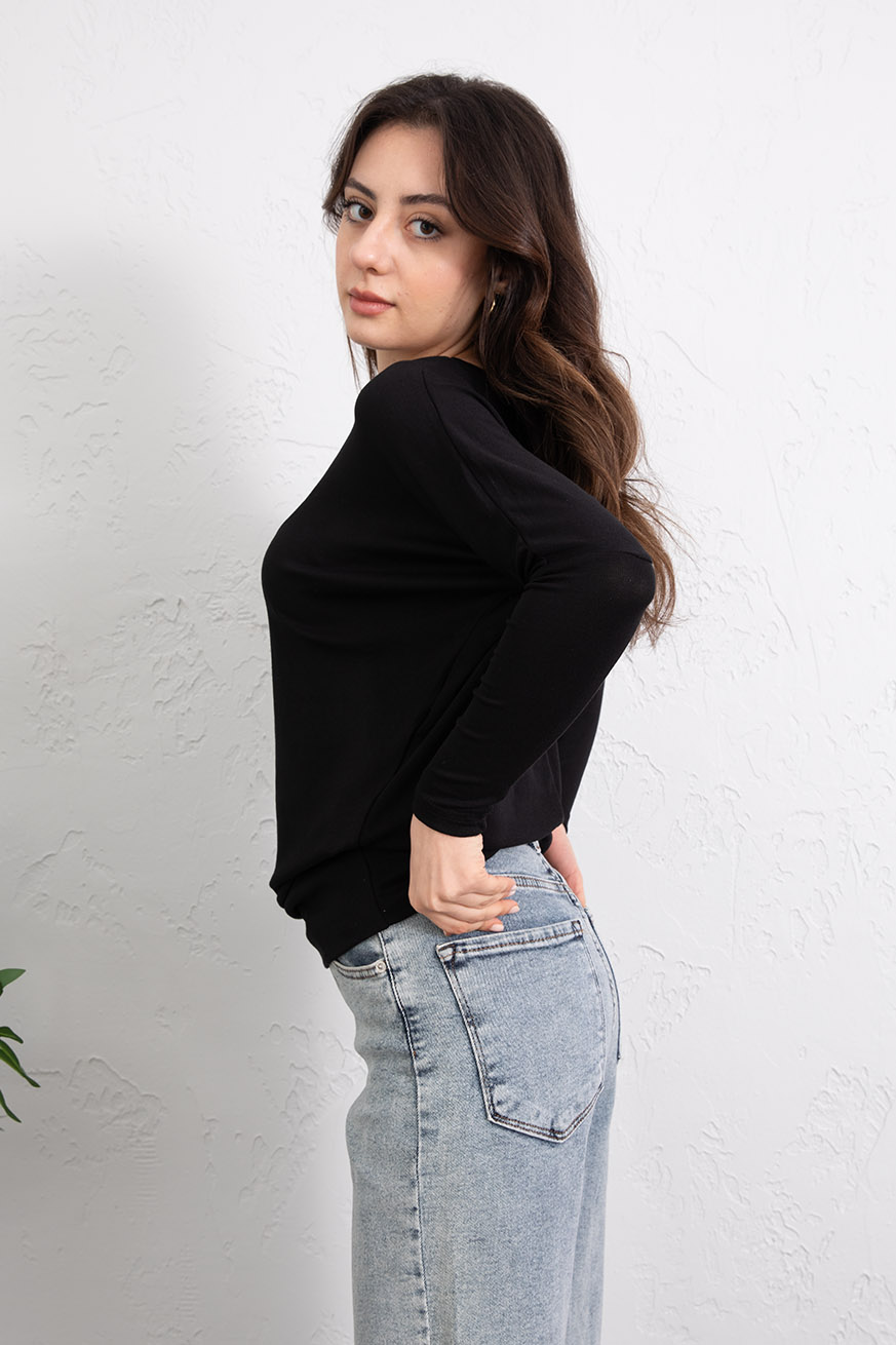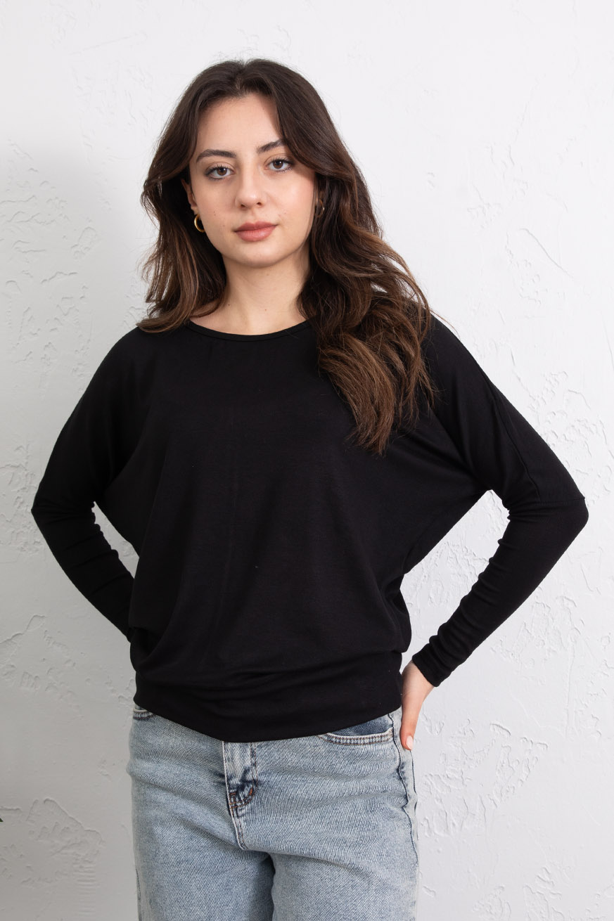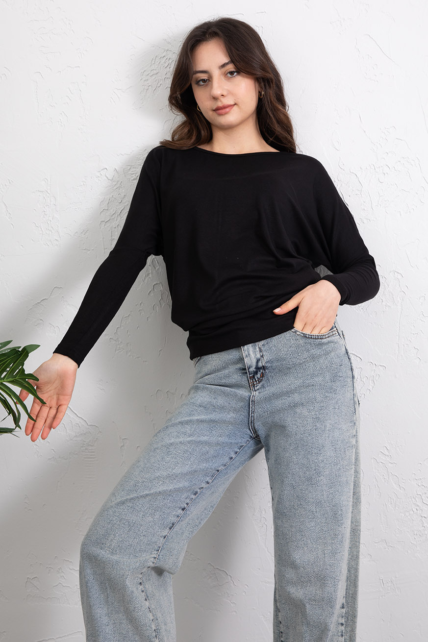 Kayık Yaka Ribanalı Yarasakol Bluz Siyah - 5162-Siyah