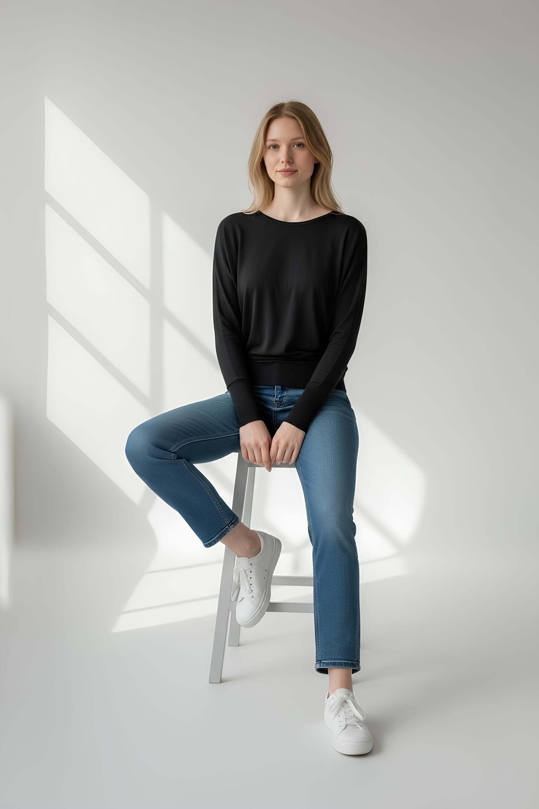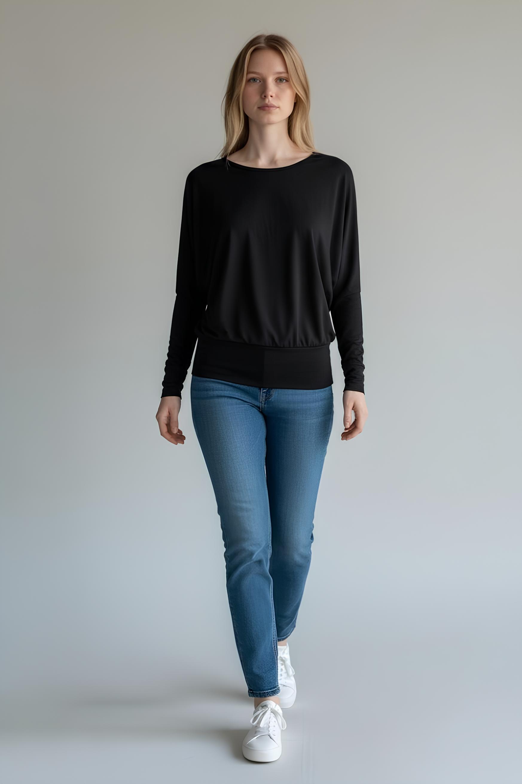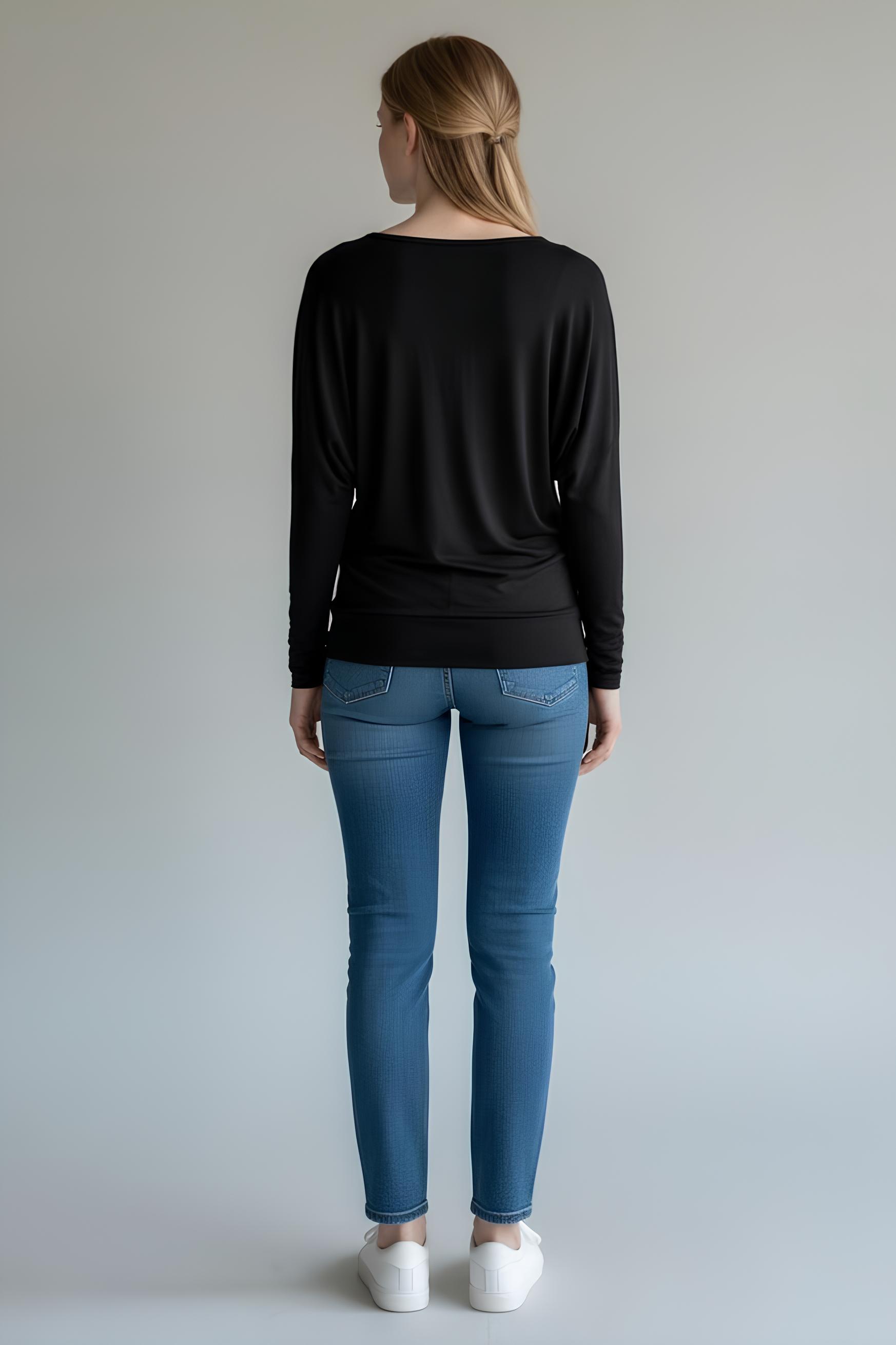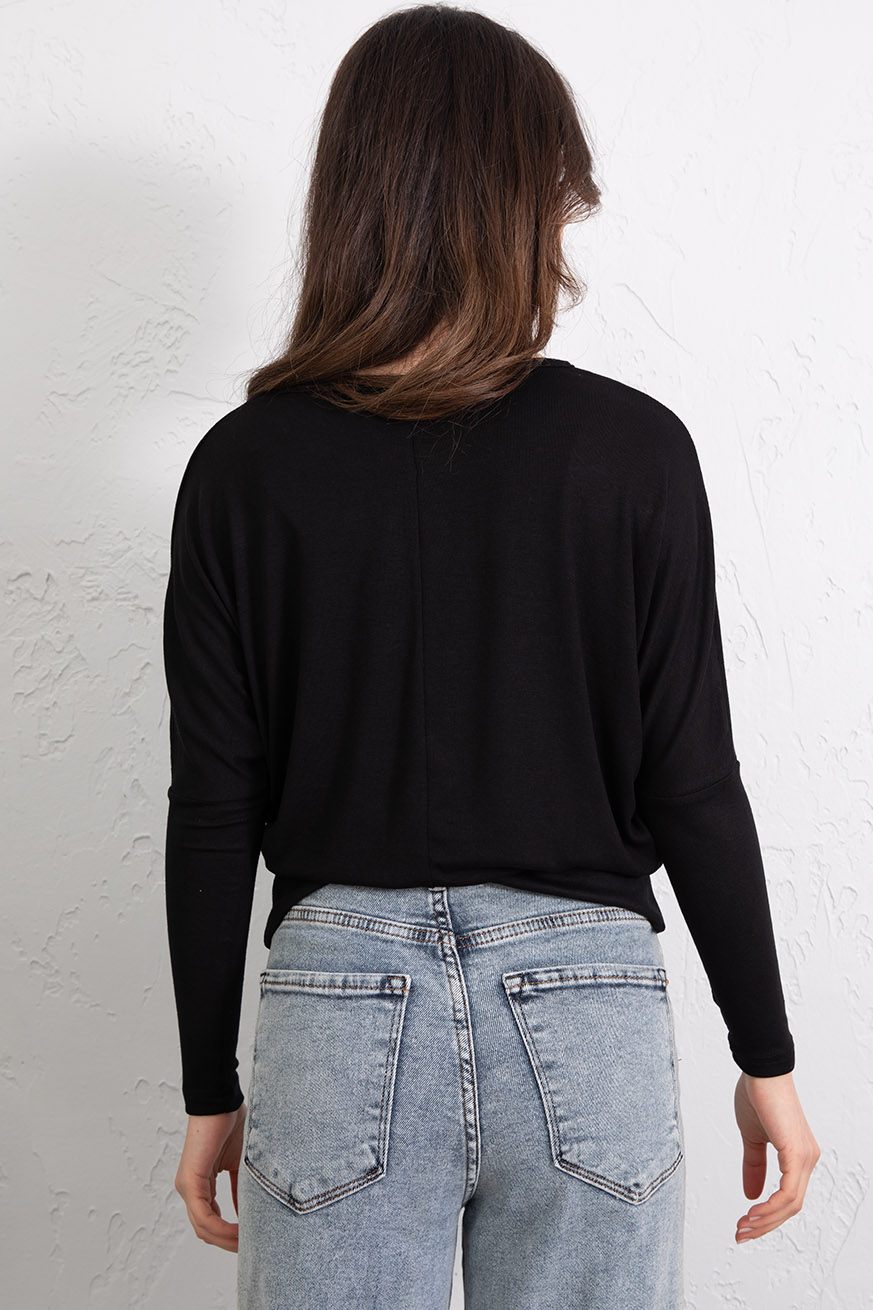 Kayık Yaka Ribanalı Yarasakol Bluz Siyah - 5162-Siyah