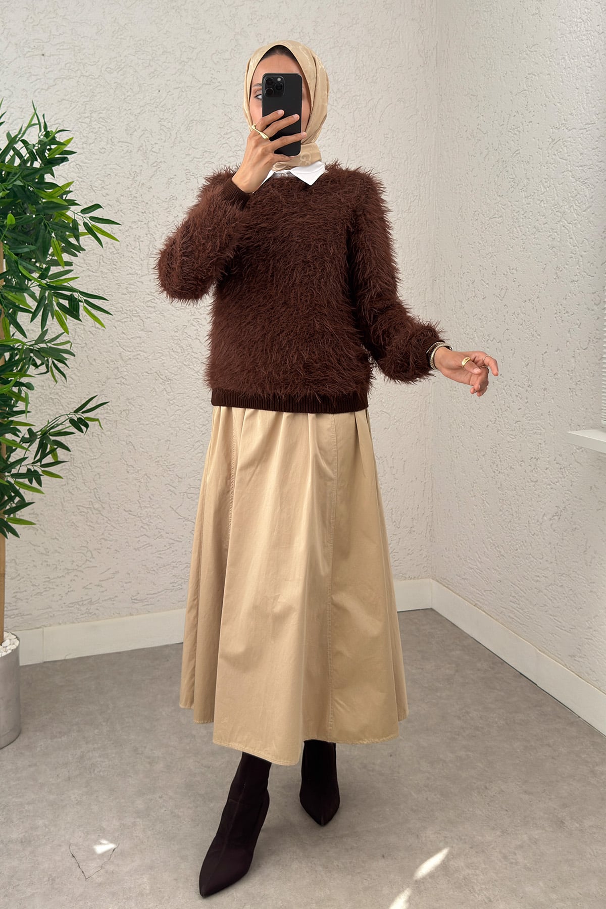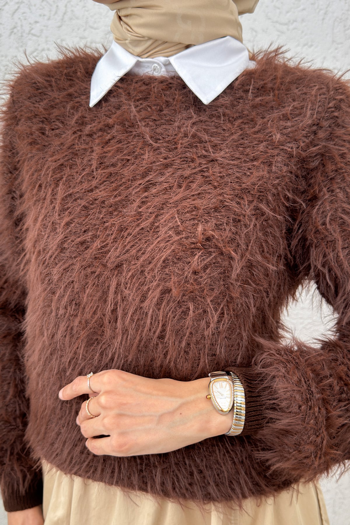 Kayık Yaka Sakallı Triko Kazak Kahve-Kahve