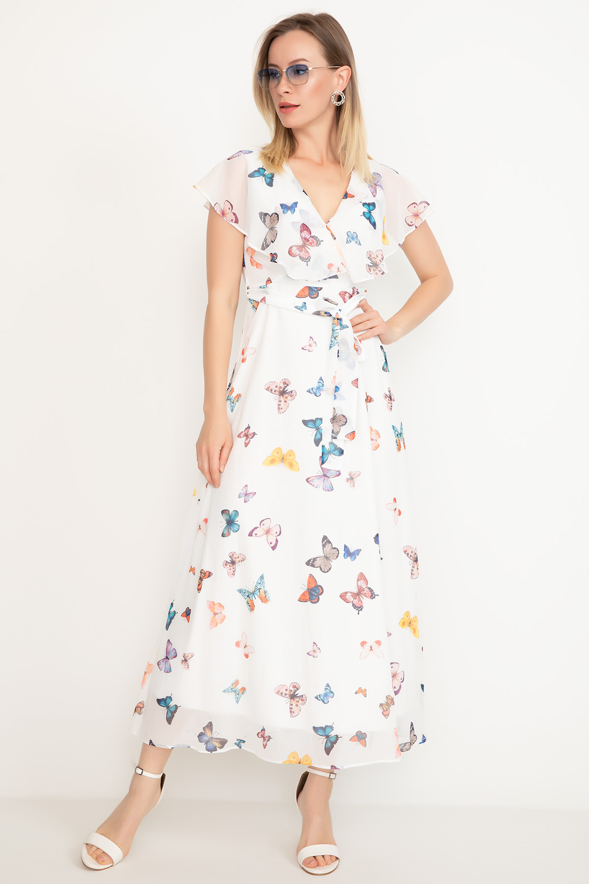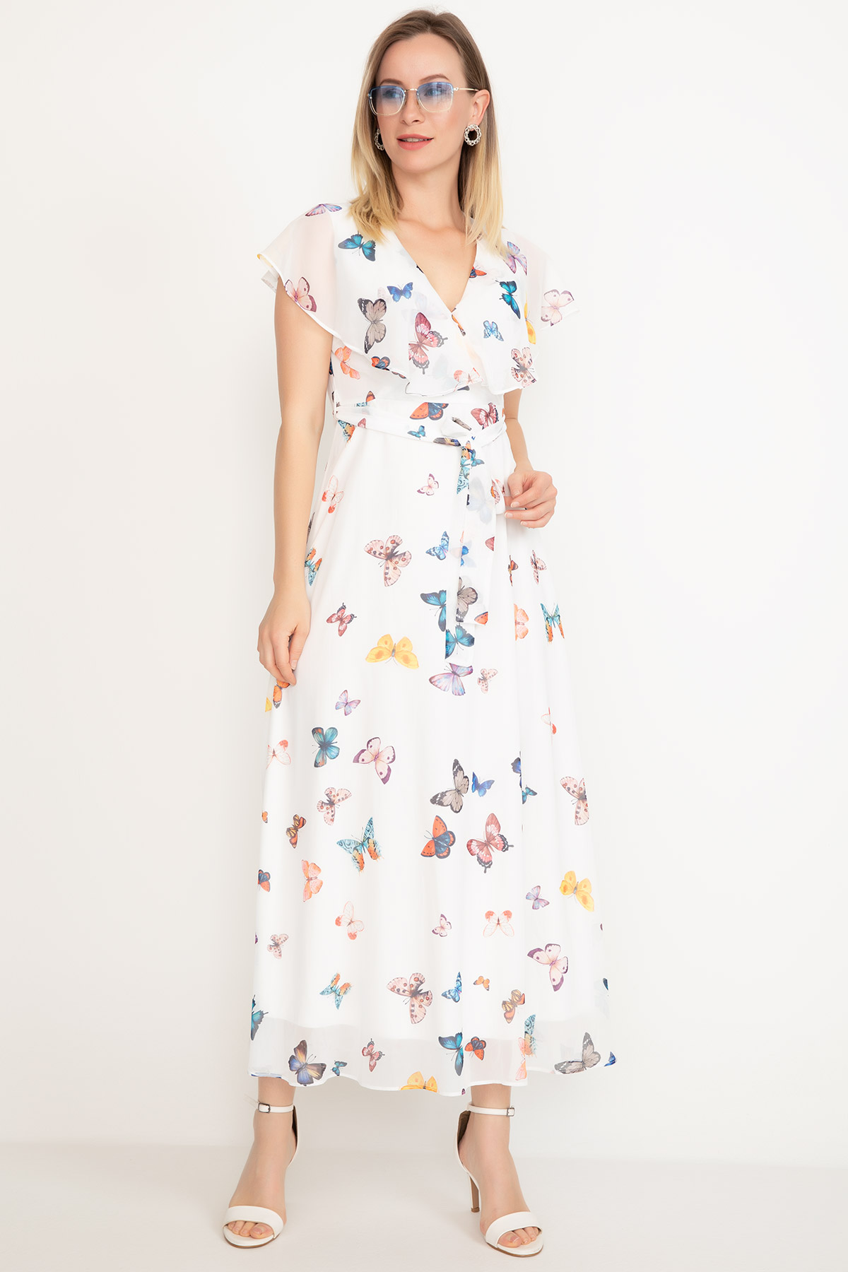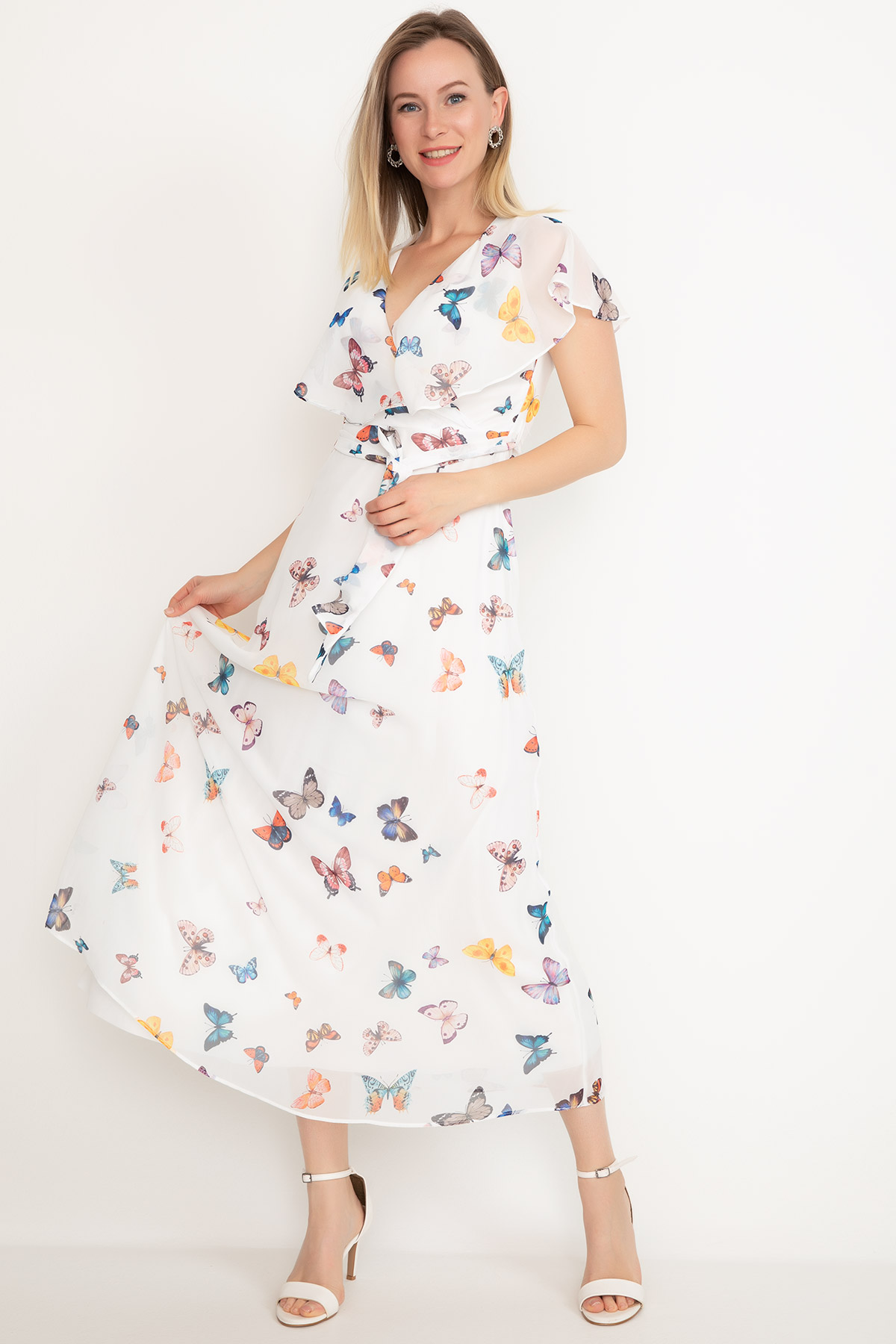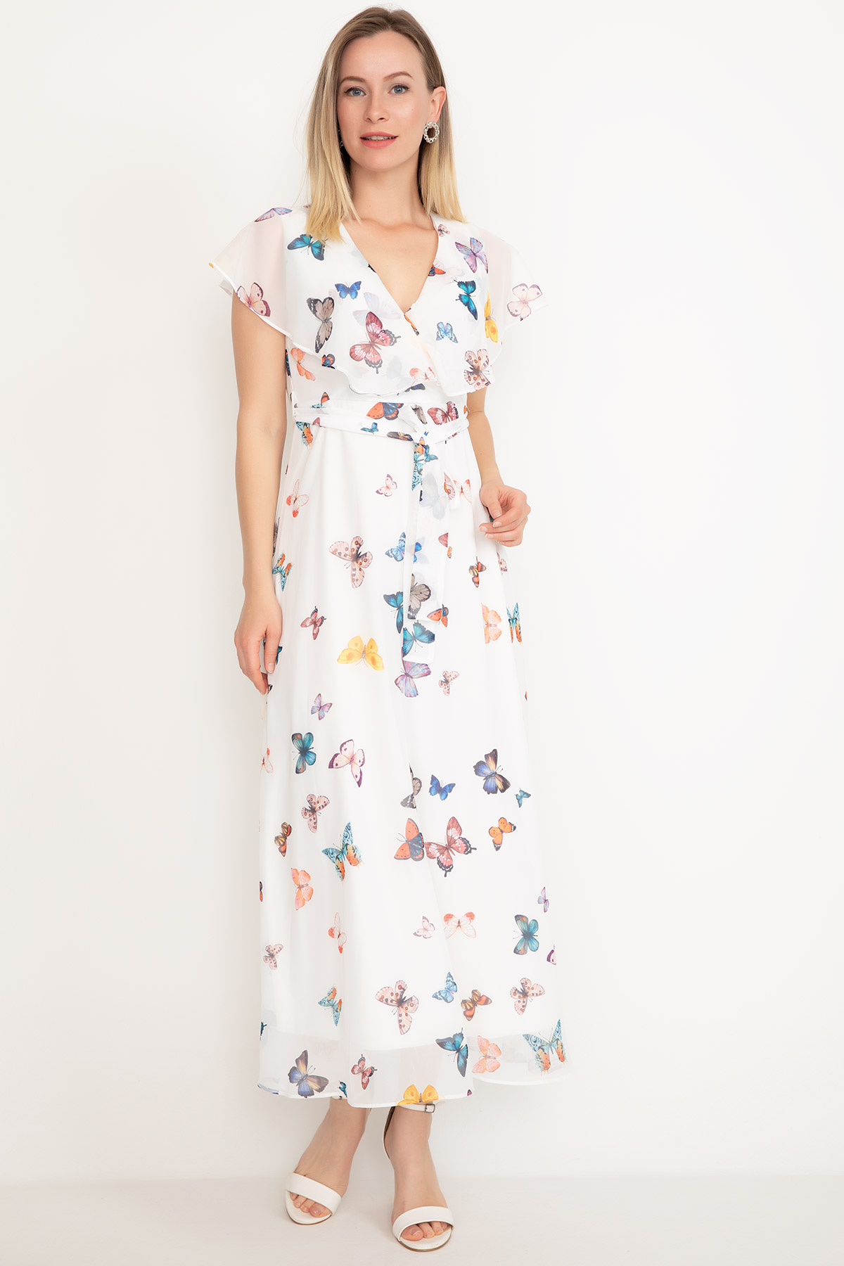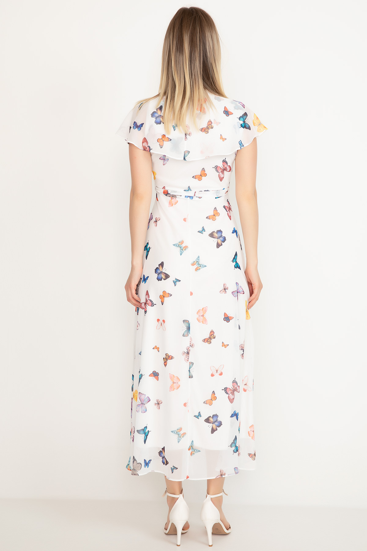 Kelebek Desenli Şifon Elbise-Krem