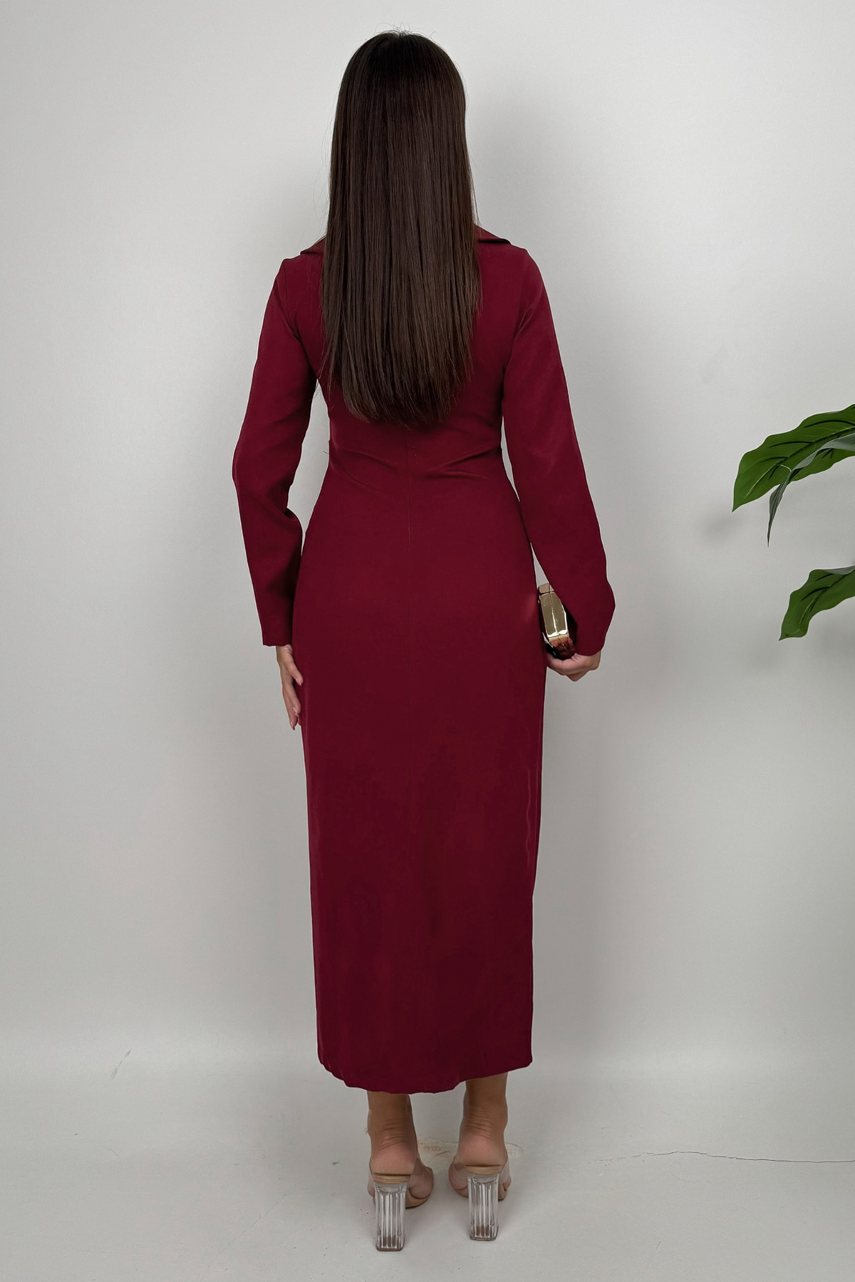 Kemer Detaylı Cepli Uzun Elbise-Bordo