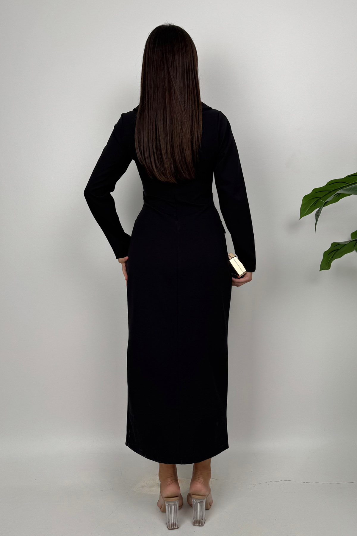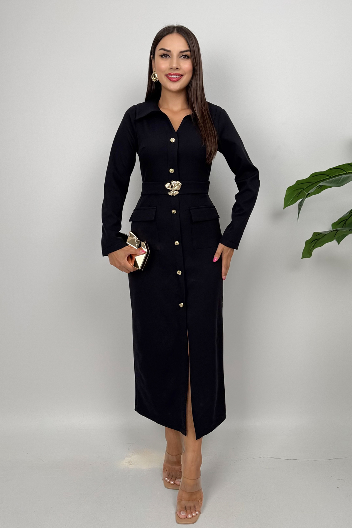 Kemer Detaylı Cepli Uzun Elbise-Siyah