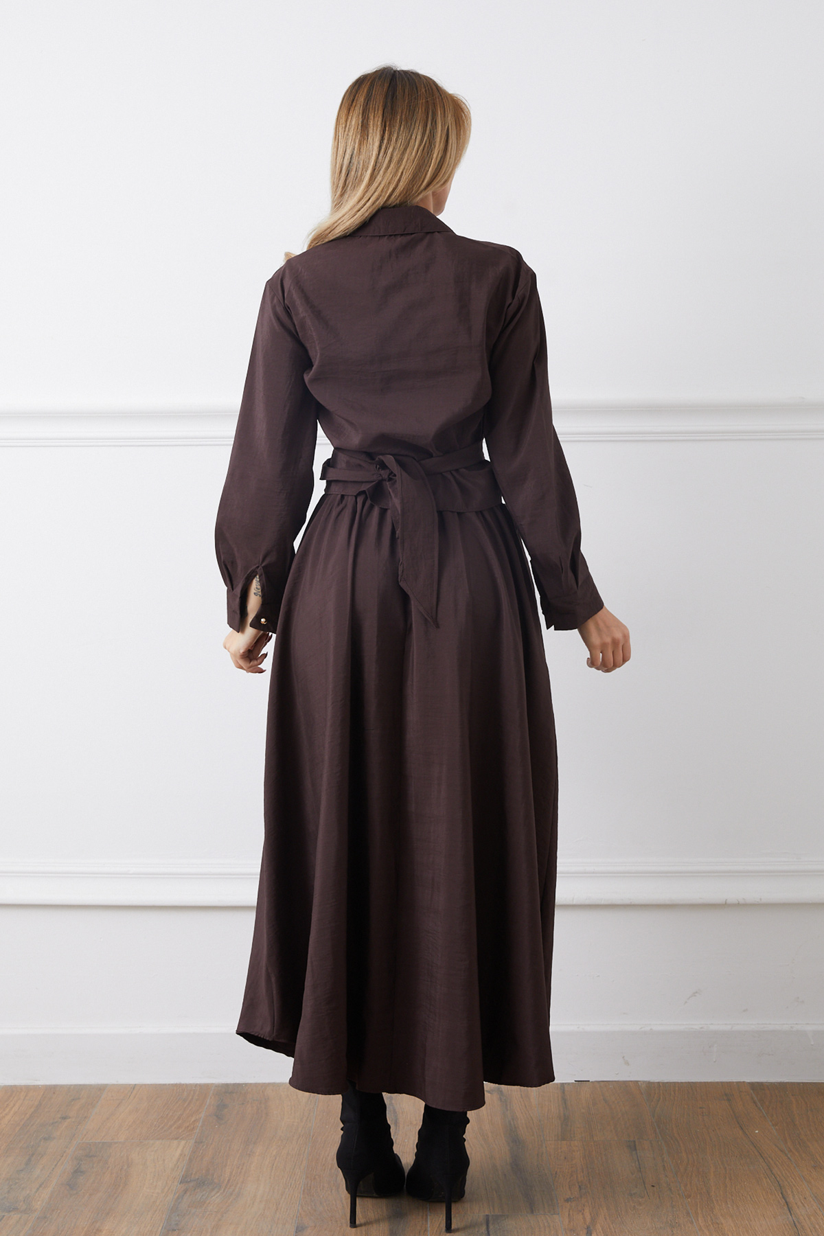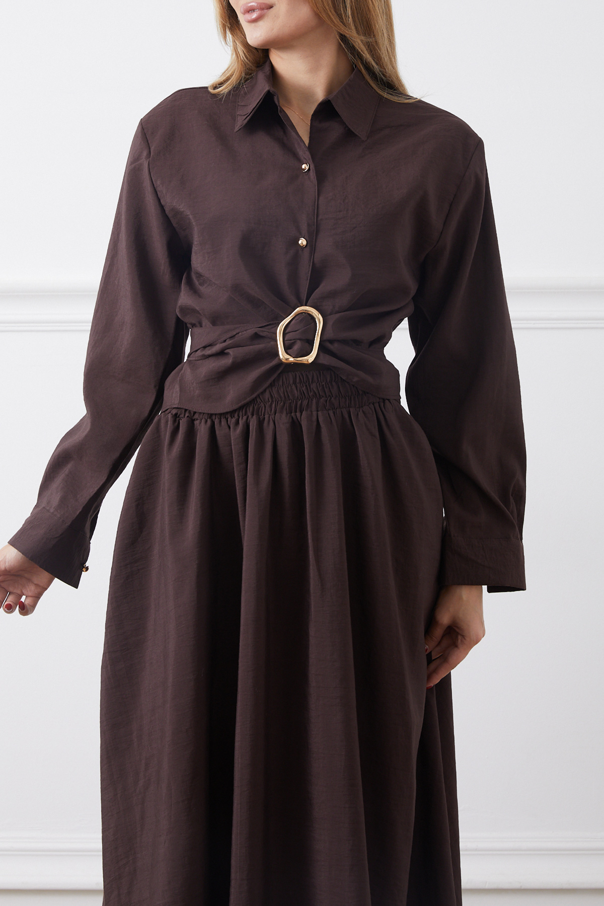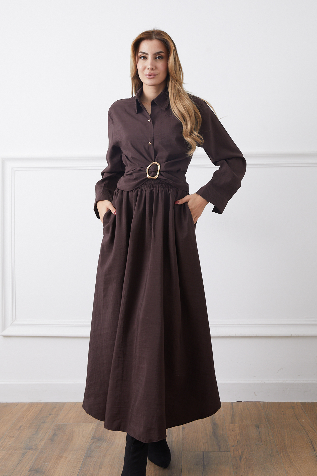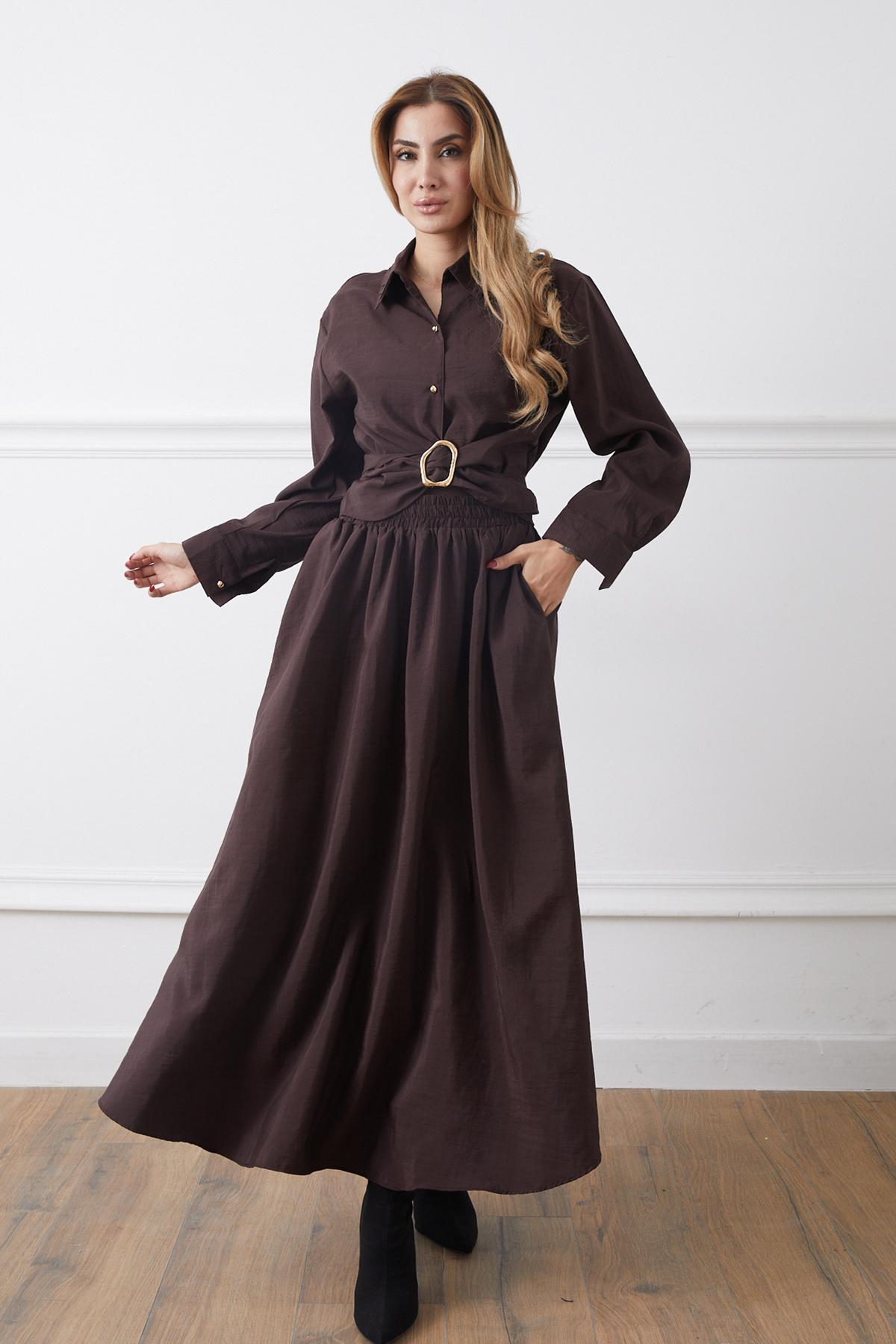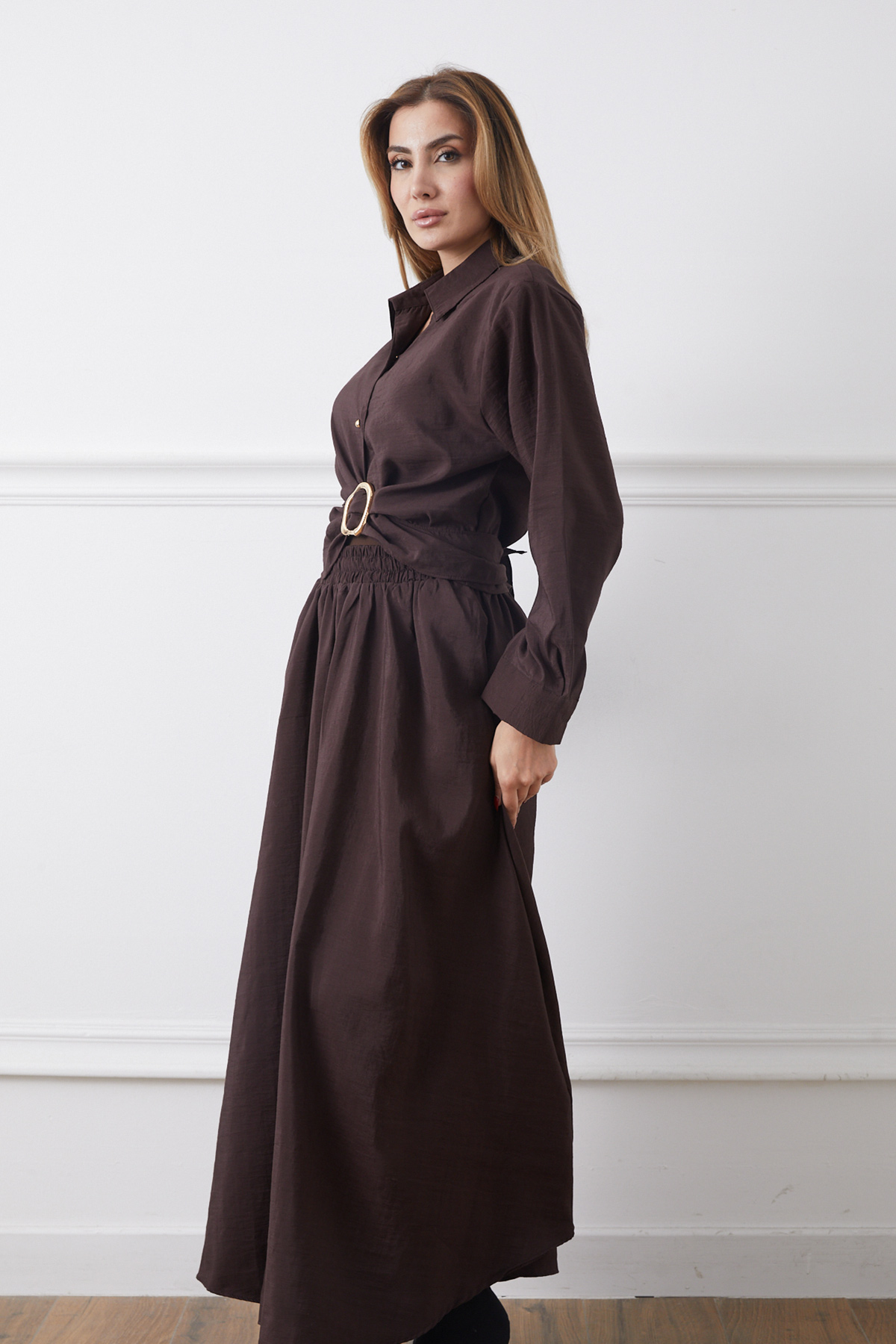Kemer Detaylı Gömlek Etek İkili Takım-Kahve