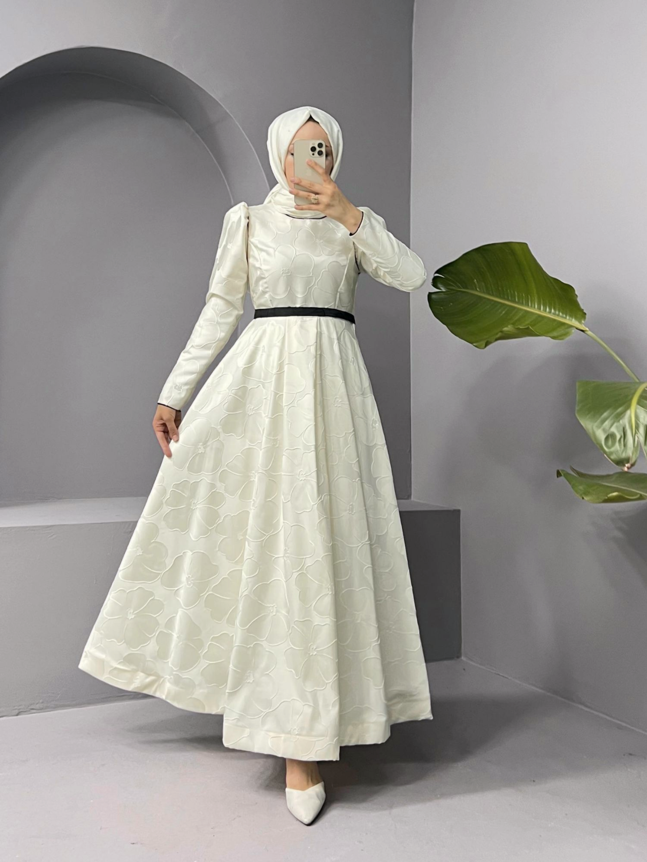 Kemerli Balon Etek Soğuk Baskı Kaftan Abiye Elbise -Beyaz-Beyaz