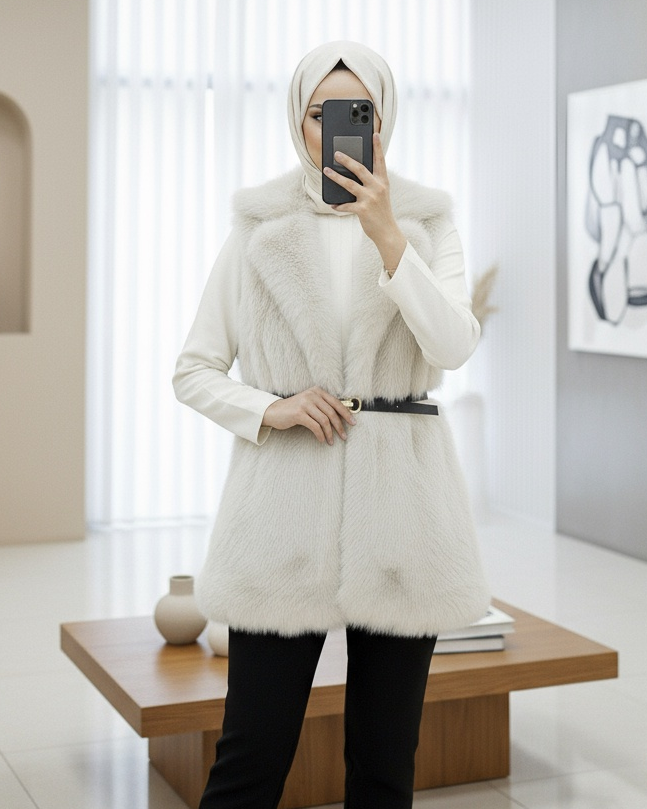 Kemerli Düğmeli Kürklü Astarlı Yelek -Krem-Krem