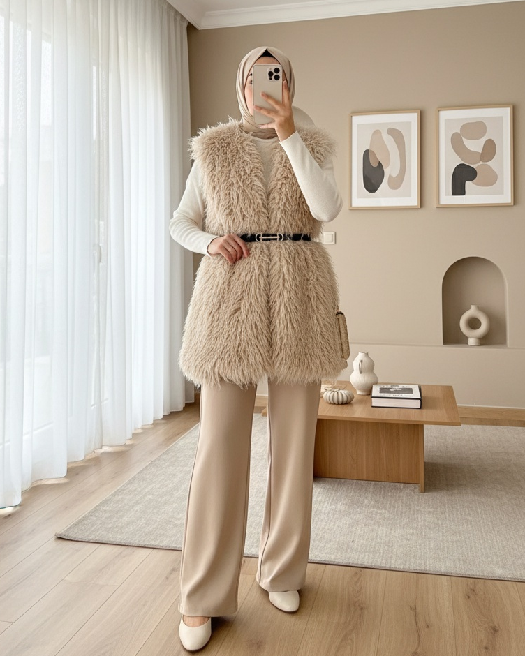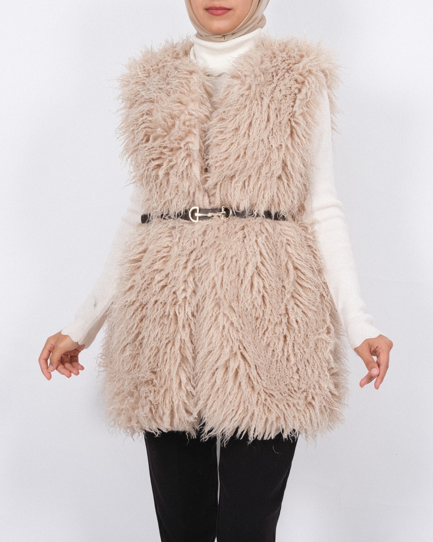 Kemerli Yan Cepli Kürklü Astarlı Yelek -Açık Vizon-Açık Vizon