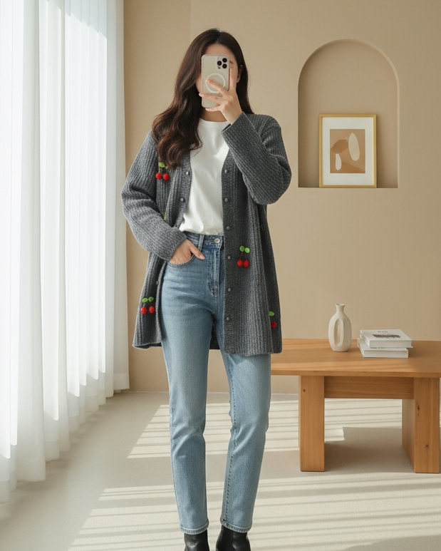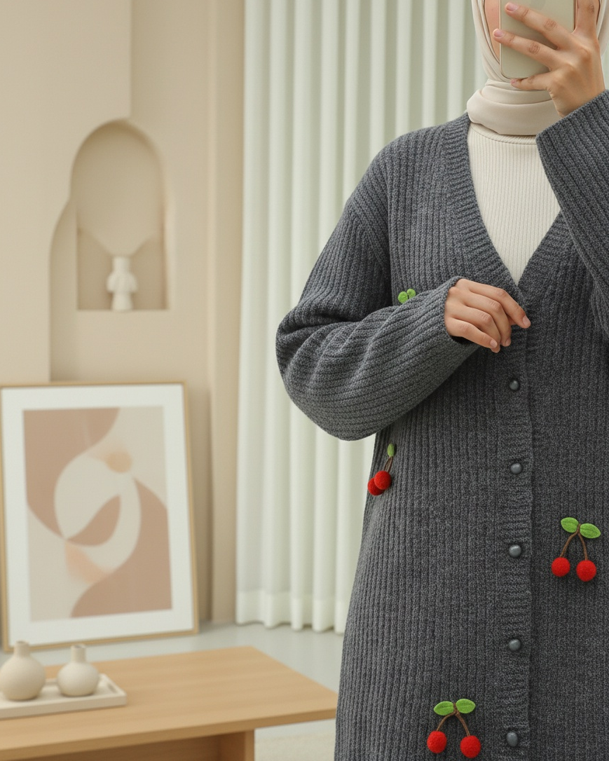 Kirazlı Top Düğmeli Triko Hırka -Füme-Füme