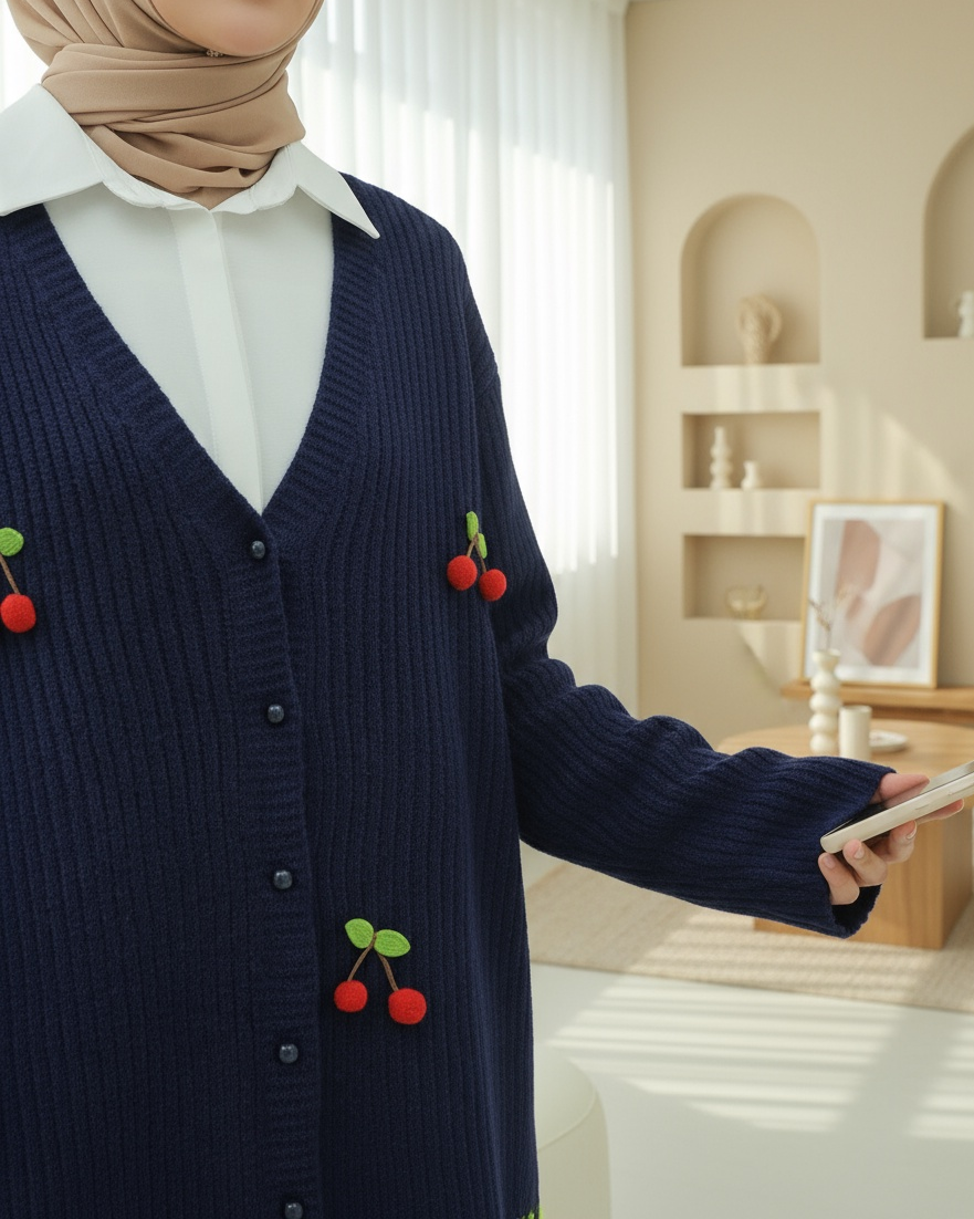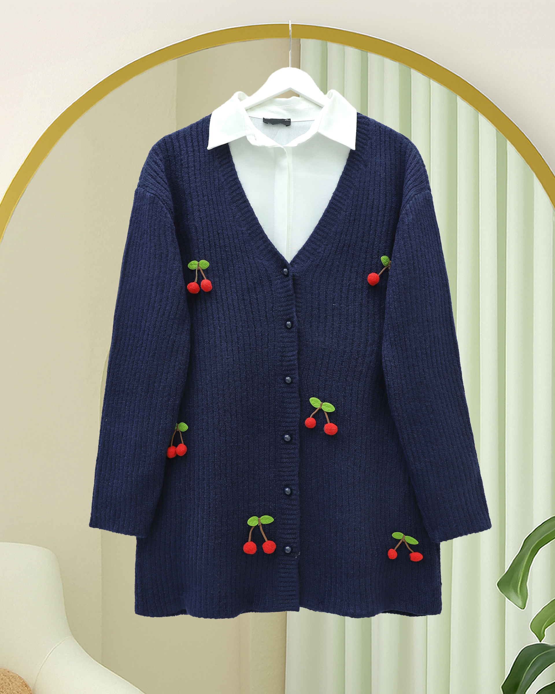 Kirazlı Top Düğmeli Triko Hırka -Laci-Lacivert