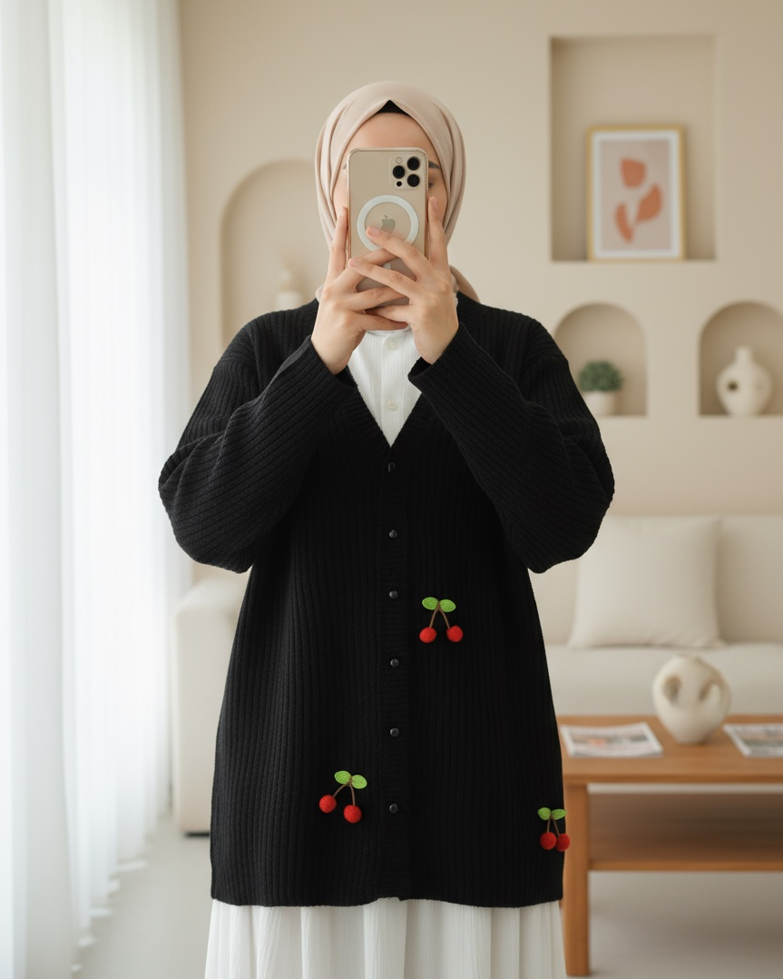 Kirazlı Top Düğmeli Triko Hırka -Siyah-siyah