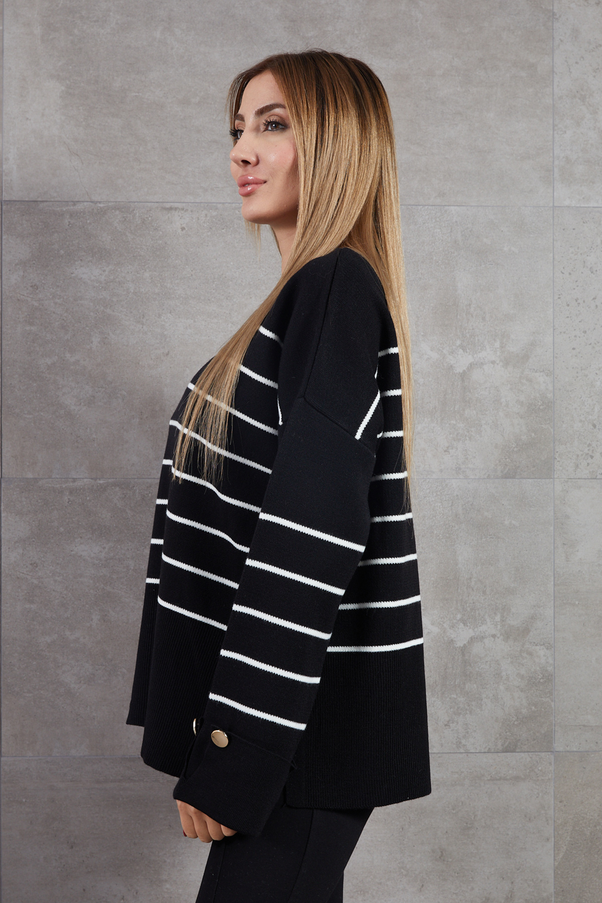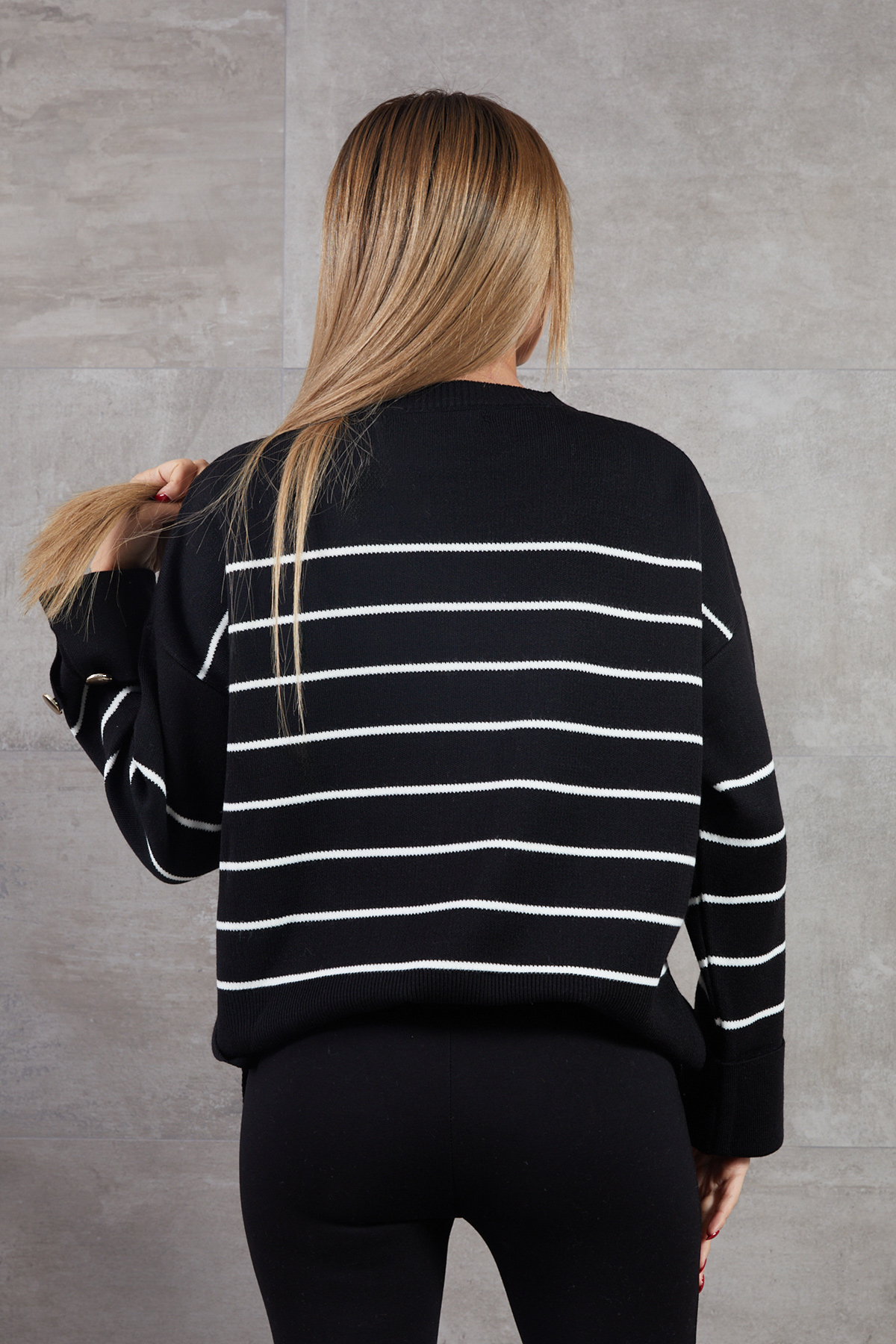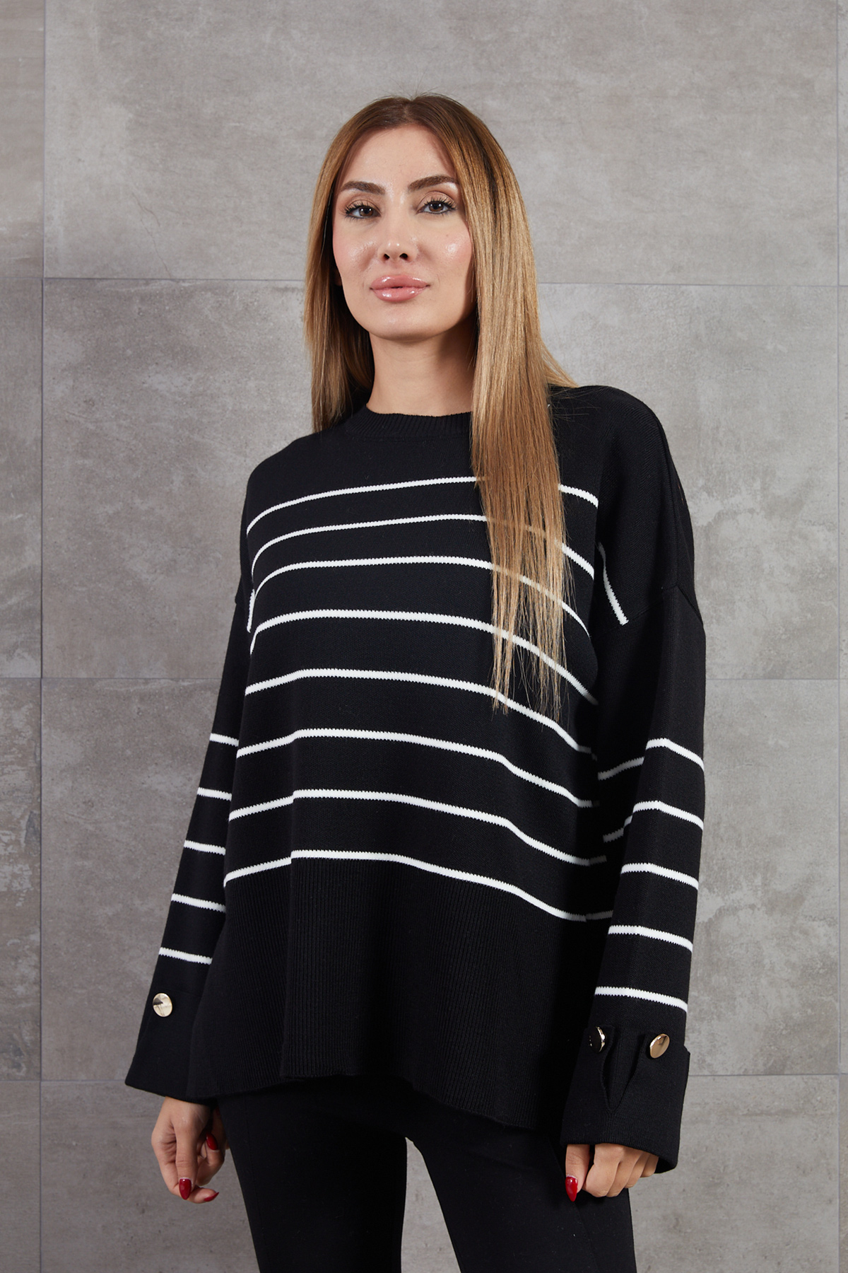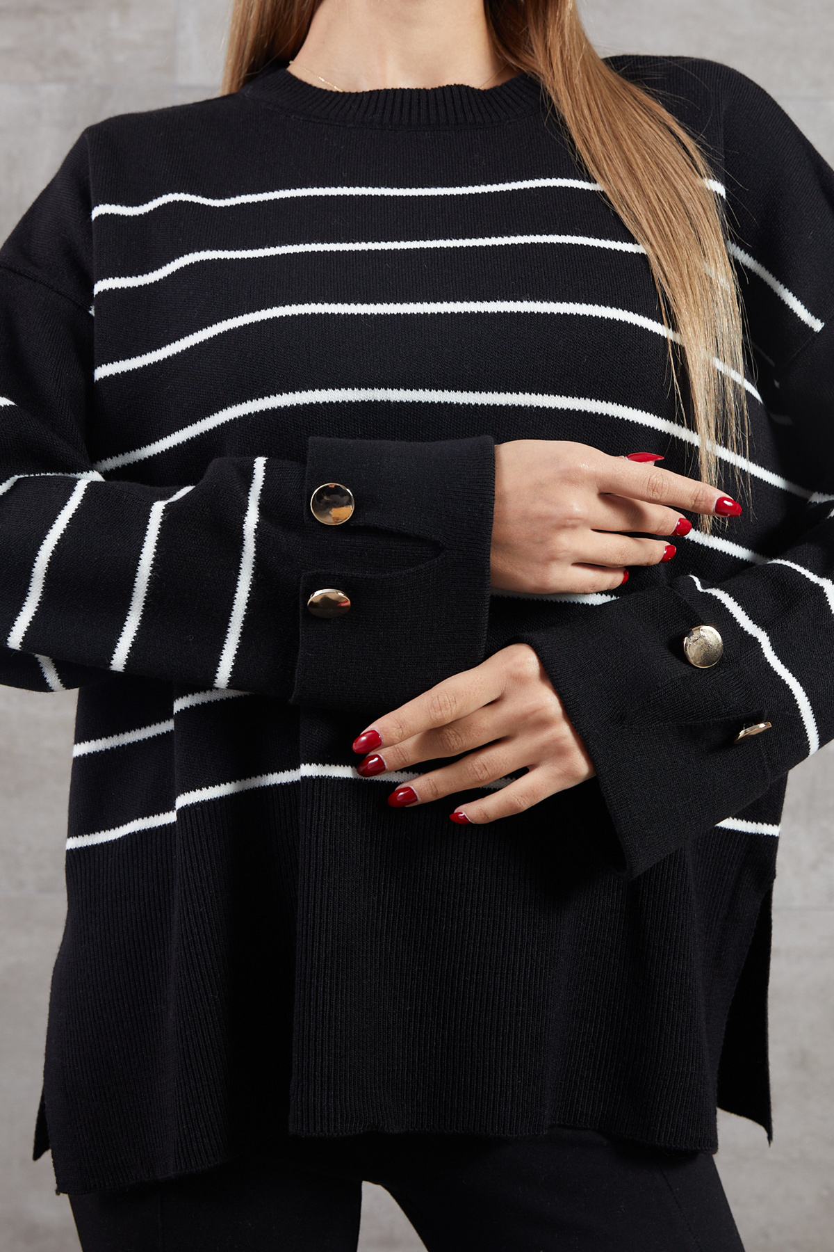 Kol Düğmeli Çizgili Triko Kazak-Siyah