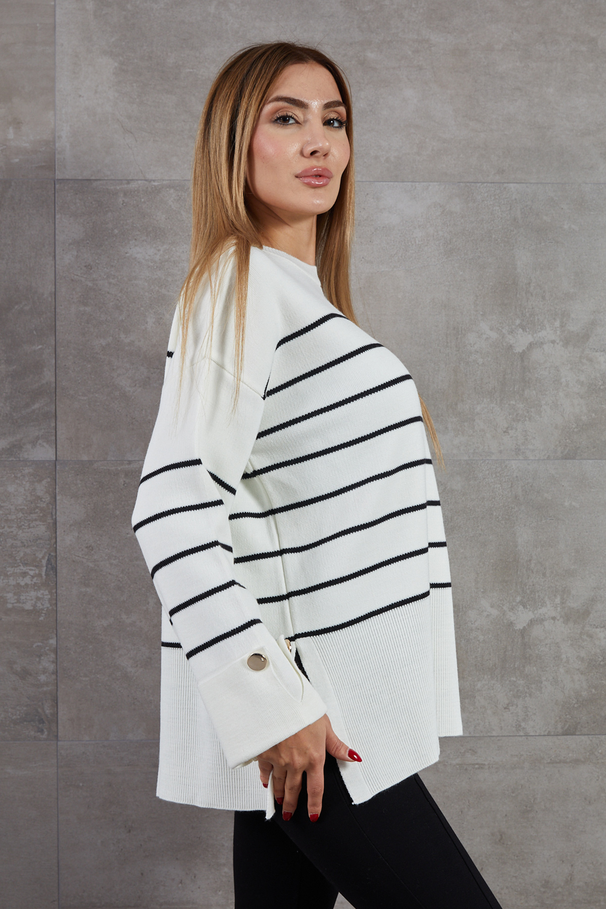 Kol Düğmeli Çizgili Triko Kazak-Ekru