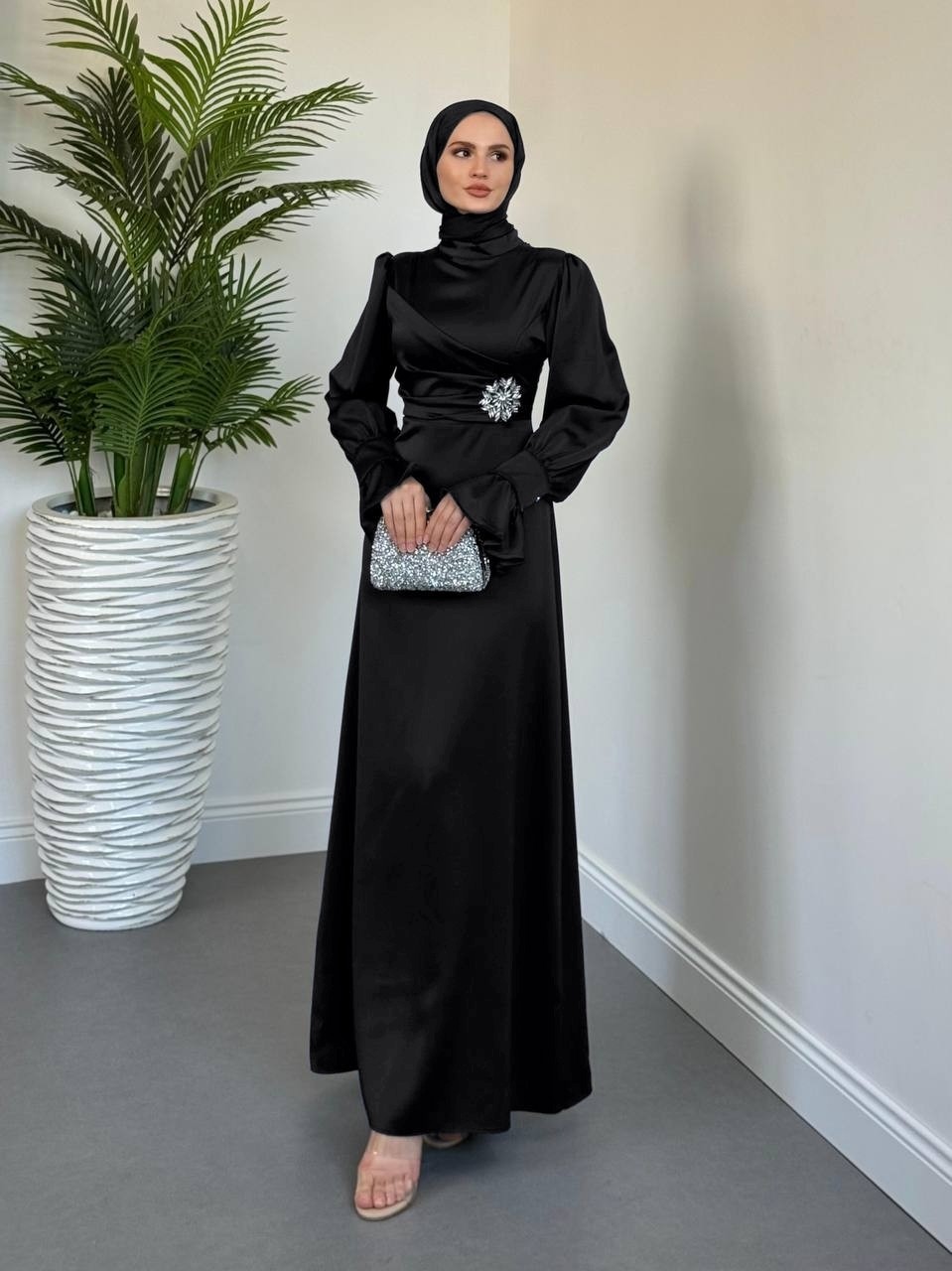 Kol Manşeti Fırıfrlı Önü Taş Detaylı Saten Elbise -Siyah-siyah
