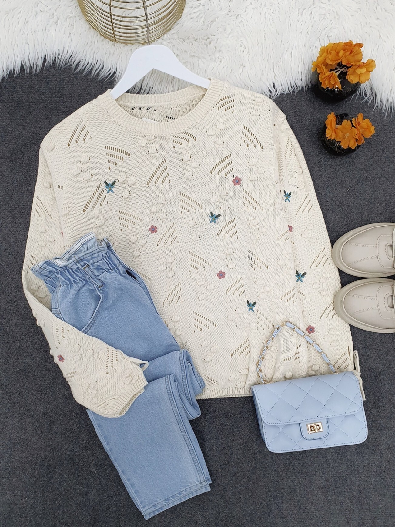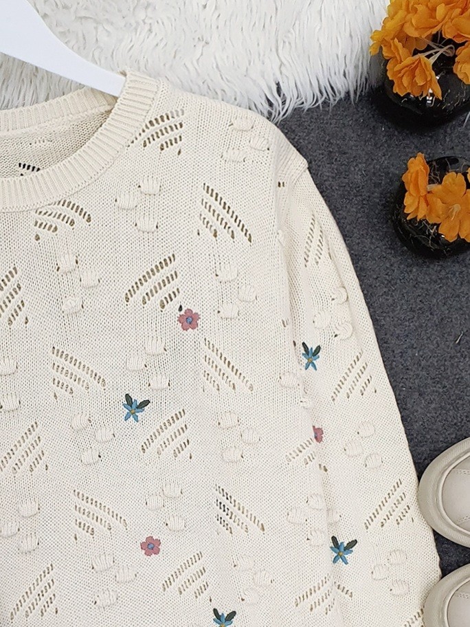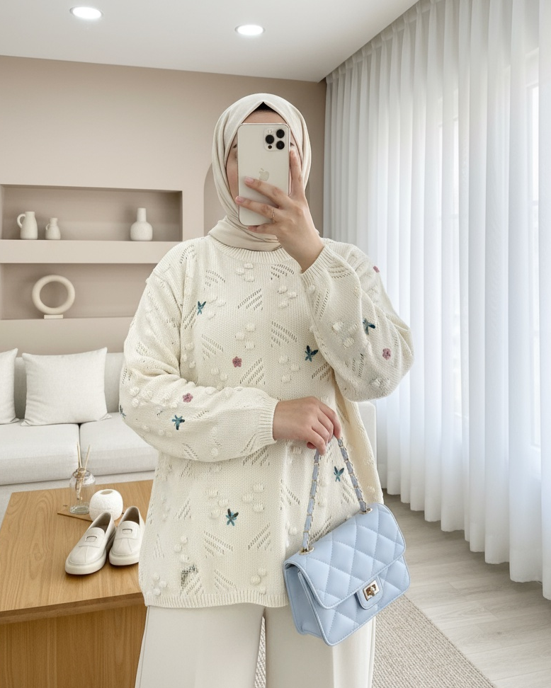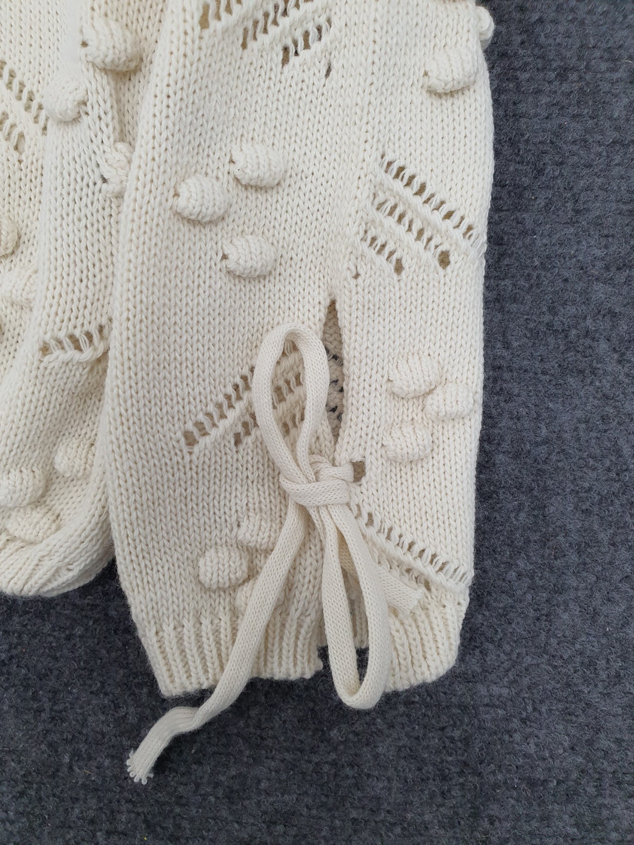 Kolları Bağcıklı Ponponlu Nakışlı Kazak -Krem-Krem