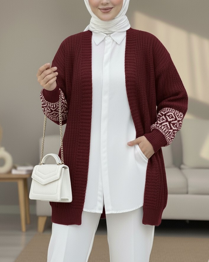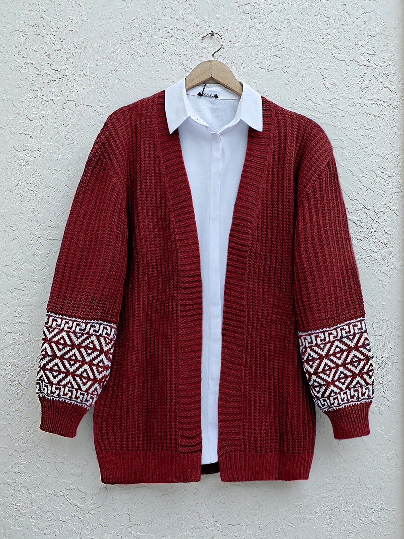 Kolları Desenli Triko Hırka -Bordo-Bordo
