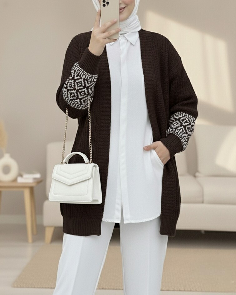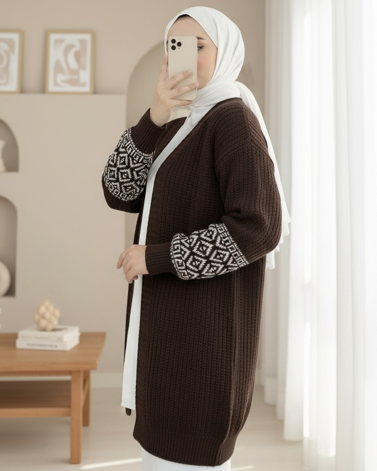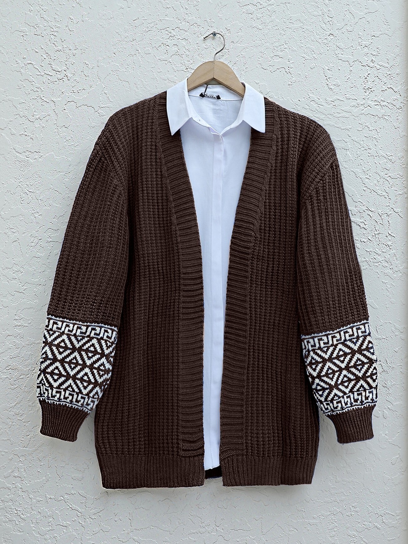 Kolları Desenli Triko Hırka -Kahve-Kahve