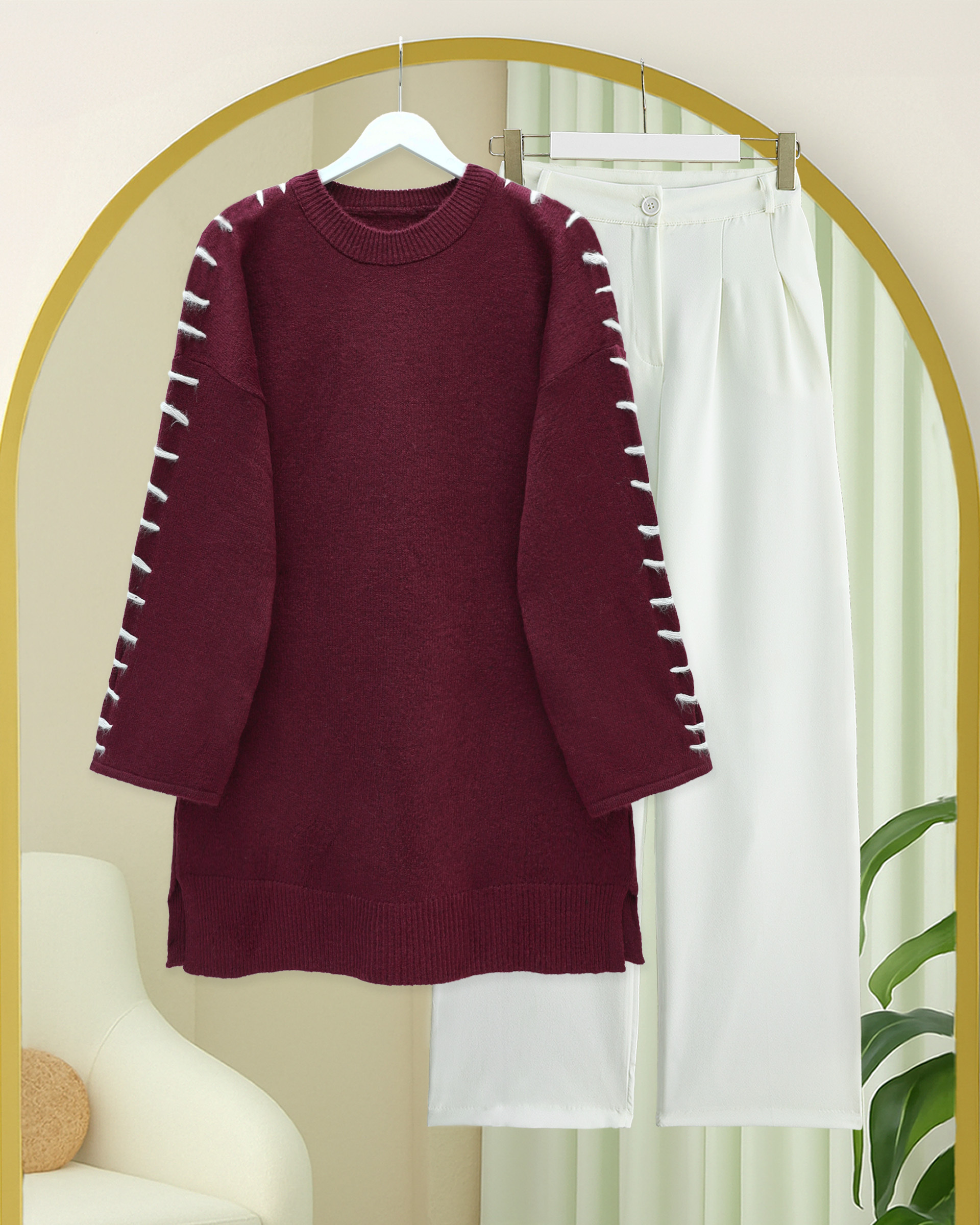 Kolları İpli Çizgili Yumoş Triko Tunik -Bordo-Bordo