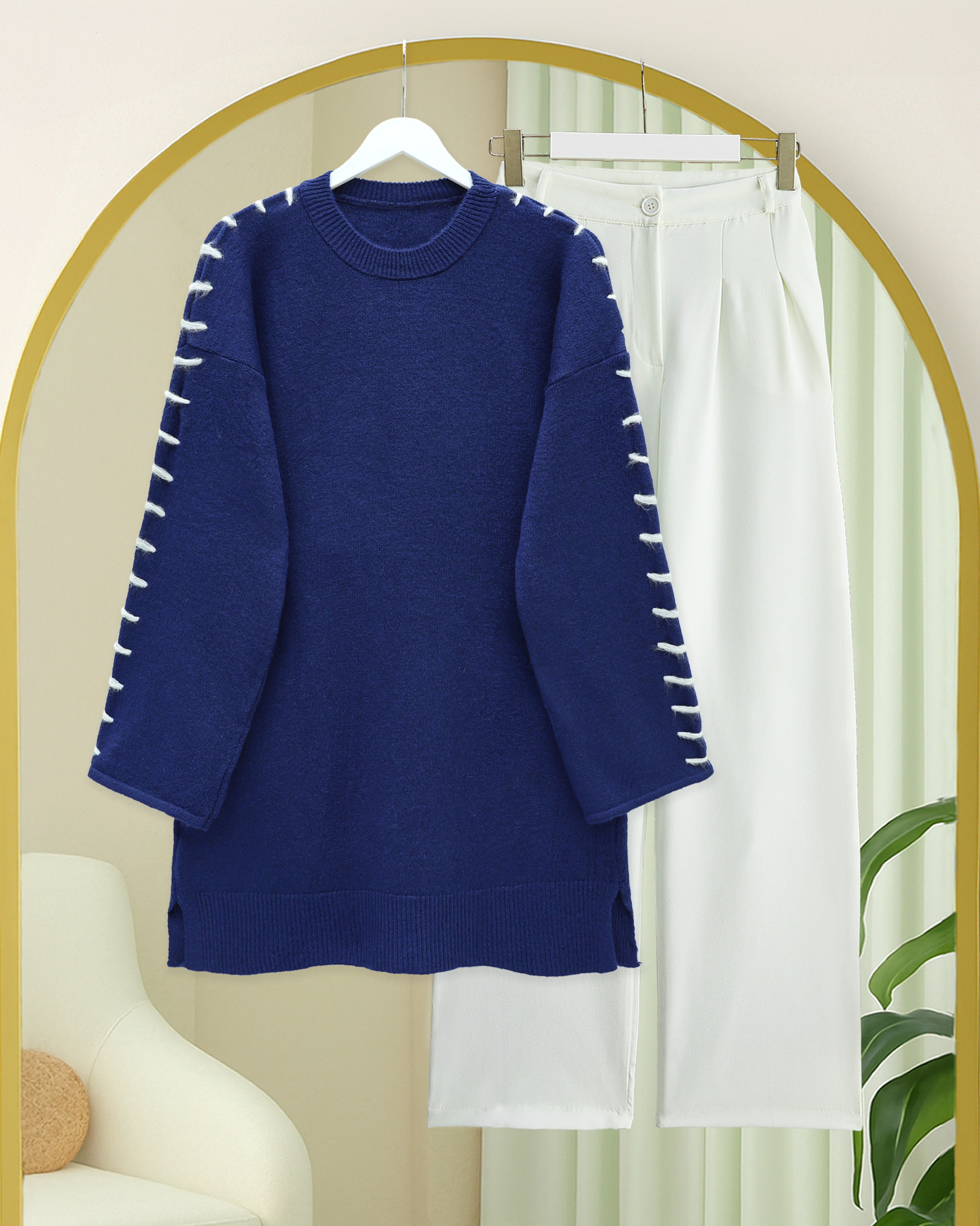 Kolları İpli Çizgili Yumoş Triko Tunik -Laci-Lacivert