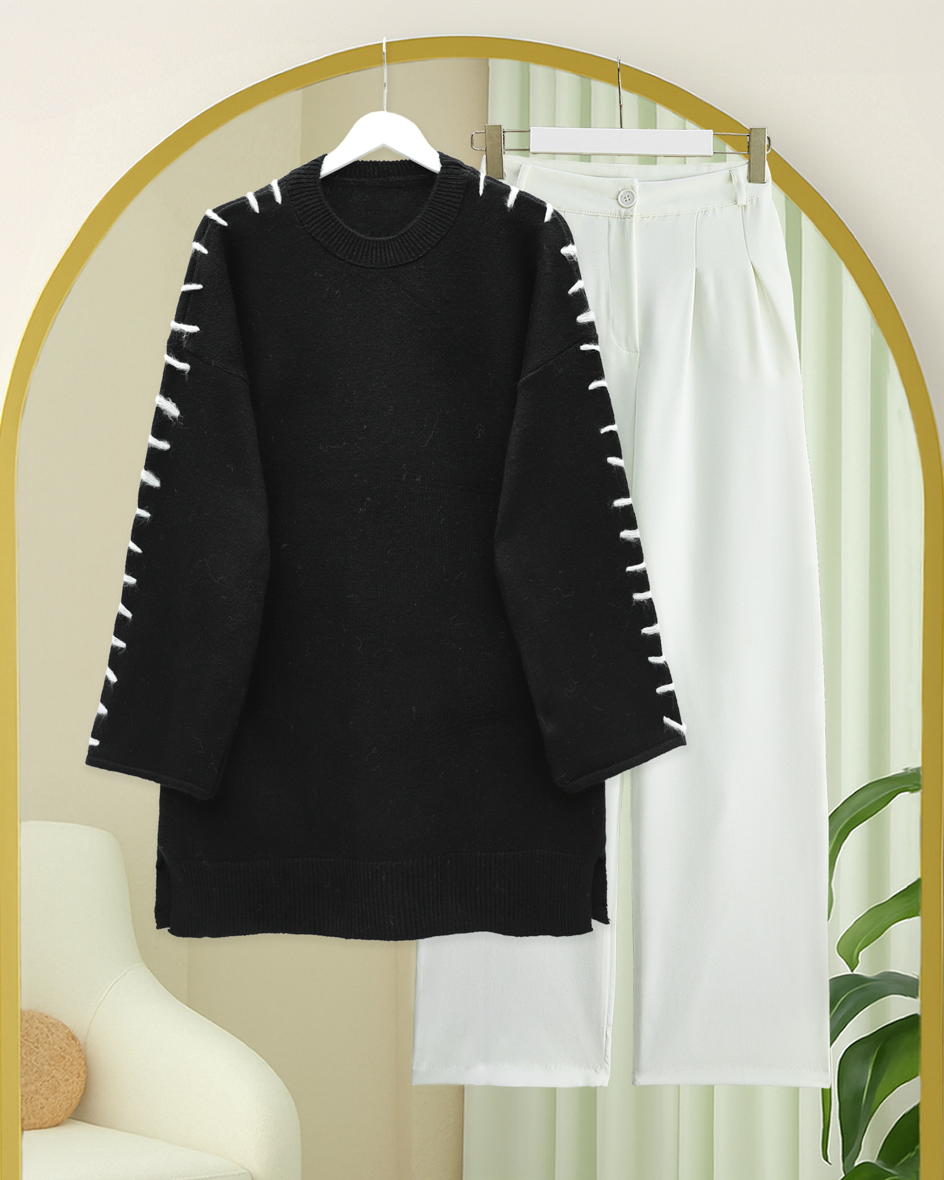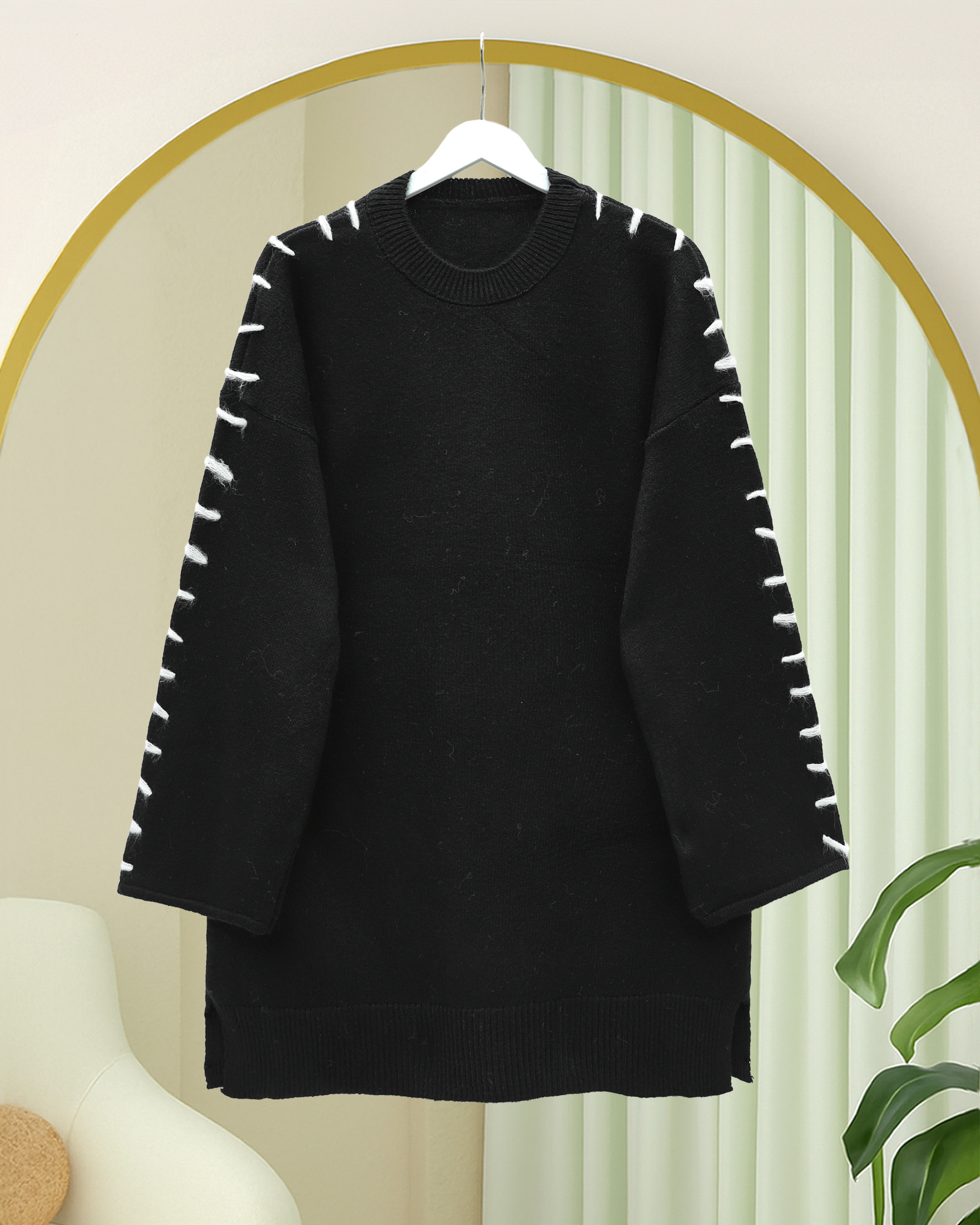 Kolları İpli Çizgili Yumoş Triko Tunik -Siyah-siyah