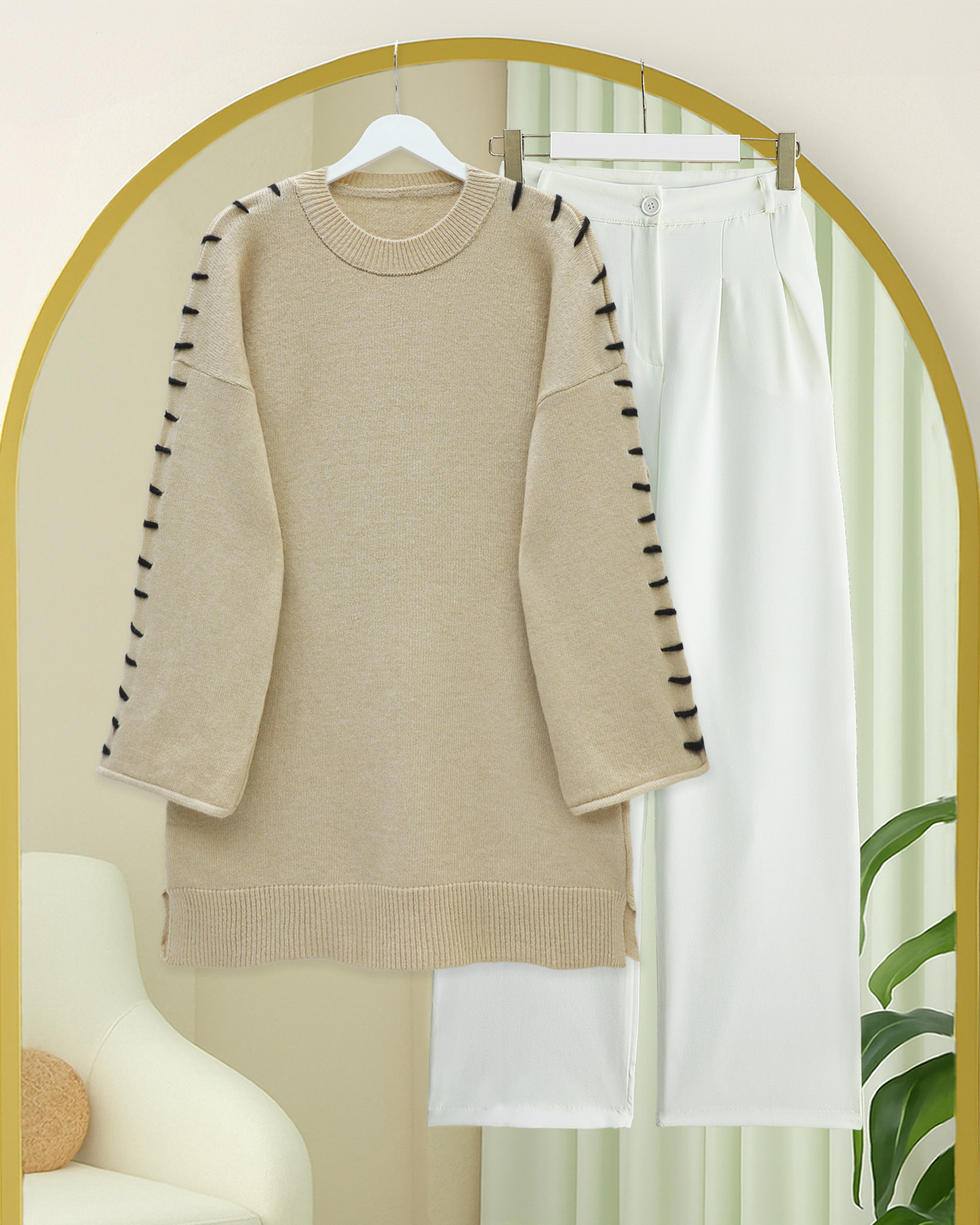 Kolları İpli Çizgili Yumoş Triko Tunik -Vizon-Vizon